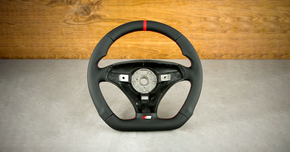 Bardzo wyraźny tuning kierownicy Audi TT 8N poprzez połączenie modyfikacji oraz obszycia. Kierownica obszyta skórą gładką Nappa oraz skórą perforowaną. Skóra gładka zapewnia bardzo przyjemny dotyk, jak i niezwykłą trwałość. Skóra perforowana nadaje komfort trzymania poprzez dziurki, które nie są wykonane na wylot a jedynie wytłoczone w skórze. Szew X-Performance jest niezwykle modny i często wybierany przez naszych klientów tym razem w kolorze soczystej czerwieni jak również pasek centrujący, elementy te dodają charakteru kierownicy jak i całemu wnętrzu samochodu.