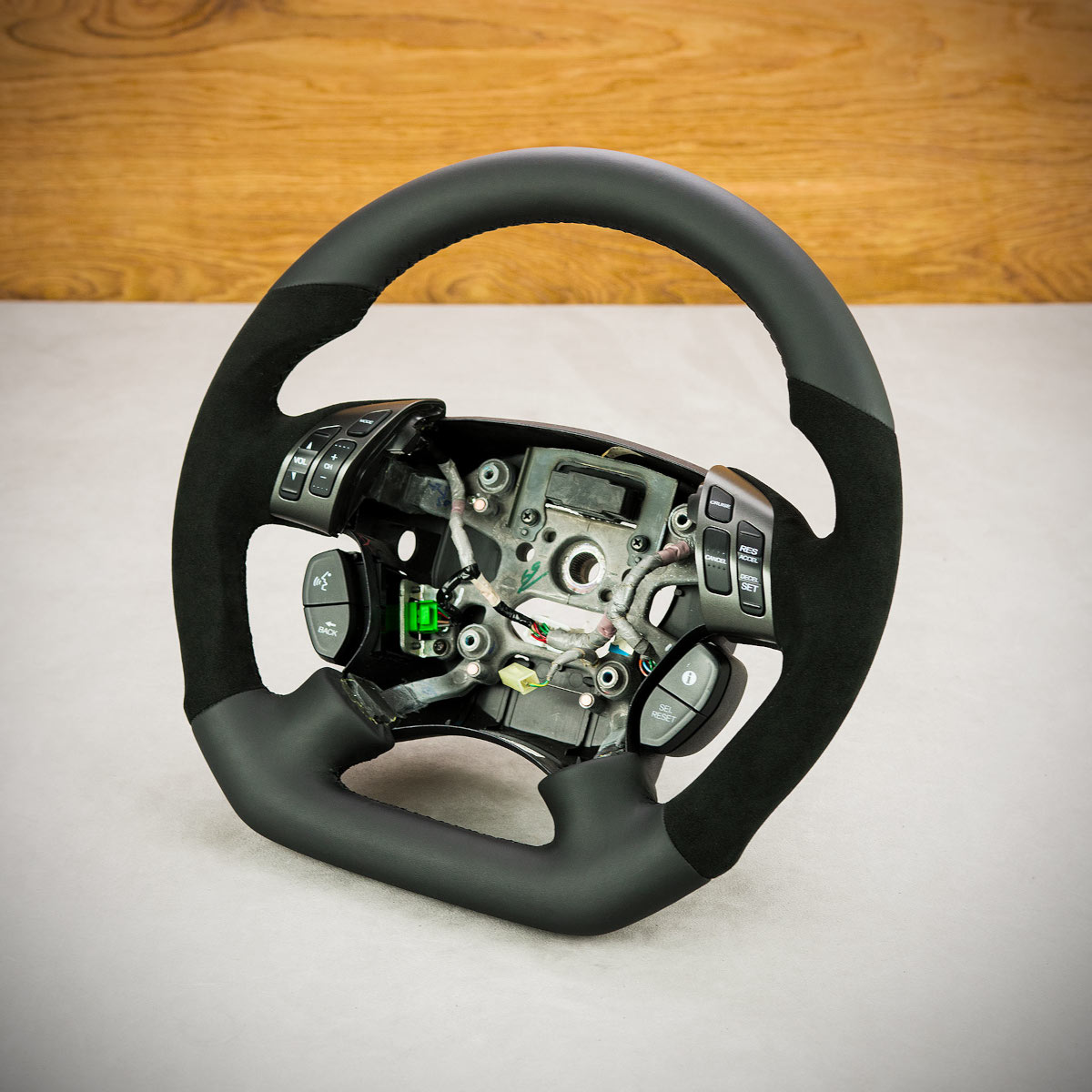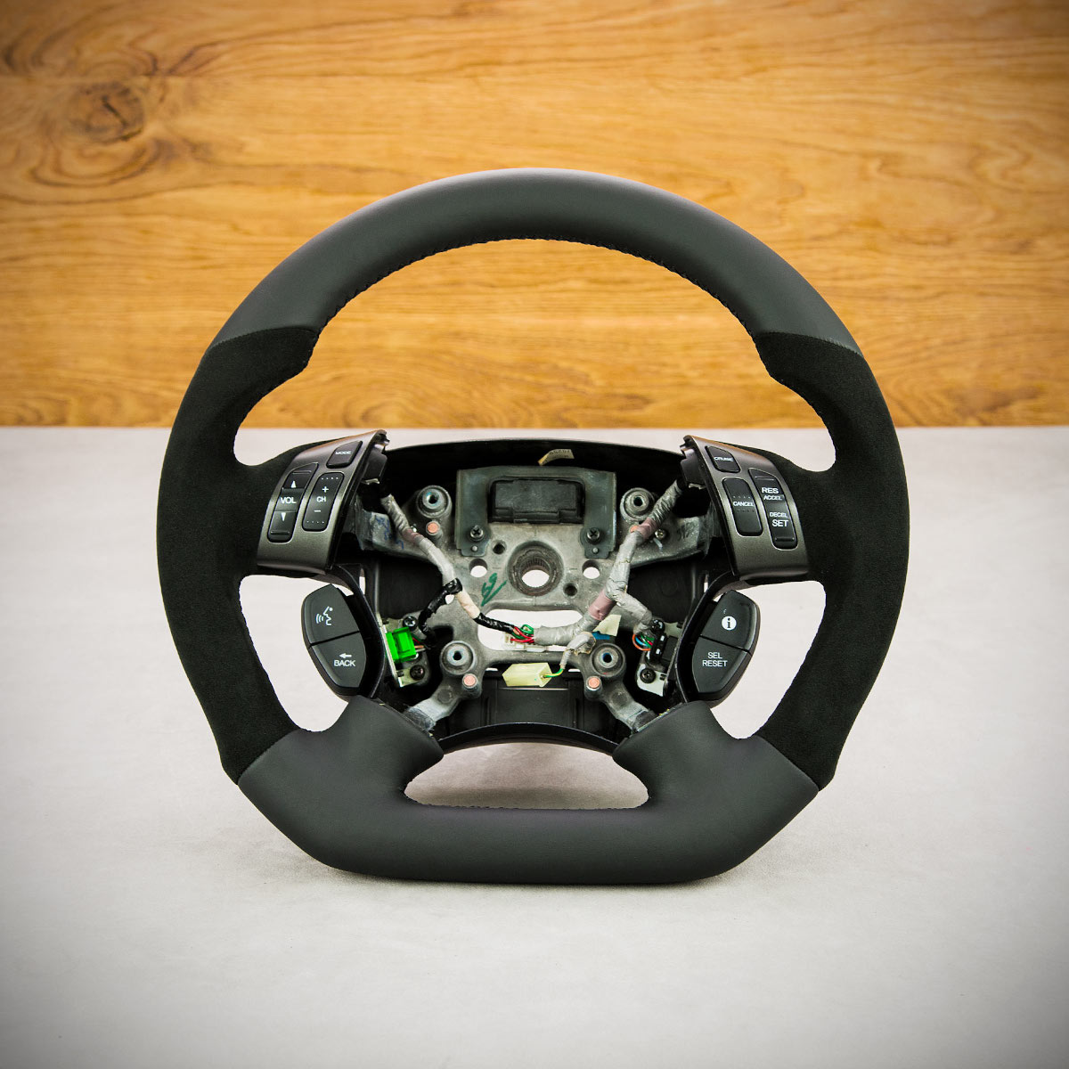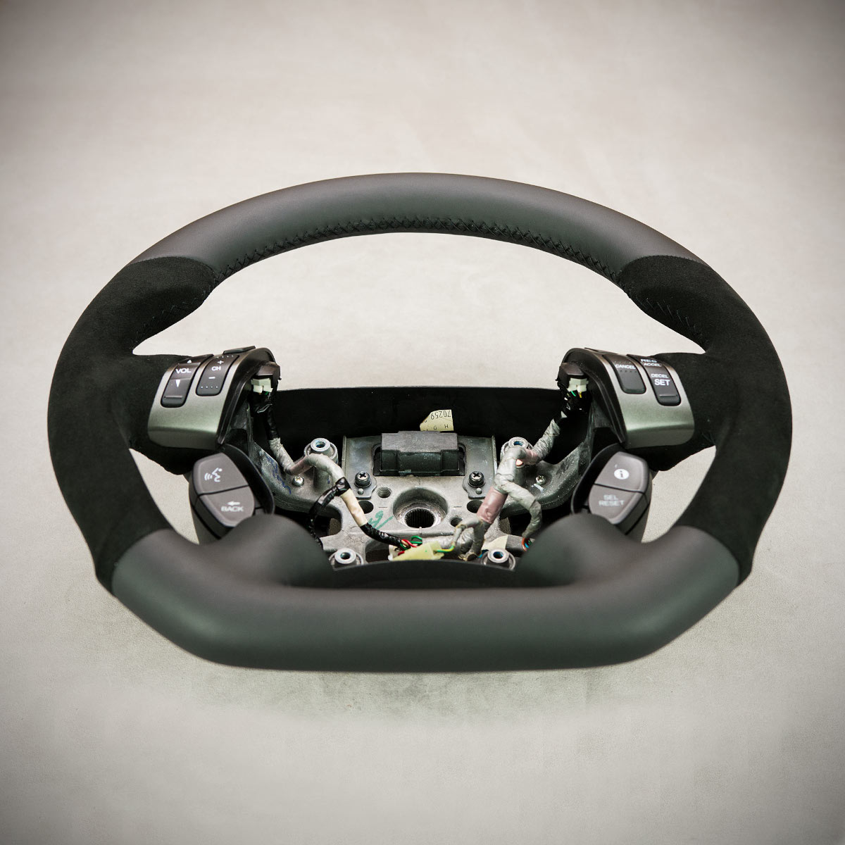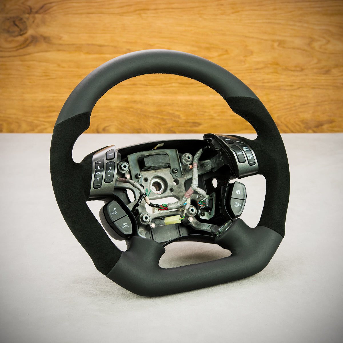 Bardzo wyraźny tuning kierownicy Honda Odyssey poprzez połączenie modyfikacji oraz obszycia. Kierownica obszyta skórą gładką oraz Alcantarą®, są to najwyższej jakości materiały stosowane na rynku motoryzacyjnym. Skóra gładka zapewnia bardzo przyjemny dotyk, jak i niezwykłą trwałość. Alcantara® jest oficjalnie dostosowana do obszywania kierownicy i często wybierana przez klientów, jest bardzo elegancka i efektowna.