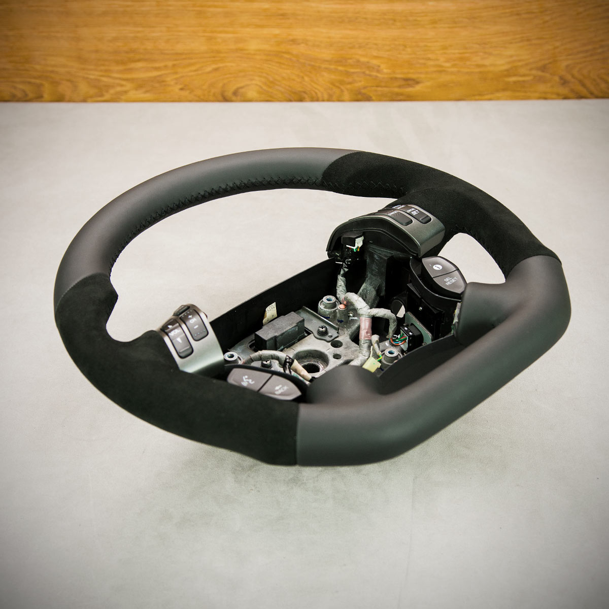 W swojej ofercie mamy szeroki wybór najwyższej jakości Alcantary®, skór dostępnych na rynku europejskim w różnych kolorach jak również dobrej jakości nici, także w bogatej gamie kolorystycznej. Praca przy obszyciu ma charakter tradycyjnego, ręcznego rzemiosła, wykonywana z mistrzowską precyzją. Zapewniamy, że kierownica będzie prezentować się profesjonalnie a także będzie wygodna i praktyczna w użytkowaniu.