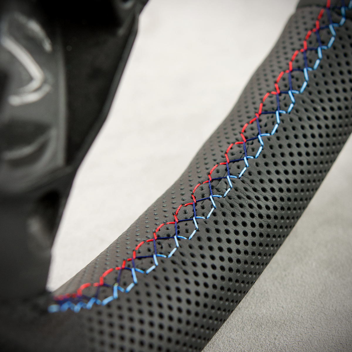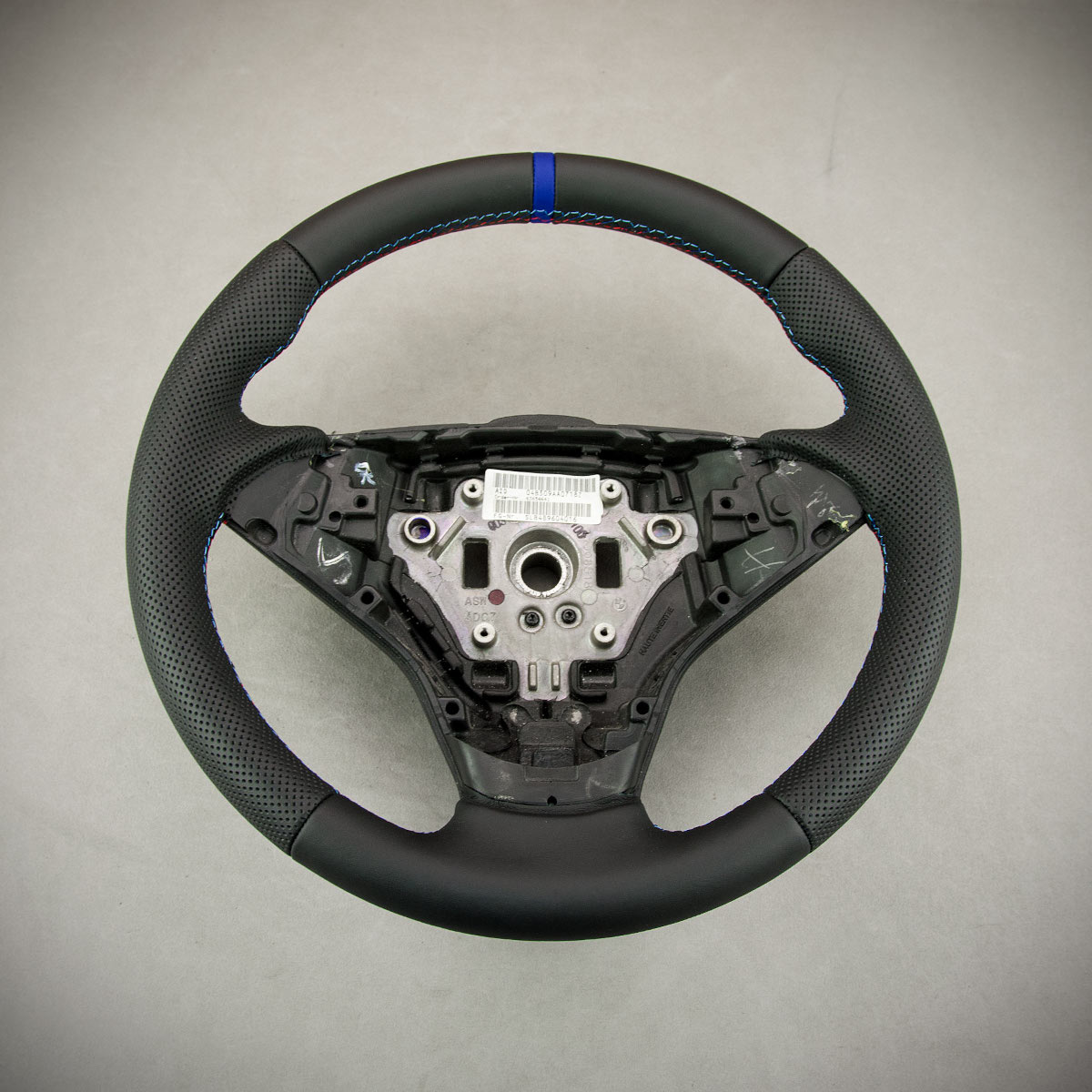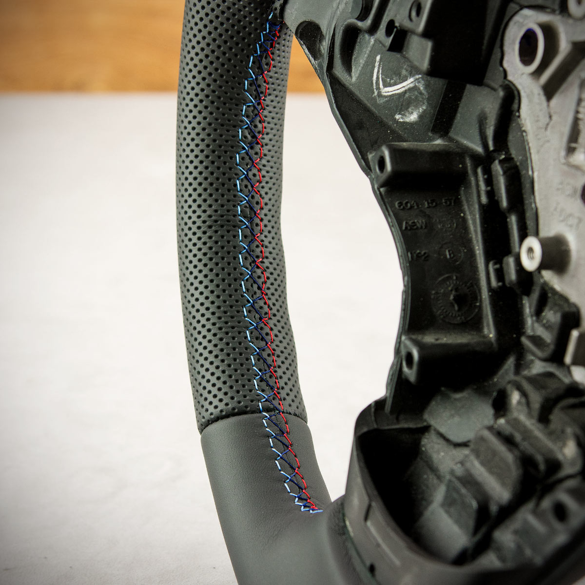 Tuning kierownicy BMW E60 nadał jej nowego wyglądu. Kierownica została obszyta skórą gładką Nappa oraz perforowaną. Są to skóry najlepszego gatunku dostępne na rynku europejskim. Skóra gładka zapewnia bardzo przyjemny dotyk, jak i niezwykłą trwałość. Skóra perforowana jest zalecana na boki kierownicy. Perforacja poprawia chwytność oraz zmniejsza potliwość dłoni. Szew seryjny jest najczęściej wybieranym szwem przez naszych klientów, tym razem w kolorach bmw m pakiet oraz paskiem centrującym wygląda sportowo i nowocześnie.