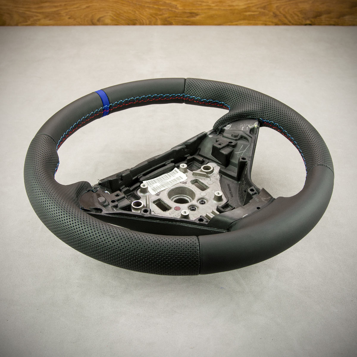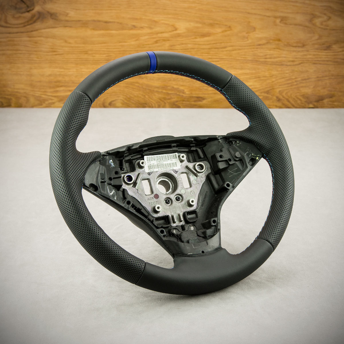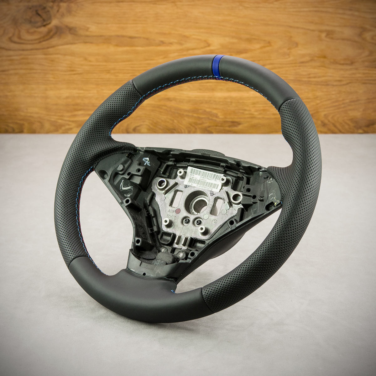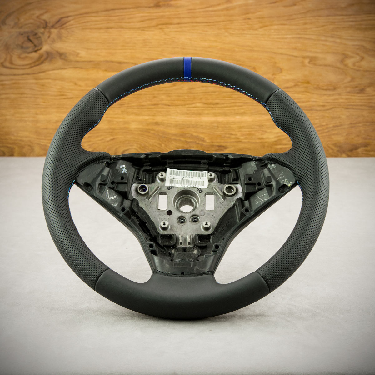 Tuning kierownicy BMW E60 nadał jej nowego wyglądu. Kierownica została obszyta skórą gładką Nappa oraz perforowaną. Są to skóry najlepszego gatunku dostępne na rynku europejskim. Skóra gładka zapewnia bardzo przyjemny dotyk, jak i niezwykłą trwałość. Skóra perforowana jest zalecana na boki kierownicy. Perforacja poprawia chwytność oraz zmniejsza potliwość dłoni. Szew seryjny jest najczęściej wybieranym szwem przez naszych klientów, tym razem w kolorach bmw m pakiet oraz paskiem centrującym wygląda sportowo i nowocześnie.
