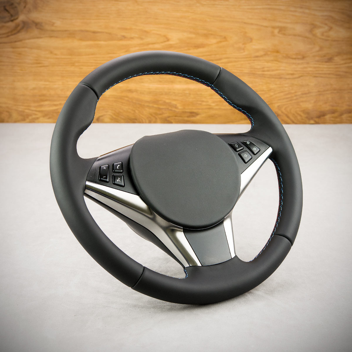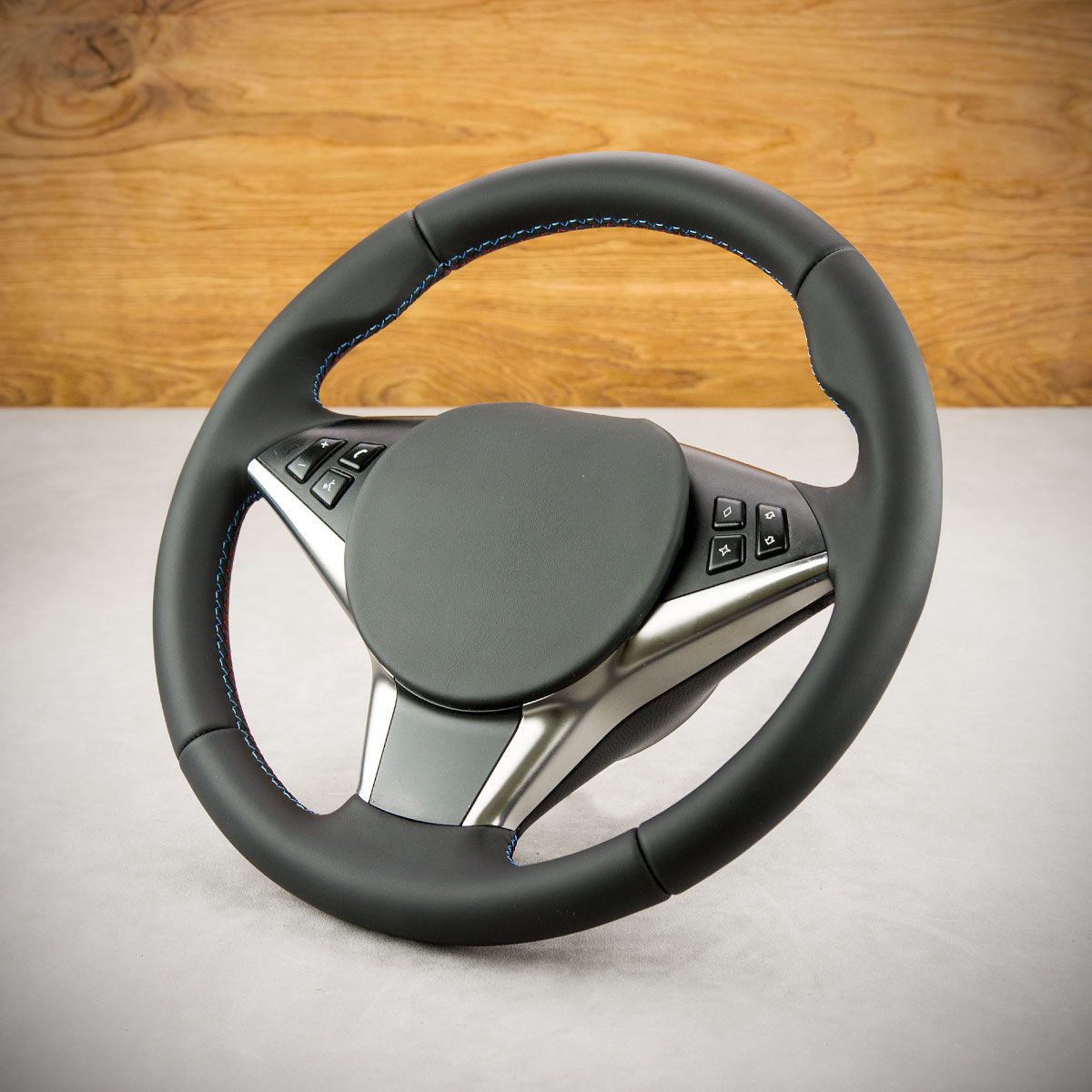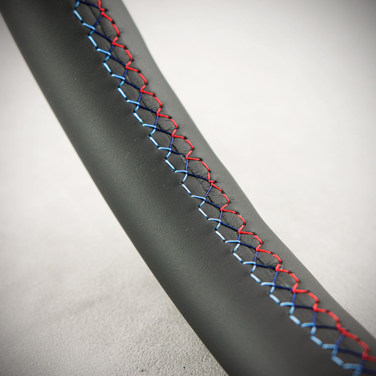 Tuning kierownicy BMW E60 nadał jej zupełnie nowego wyglądu. Kierownica w całości została na nowo obszyta skórą gładką Nappa. Jest to jedna z najwyższej jakości skór z dostępnych na rynku europejskim. Ten szlachetny materiał zastosowany na kierownicy zapewnia przyjemny dotyk, jak i niezwykłą trwałość. Zastosowany szew seryjny jest najpopularniejszym szwem na rynku motoryzacyjnym tym razem w kolorach BMW m pakiet.