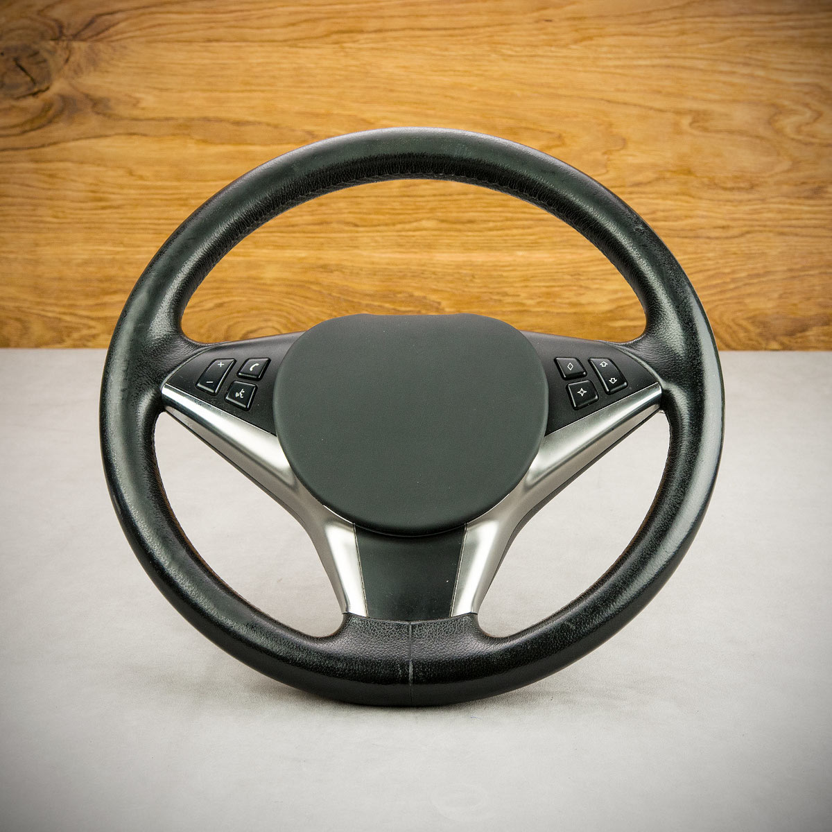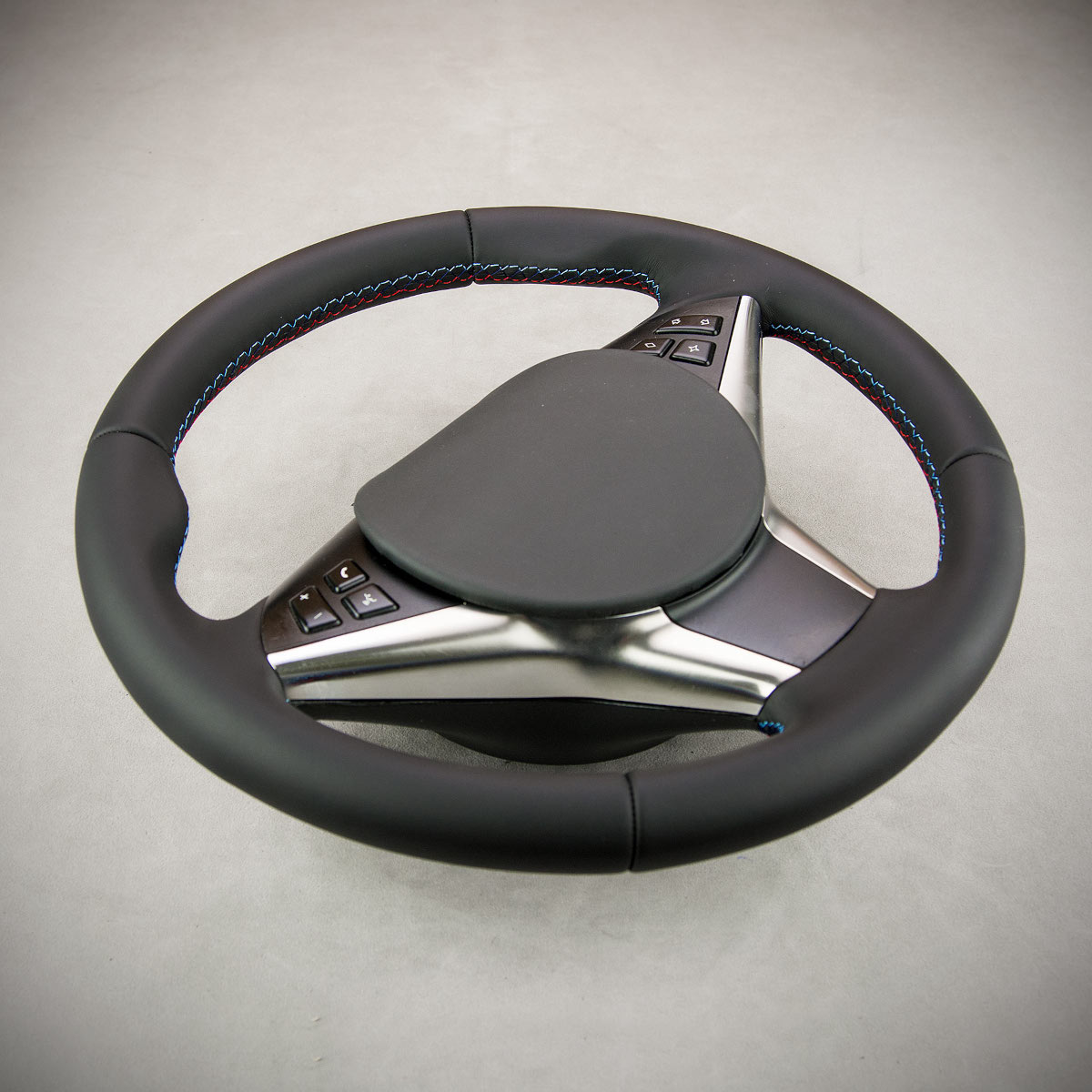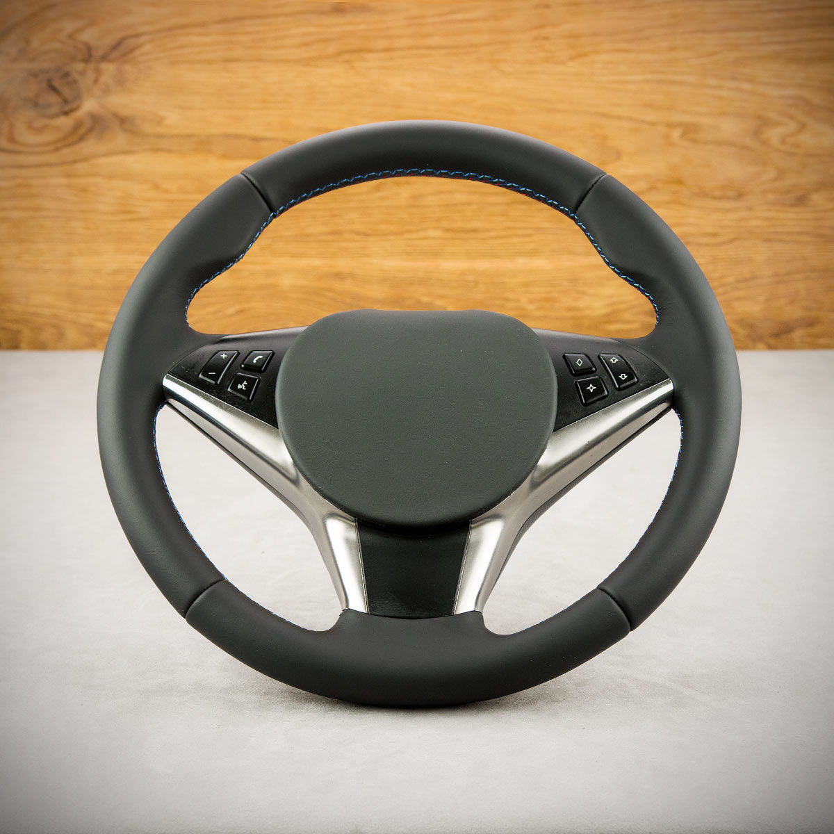 Tuning kierownicy BMW E60 nadał jej zupełnie nowego wyglądu. Kierownica w całości została na nowo obszyta skórą gładką Nappa. Jest to jedna z najwyższej jakości skór z dostępnych na rynku europejskim. Ten szlachetny materiał zastosowany na kierownicy zapewnia przyjemny dotyk, jak i niezwykłą trwałość. Zastosowany szew seryjny jest najpopularniejszym szwem na rynku motoryzacyjnym tym razem w kolorach BMW m pakiet.