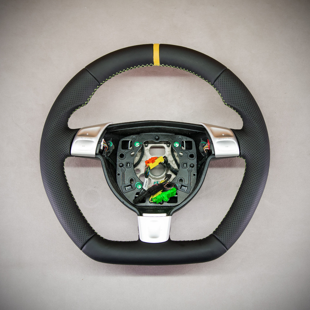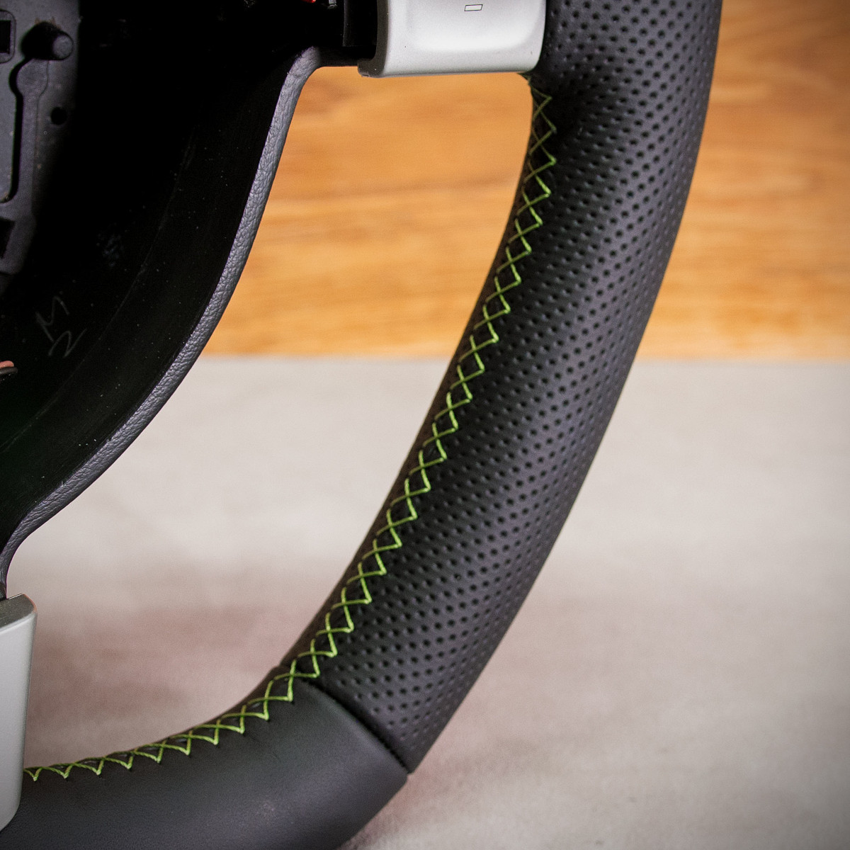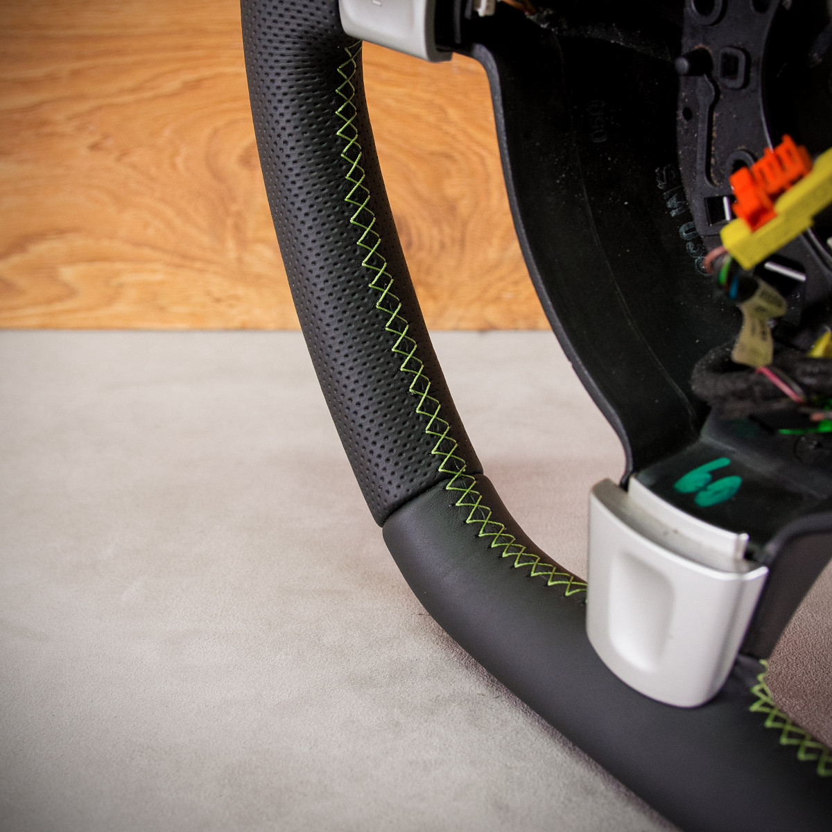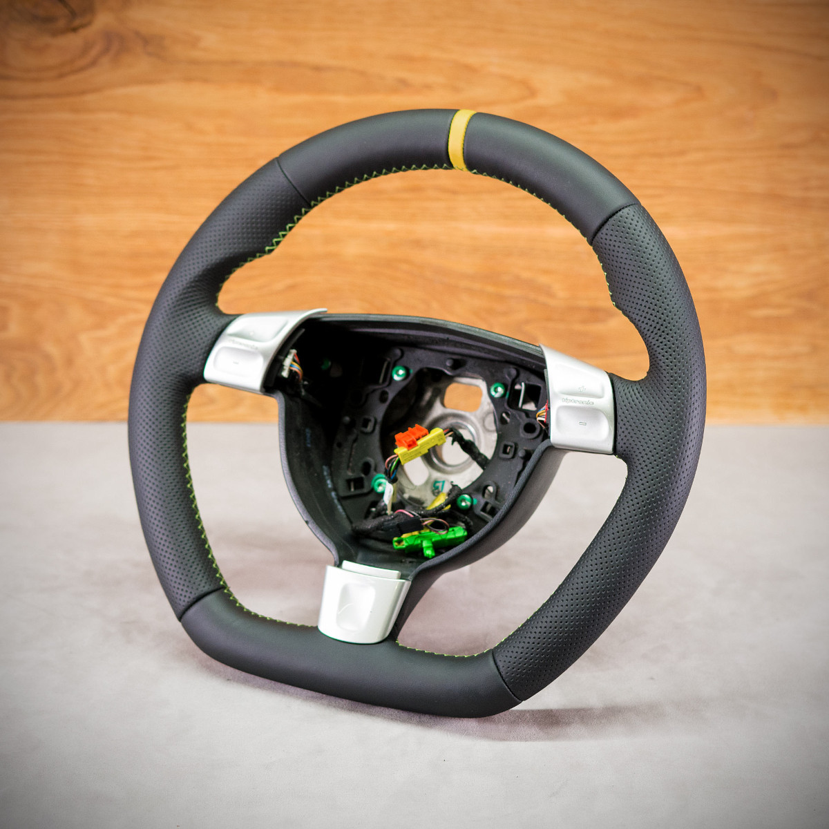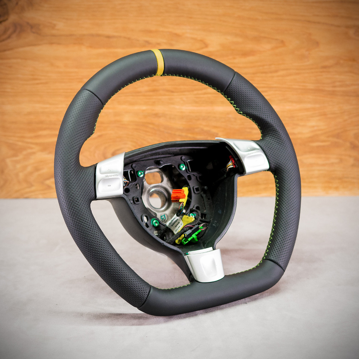 Bardzo wyraźny tuning kierownicy Porsche 911 poprzez połączenie modyfikacji oraz obszycia. Kierownica obszyta skórą gładką oraz perforowaną. Są to skóry najlepszego gatunku dostępne na rynku europejskim. Skóra gładka zapewnia bardzo przyjemny dotyk, jak i niezwykłą trwałość. Skóra perforowana zalecana jest na boki kierownicy. Perforacja, czyli dziurki, nie są wykonane na wylot a jedynie wytłoczone w skórze. To nadaje komfort trzymania. Zastosowany szew performance jest uznawany za jeden z najpiękniejszych szwów, którym można ozdobić kierownicę. Dodatkowo do tego szwu stosuje się grubszą nić. Oprócz szwu w tej realizacji pojawił się pasek centrujący, który dodaje charakteru.