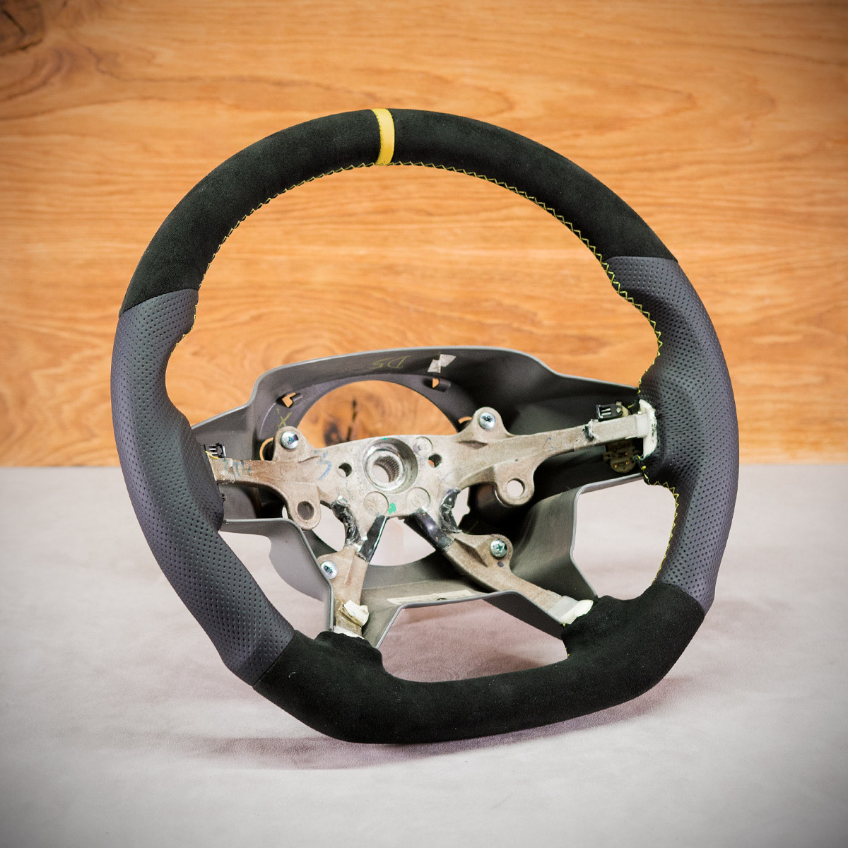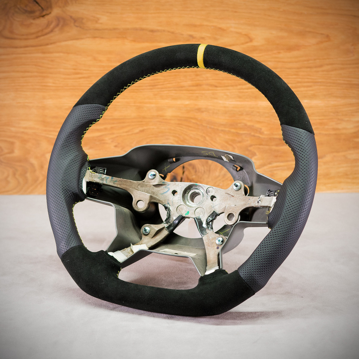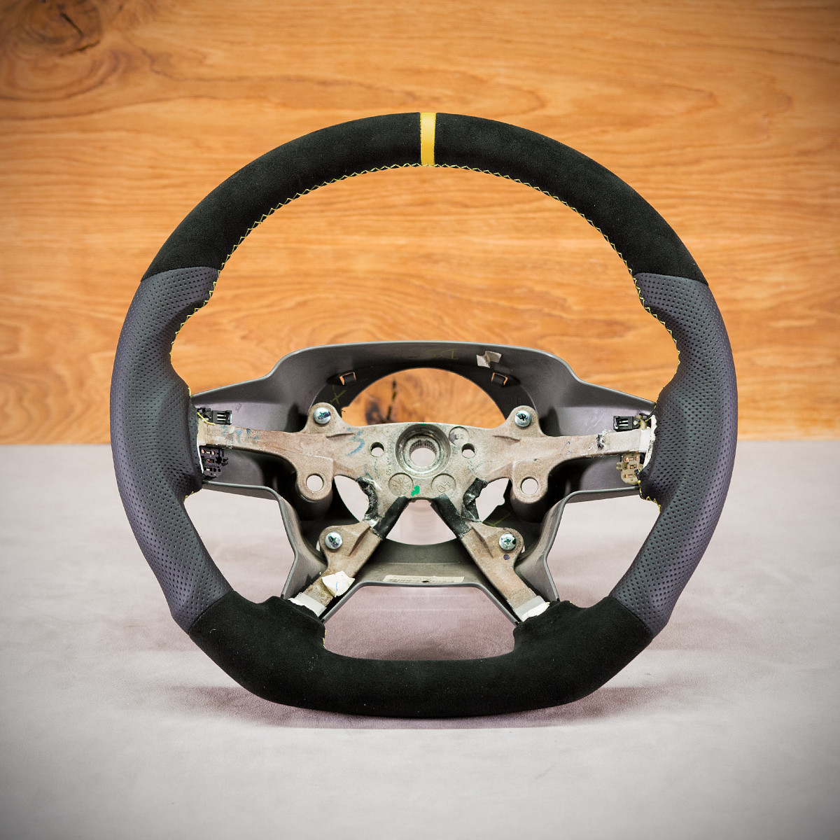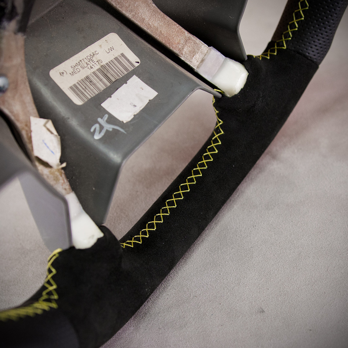 Bardzo wyraźny tuning kierownicy Jeep Grand Cherokee poprzez połączenie modyfikacji oraz obszycia. Kierownica obszyta Alcantarą® oraz skórą perforowaną. Są to materiały najlepszego gatunku stosowane na rynku motoryzacyjnym. Alcantara jest bardzo modna oraz elegancka. Perforowana skóra zalecana jest na boki. Perforacja, czyli dziurki, nie są wykonane na wylot a jedynie wytłoczone w skórze. To nadaje komfort trzymania.