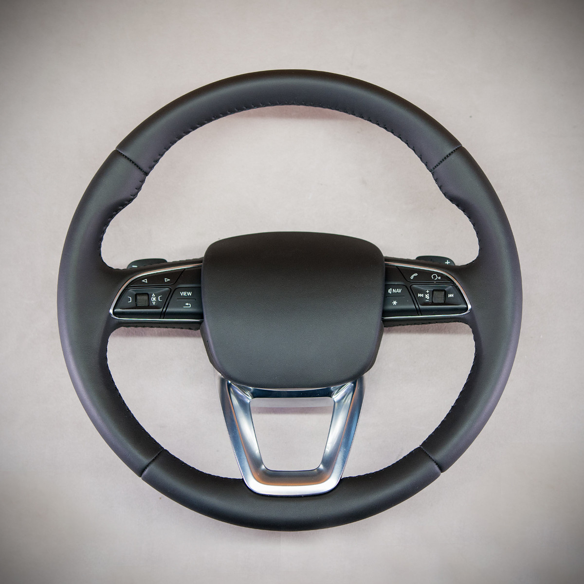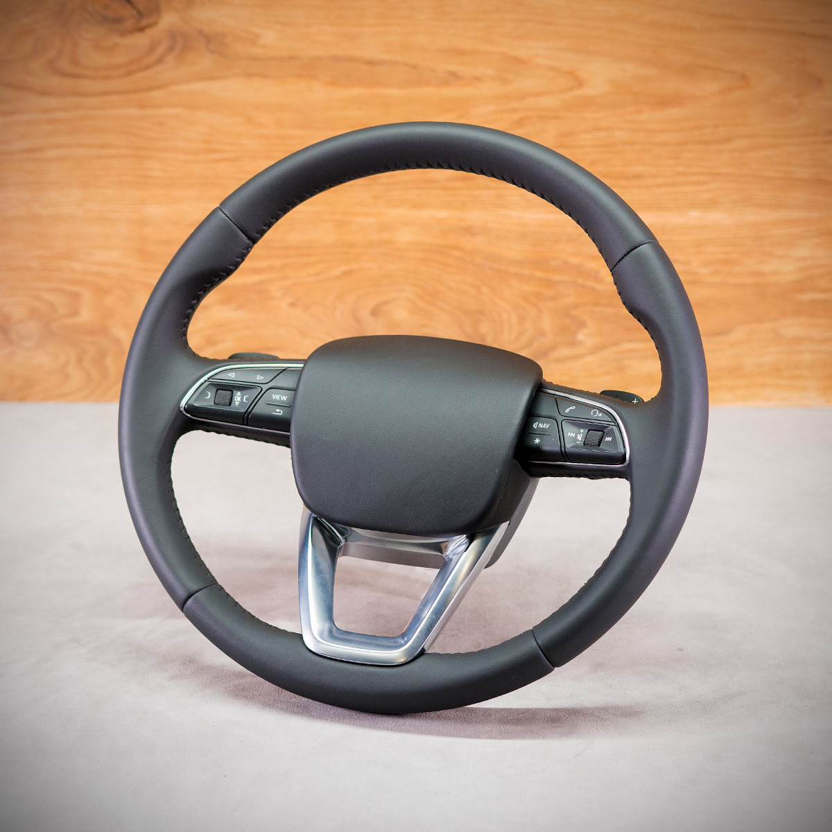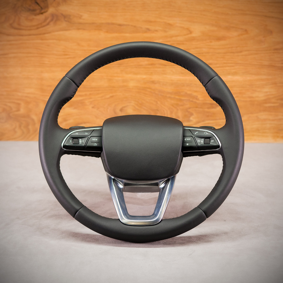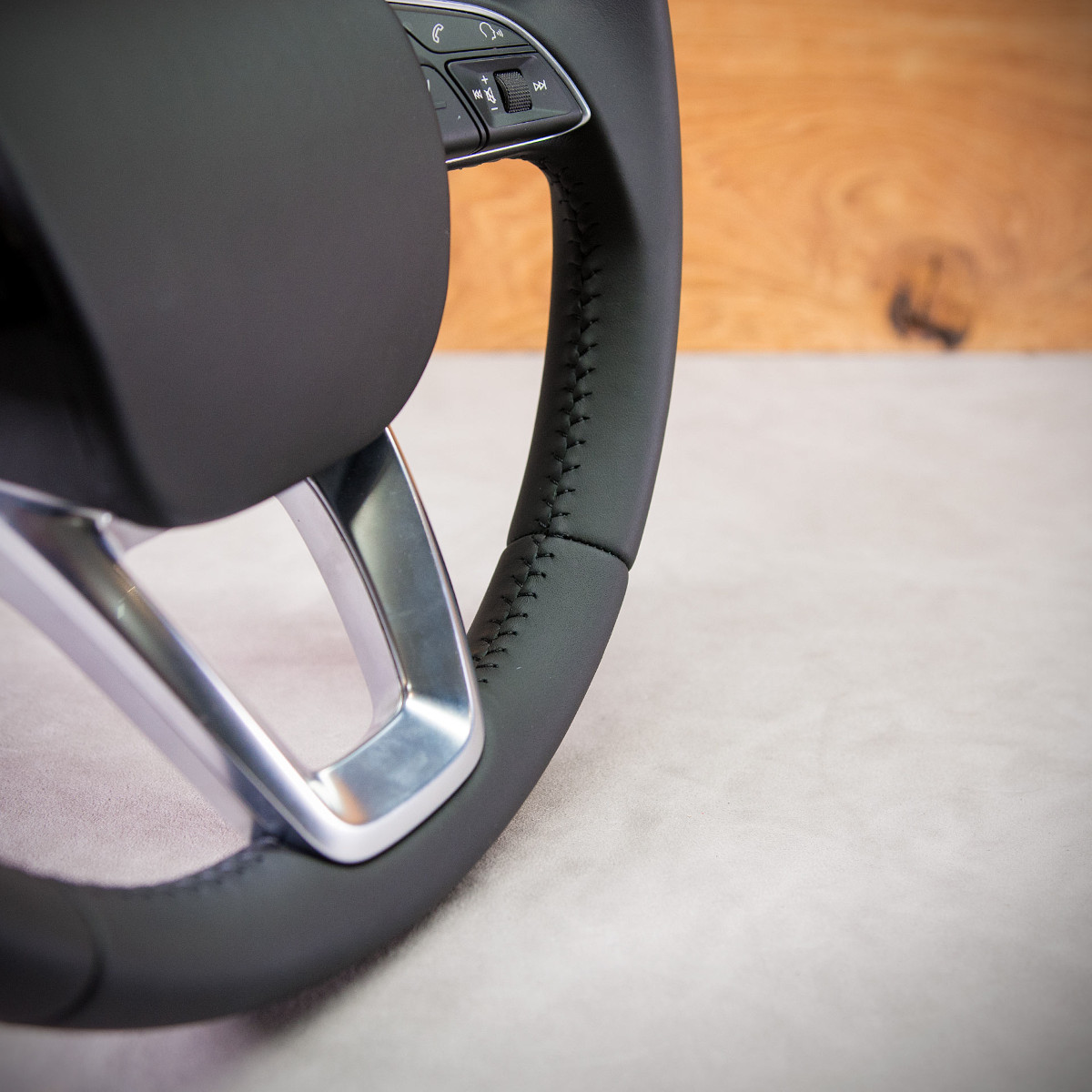 Kierownica Audi Q7 nabrała zupełnie świeżego wyglądu, w całości została na nowo obszyta skórą gładką Napa. Jest to jedna z najwyższej jakości skór na rynku europejskim, zapewnia zarówno bardzo przyjemny dotyk, jak również jest wytrzymała. Szew jodełka – obecnie widać ten szew na kierownicach samochodów marki Audi. Szew ten jest mocniejszy niż szew seryjny (999.0). Wykonuje się go w jednym wybranym kolorze.