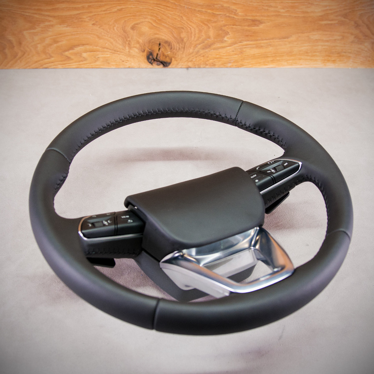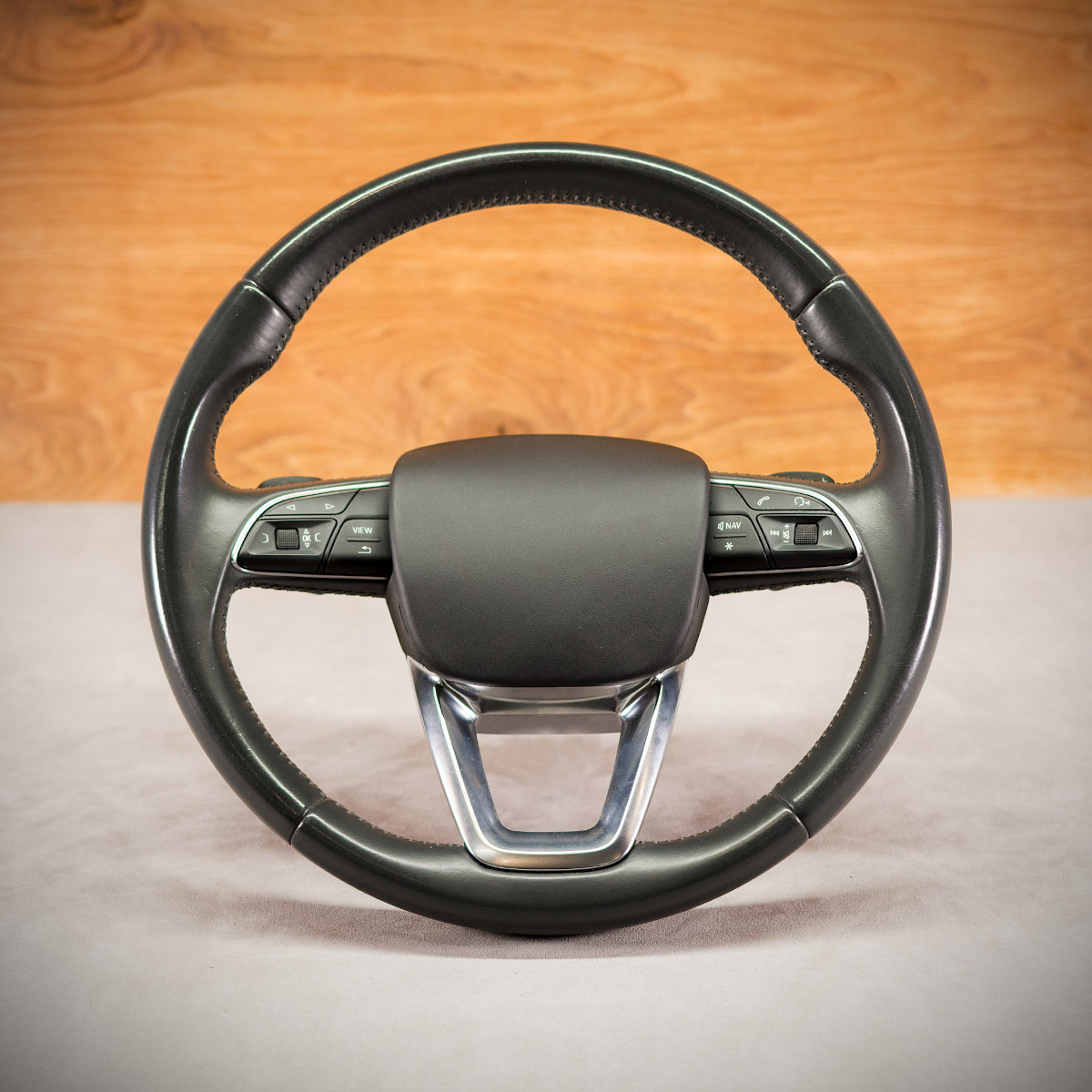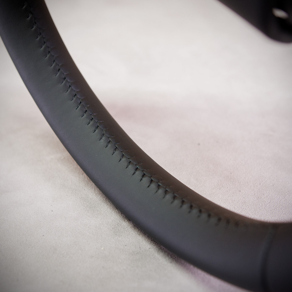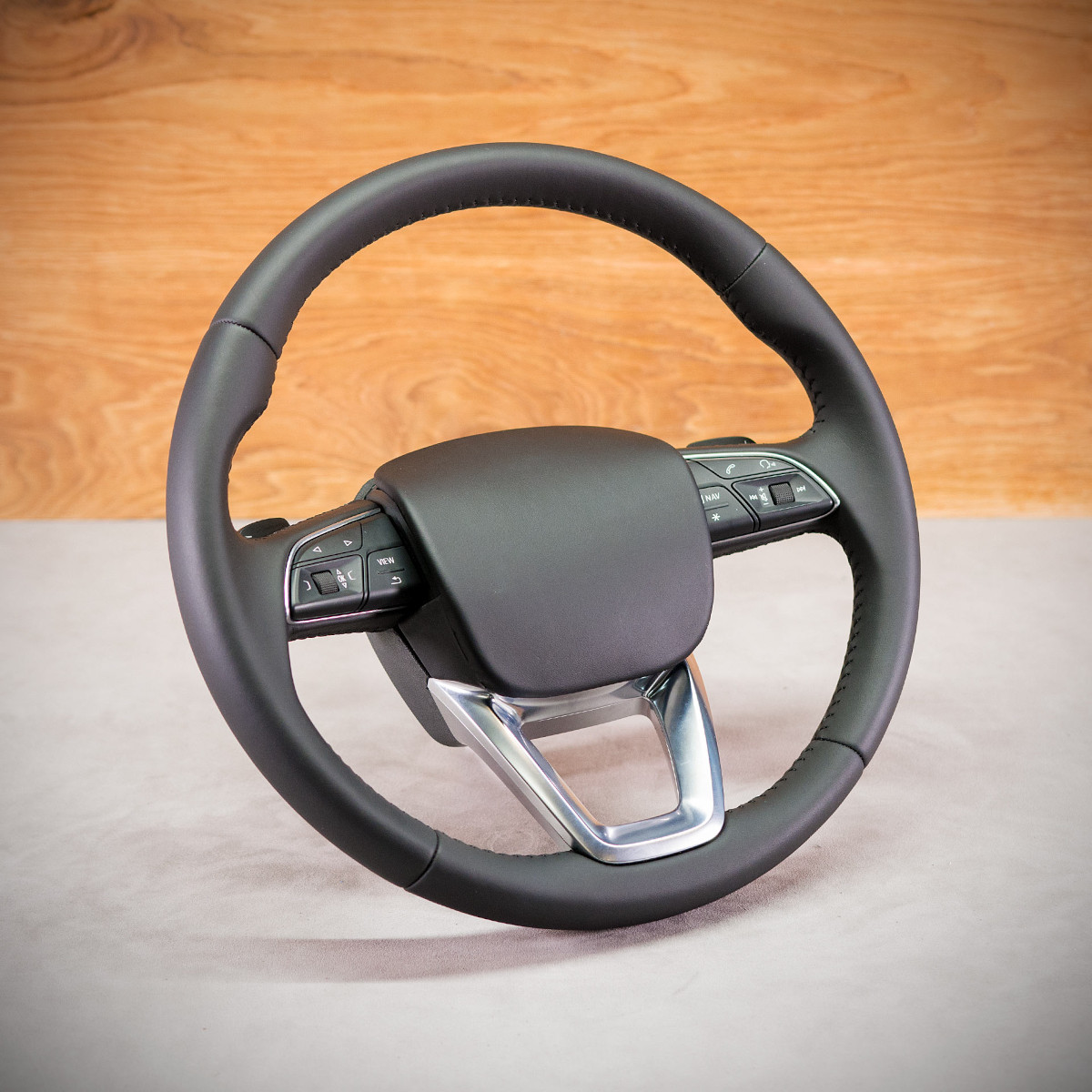 Kierownica Audi Q7 nabrała zupełnie świeżego wyglądu, w całości została na nowo obszyta skórą gładką Napa. Jest to jedna z najwyższej jakości skór na rynku europejskim, zapewnia zarówno bardzo przyjemny dotyk, jak również jest wytrzymała. Szew jodełka – obecnie widać ten szew na kierownicach samochodów marki Audi. Szew ten jest mocniejszy niż szew seryjny (999.0). Wykonuje się go w jednym wybranym kolorze.