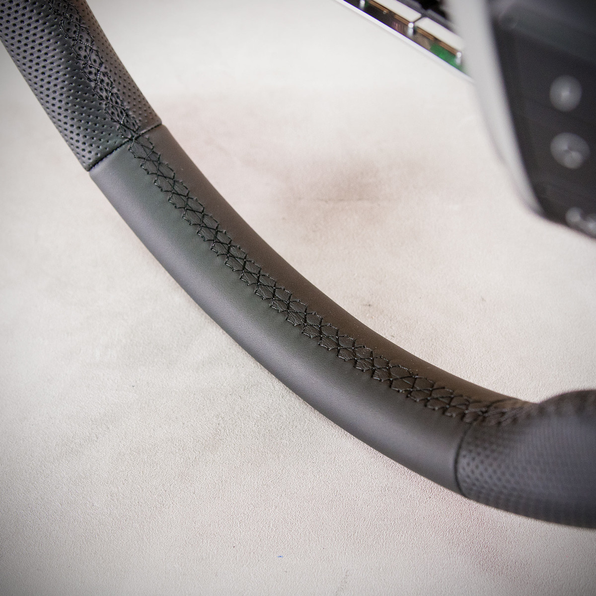 Kierownica Volvo S60 została na nowo obszyta skórą gładką oraz perforowaną. Są to skóry najlepszego gatunku dostępne na rynku europejskim. Skóra gładka zapewnia bardzo przyjemny dotyk, jak i niezwykłą trwałość. Skóra perforowana zalecana jest na boki kierownicy. Perforacja, czyli dziurki, nie są wykonane na wylot a jedynie wytłoczone w skórze. To nadaje komfort trzymania. Zastosowany szew seryjny jest najpopularniejszym szwem na rynku motoryzacyjnym.