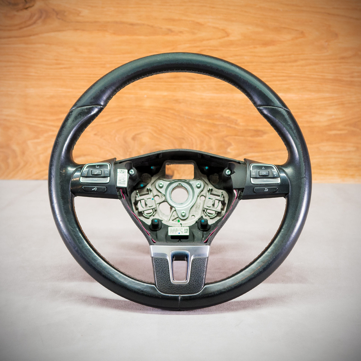 Kierownica Volkswagen Transporter T6 nie została poddana żadnej modyfikacji tylko obszyta na nowo. Obszyta skórą gładką oraz perforowaną. Są to najlepszej jakości skóry dostępne na rynku europejskim. Skóra gładka zapewnia komfortowy dotyk, skóra perforowana zmniejsza potliwość dłoni. Perforacja, czyli dziurki, nie są wykonane na wylot a jedynie wytłoczone w skórze. Szew seryjny jest najczęściej stosowany na rynku motoryzacyjnym.
