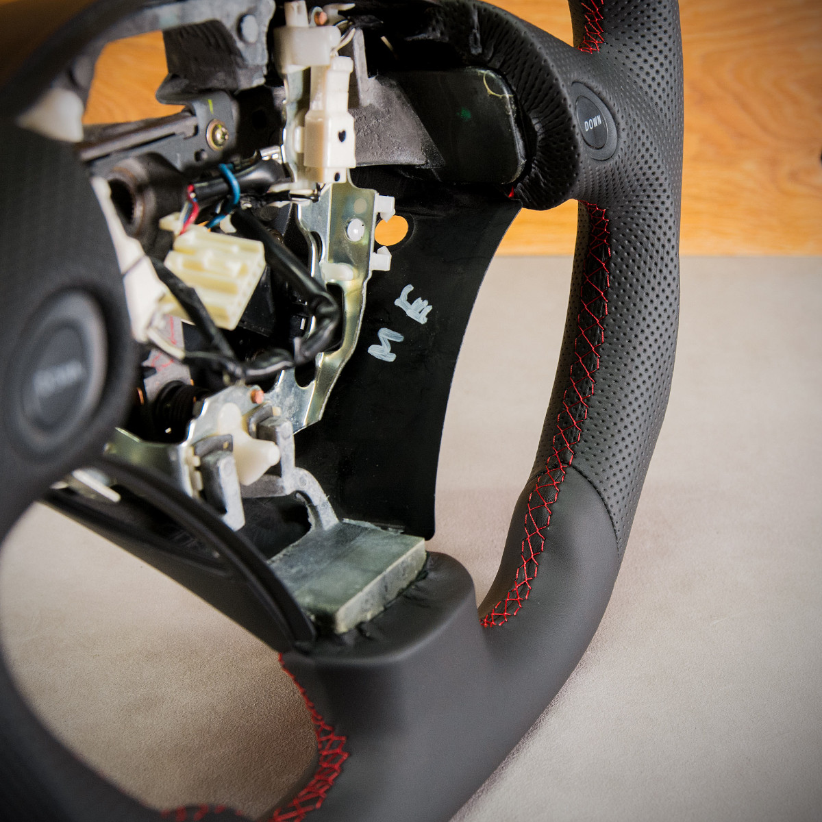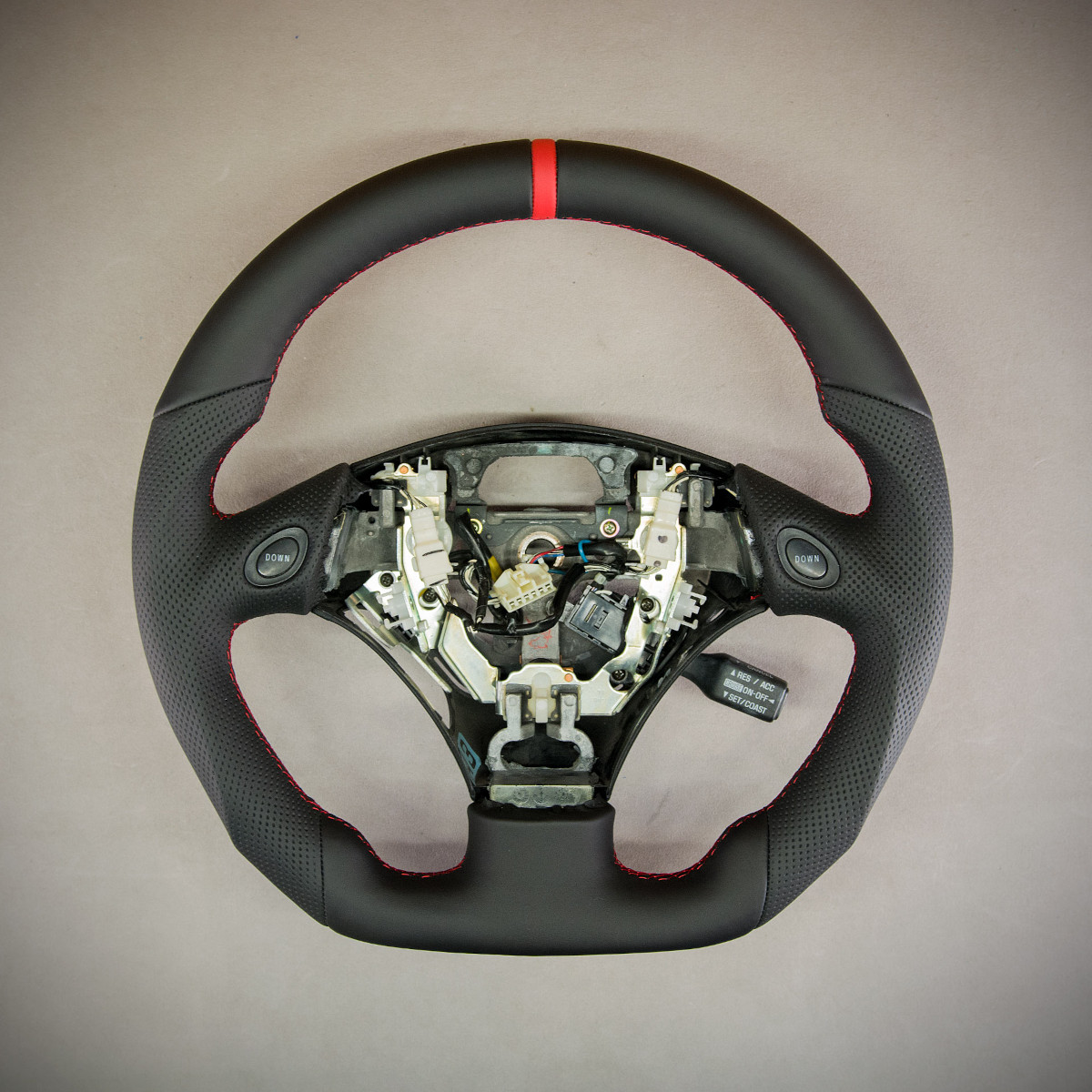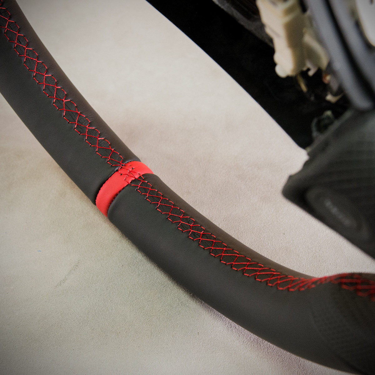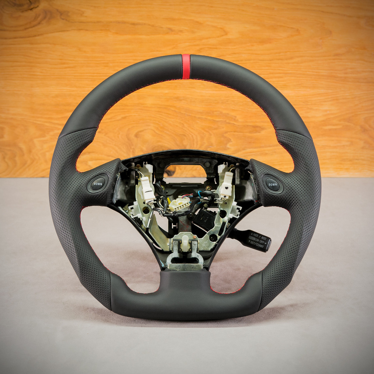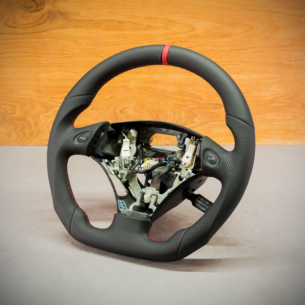 Bardzo wyraźny tuning kierownicy Lexus GS II poprzez połączenie modyfikacji oraz obszycia. Kierownica obszyta skórą gładką oraz perforowaną. Są to skóry najlepszego gatunku dostępne na rynku europejskim. Skóra gładka zapewnia bardzo przyjemny dotyk, jak i niezwykłą trwałość. Skóra perforowana zalecana jest na boki kierownicy. Perforacja, czyli dziurki, nie są wykonane na wylot a jedynie wytłoczone w skórze. To nadaje komfort trzymania. Szew seryjny oraz pasek centrujący to akcenty kolorystyczne, które dodają charakteru.