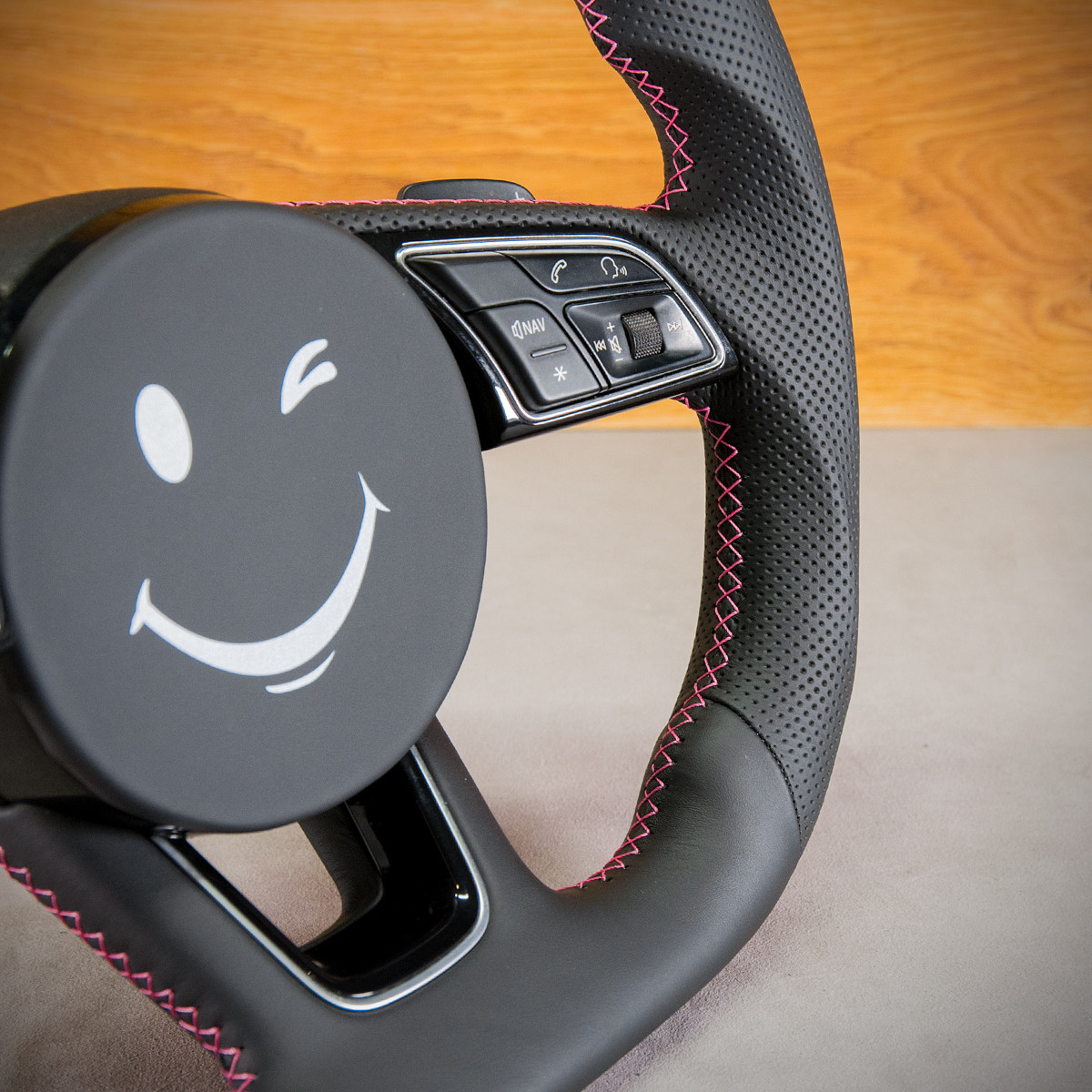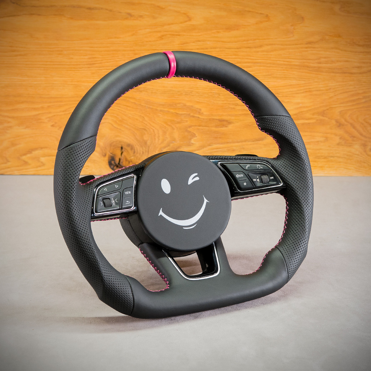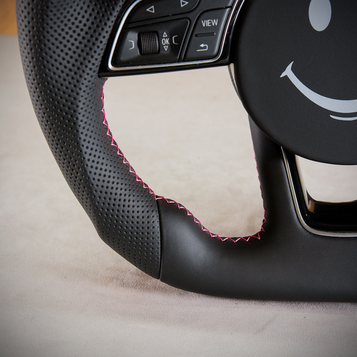 Bardzo wyraźny tuning kierownicy Audi A3 8V poprzez połączenie modyfikacji oraz obszycia. Kierownica obszyta skórą gładką oraz perforowaną. Są to skóry najlepszego gatunku dostępne na rynku europejskim. Skóra gładka zapewnia bardzo przyjemny dotyk, jak i niezwykłą trwałość. Skóra perforowana zalecana jest na boki kierownicy. Perforacja, czyli dziurki, nie są wykonane na wylot a jedynie wytłoczone w skórze. To nadaje komfort trzymania. Zastosowany szew performance jest uznawany za jeden z najpiękniejszych szwów, którym można ozdobić kierownicę. Dodatkowo do tego szwu stosuje się grubszą nić.