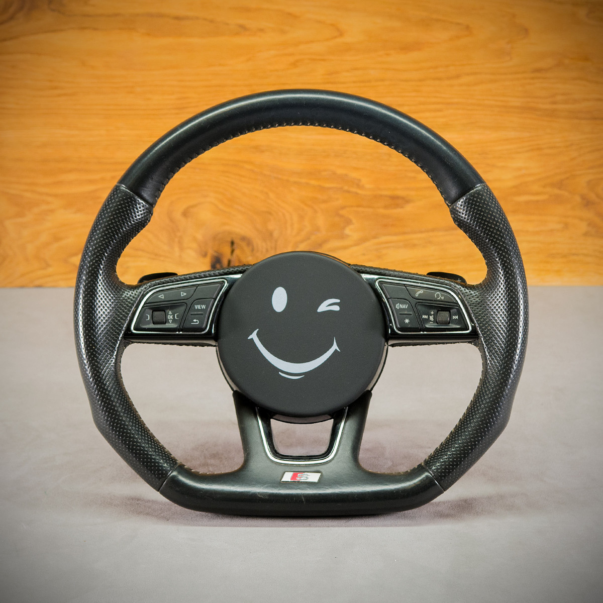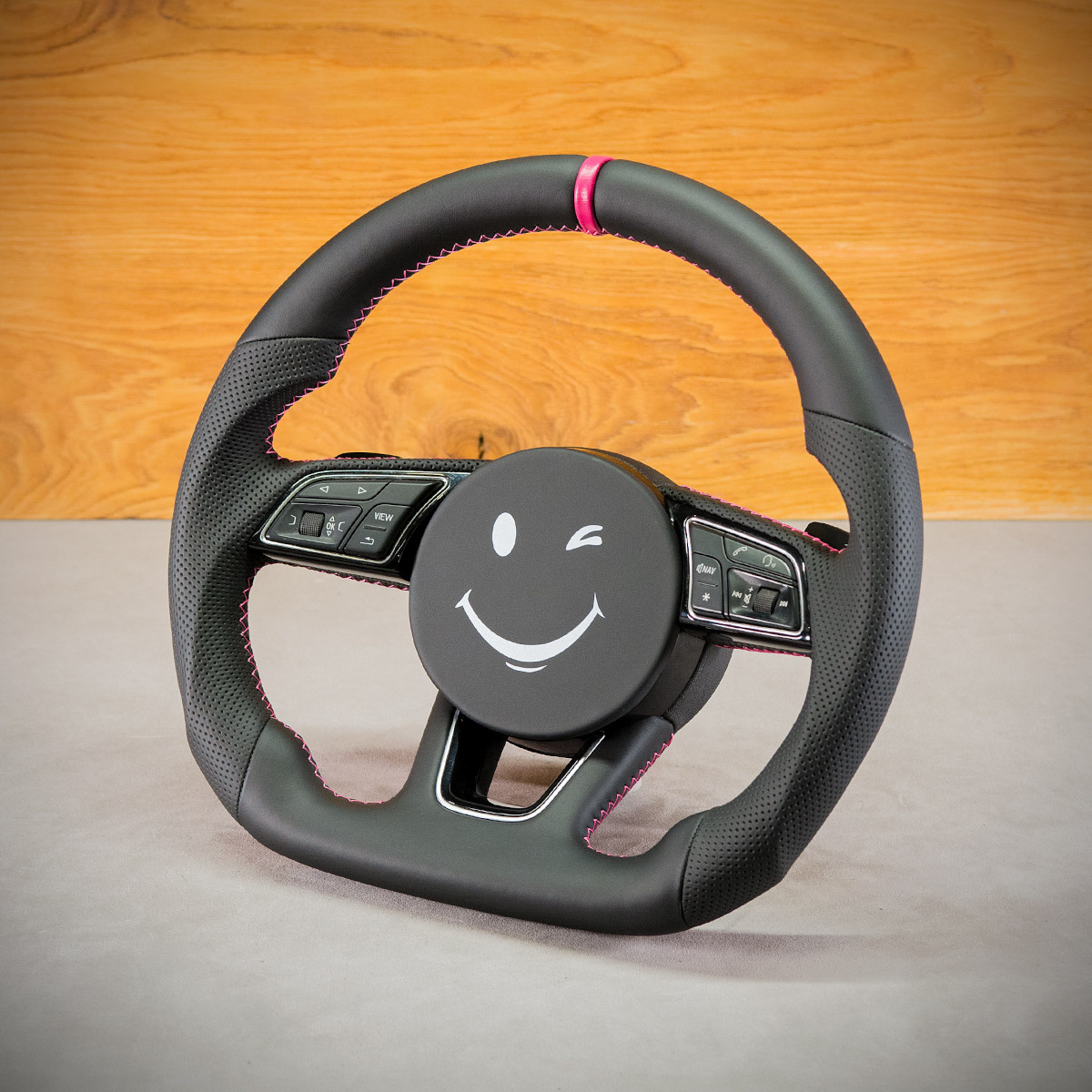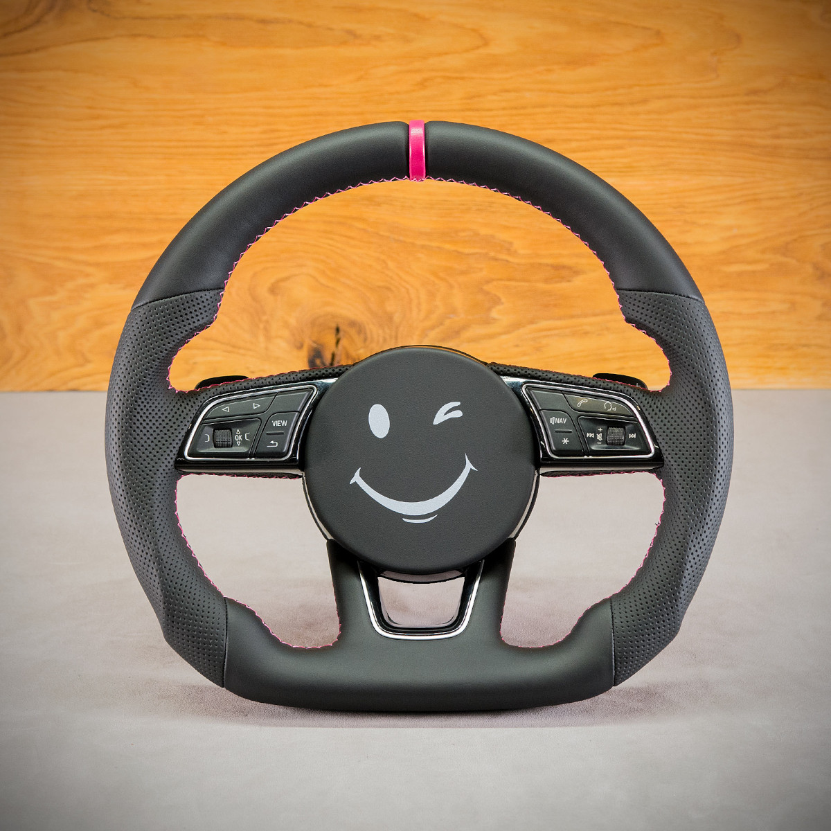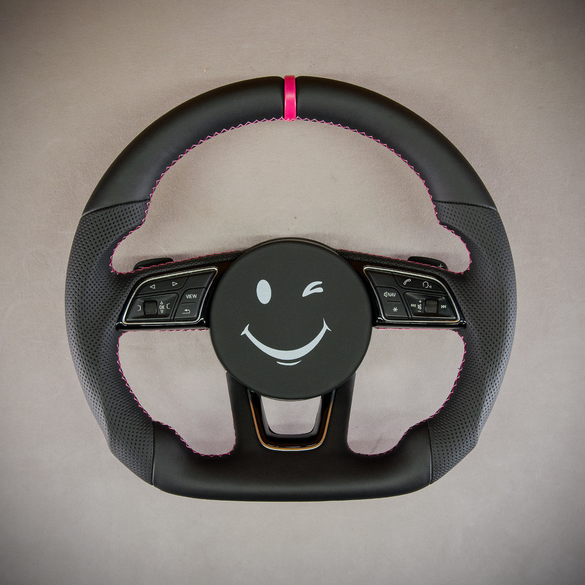 Bardzo wyraźny tuning kierownicy Audi A3 8V poprzez połączenie modyfikacji oraz obszycia. Kierownica obszyta skórą gładką oraz perforowaną. Są to skóry najlepszego gatunku dostępne na rynku europejskim. Skóra gładka zapewnia bardzo przyjemny dotyk, jak i niezwykłą trwałość. Skóra perforowana zalecana jest na boki kierownicy. Perforacja, czyli dziurki, nie są wykonane na wylot a jedynie wytłoczone w skórze. To nadaje komfort trzymania. Zastosowany szew performance jest uznawany za jeden z najpiękniejszych szwów, którym można ozdobić kierownicę. Dodatkowo do tego szwu stosuje się grubszą nić.