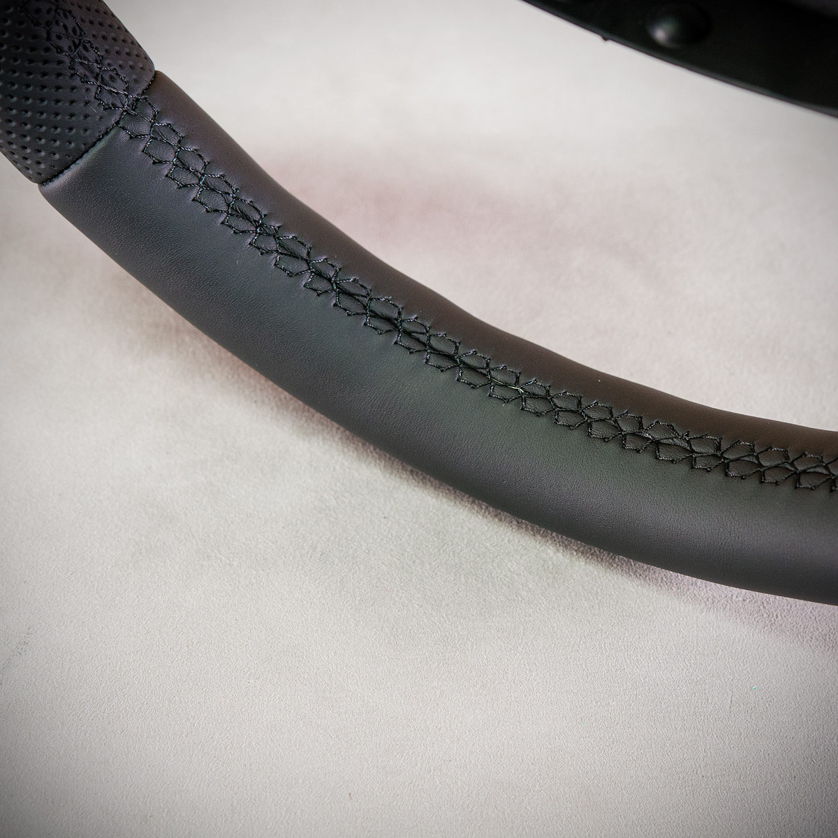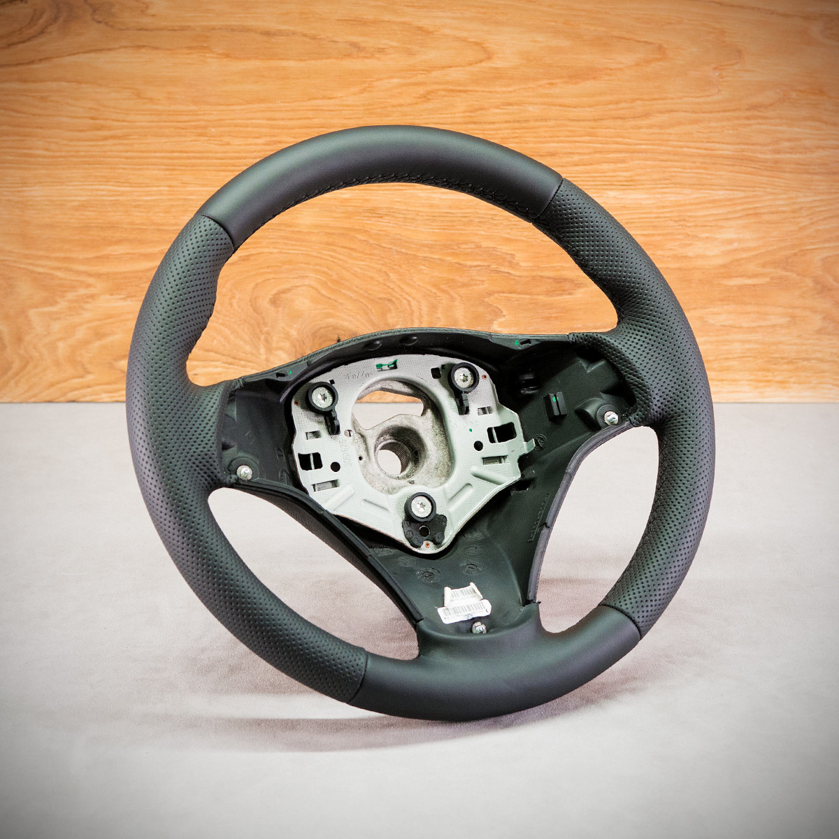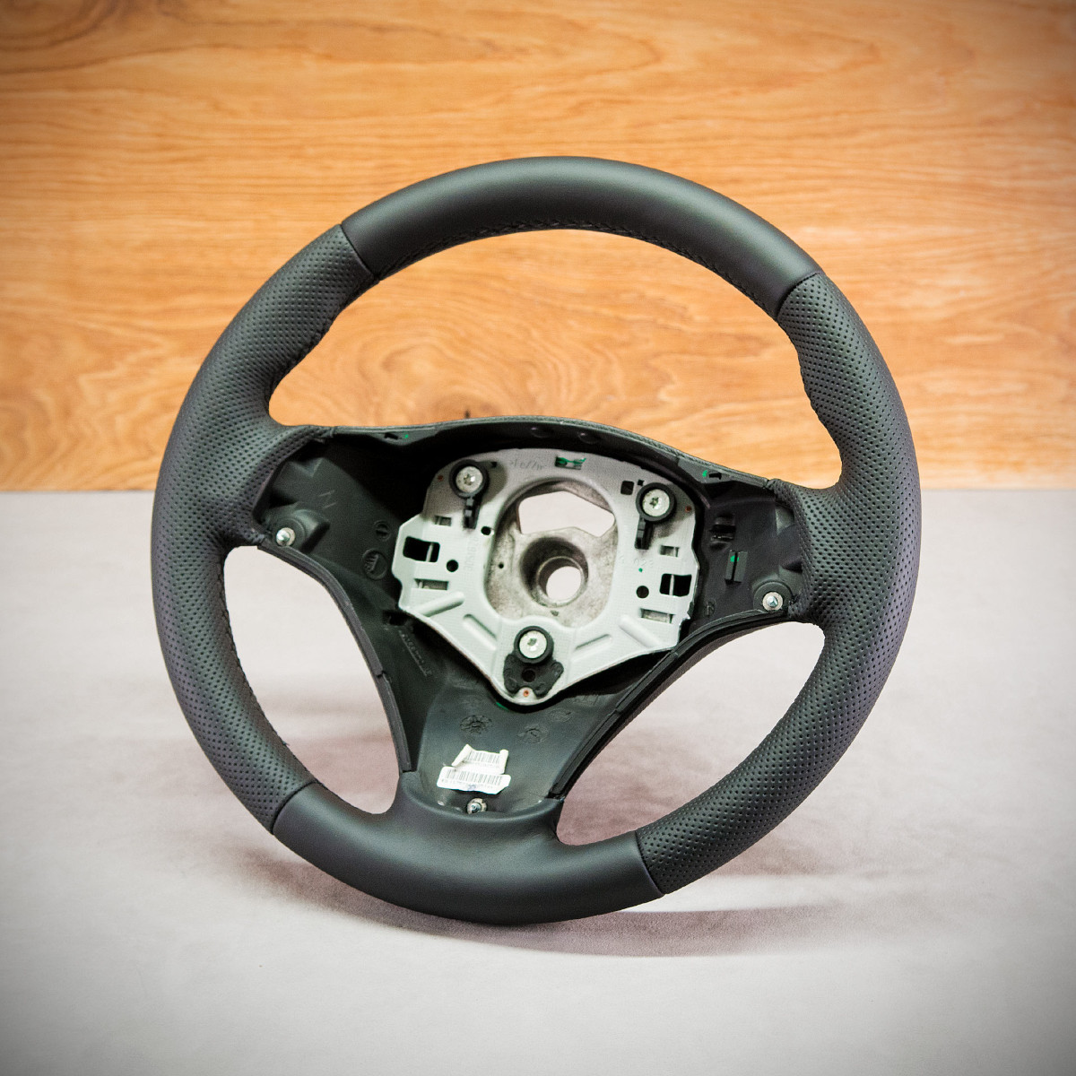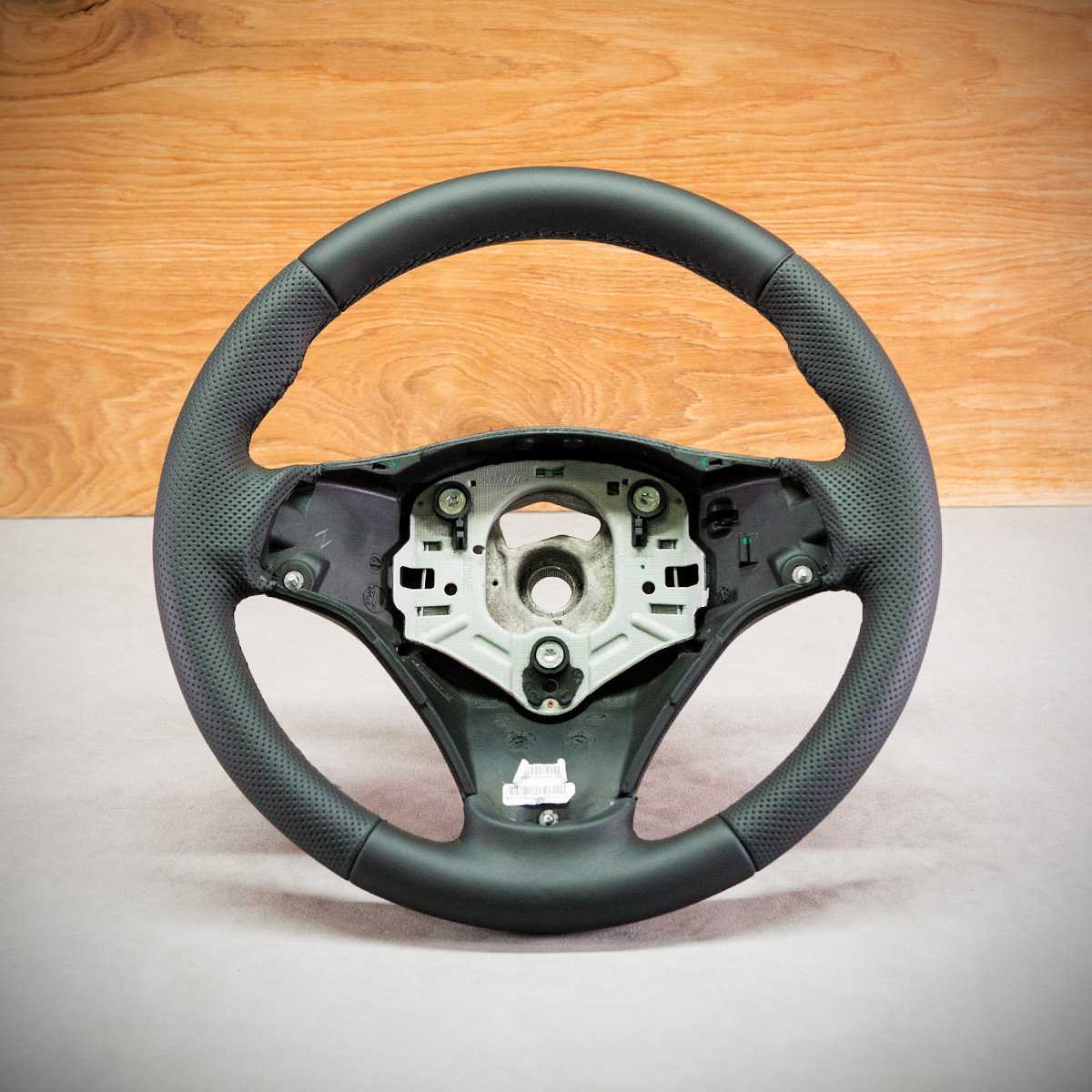 Kierownica BMW E91 nabrała świeżego wyglądu, została na nowo obszyta skórą gładką oraz perforowaną. Są to skóry najlepszego gatunku jakie są dostępne na rynku europejskim. Skóra gładka zapewnia zarówno bardzo przyjemny dotyk, jak i niezwykłą trwałość. Skóra perforowana zalecana jest na boki kierownicy. Perforacja, czyli dziurki, nie są wykonane na wylot a jedynie wytłoczone w skórze. To nadaje komfort trzymania. Szew seryjny jest najpopularniejszym szwem na rynku motoryzacyjnym nadający kierownicy dodatkowego uroku.