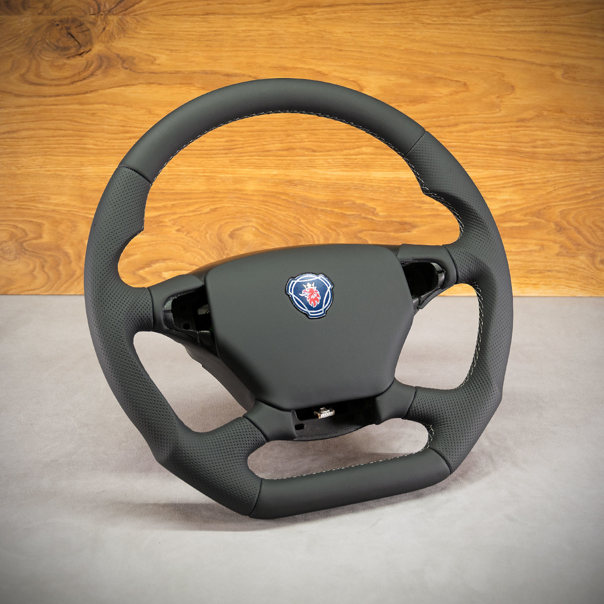 Bardzo wyraźny tuning kierownicy do samochodu ciężarowego Scania R450 poprzez połączenie modyfikacji oraz obszycia. Kierownica obszyta skórą gładką oraz perforowaną. Są to skóry najlepszego gatunku z dostępnych na rynku europejskim. Skóra gładka zapewnia bardzo przyjemny dotyk, jak i niezwykłą trwałość. Skóra perforowana zalecana jest na boki kierownicy. Perforacja, czyli dziurki, nie są wykonane na wylot a jedynie wytłoczone w skórze. To nadaje komfort trzymania.