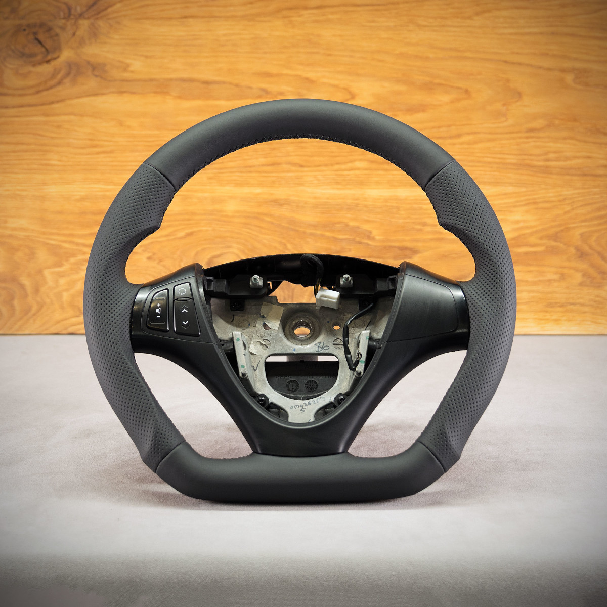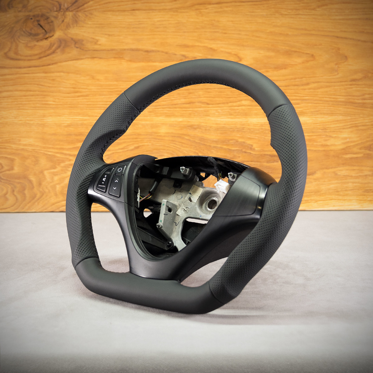 Bardzo wyraźny tuning kierownicy Hyundai i30 poprzez połączenie modyfikacji oraz obszycia. Obszyta skórą gładką Nappa oraz skórą perforowaną. Są to najwyższej jakości skóry używane na rynku motoryzacyjnym. Zastosowany szew performance jest niezwykle modny i często wybierany przez klientów.