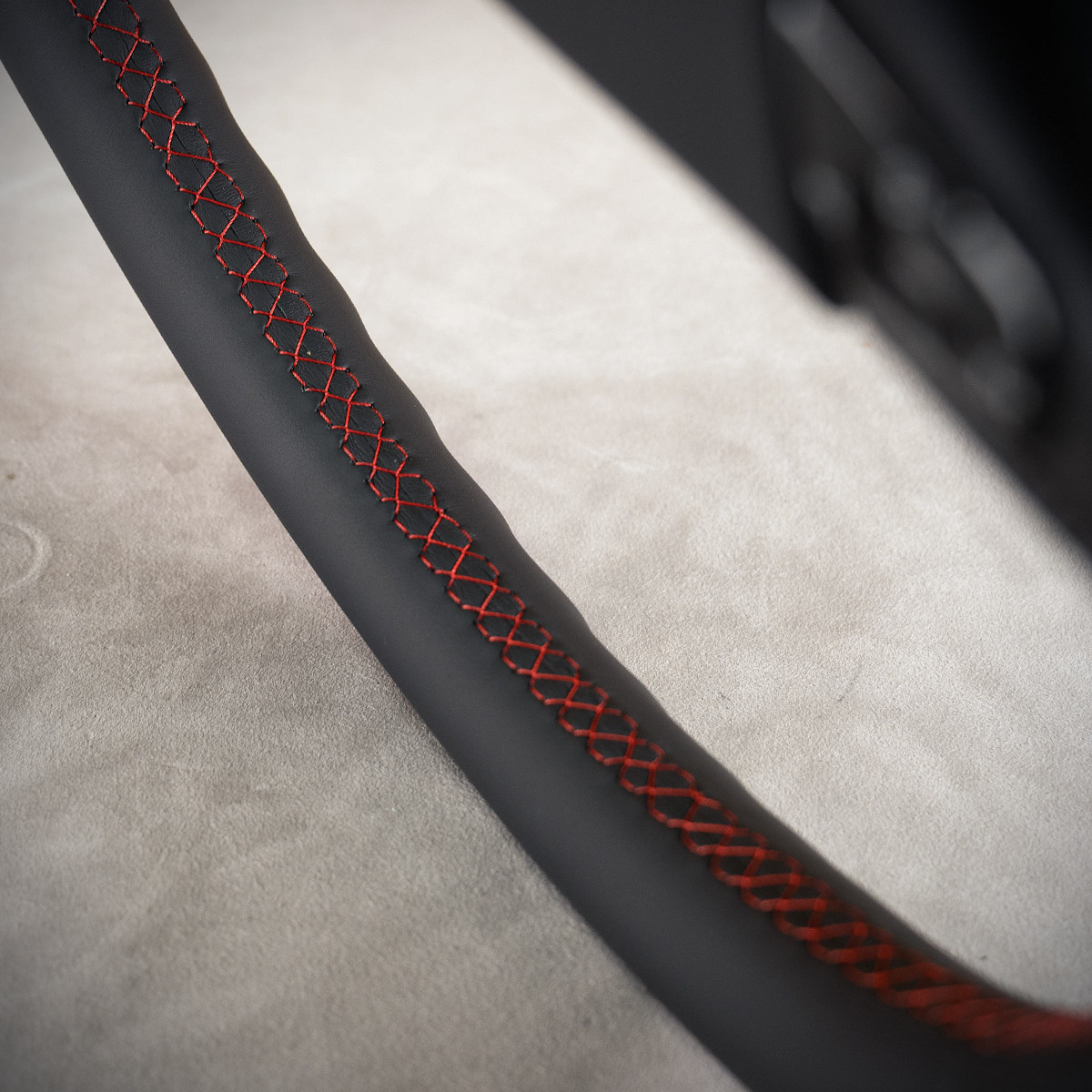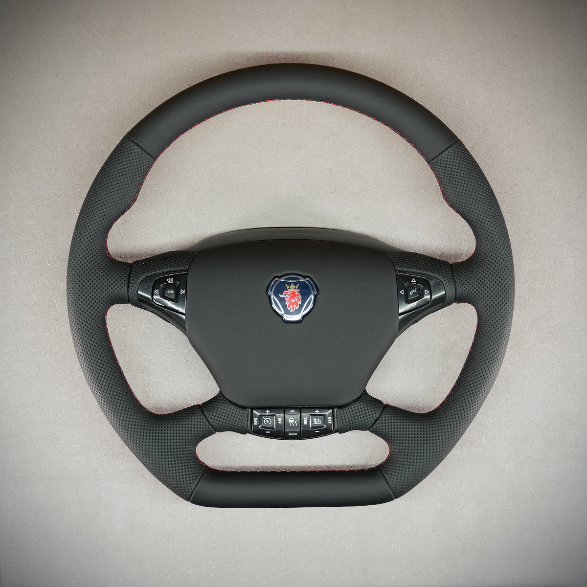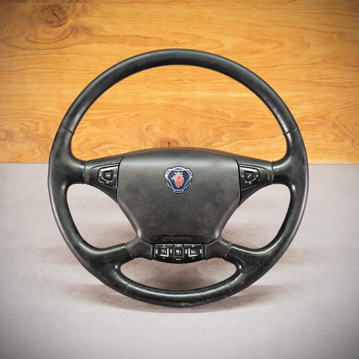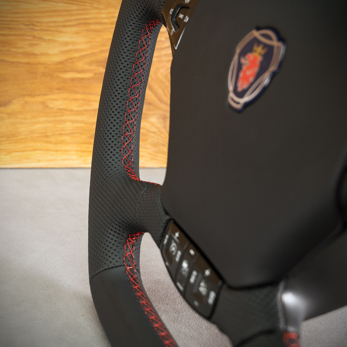 Tuning kierowcy Scania R do samochodu ciężarowego poprzez połączenie modyfikacji oraz obszycia. Na kierownicy została zastosowana modyfikacja kształtu V1, obszycie nową skórą sprawia, że kierownica komfortowa. Skóra gładka zapewnia bardzo przyjemny dotyk, jak i niezwykłą trwałość. Skóra perforowana nadaje komfort trzymania poprzez wytłoczone dziurki. Szew seryjny w kolorze czerwonym jest spójny z kolorem tapicerki w aucie.