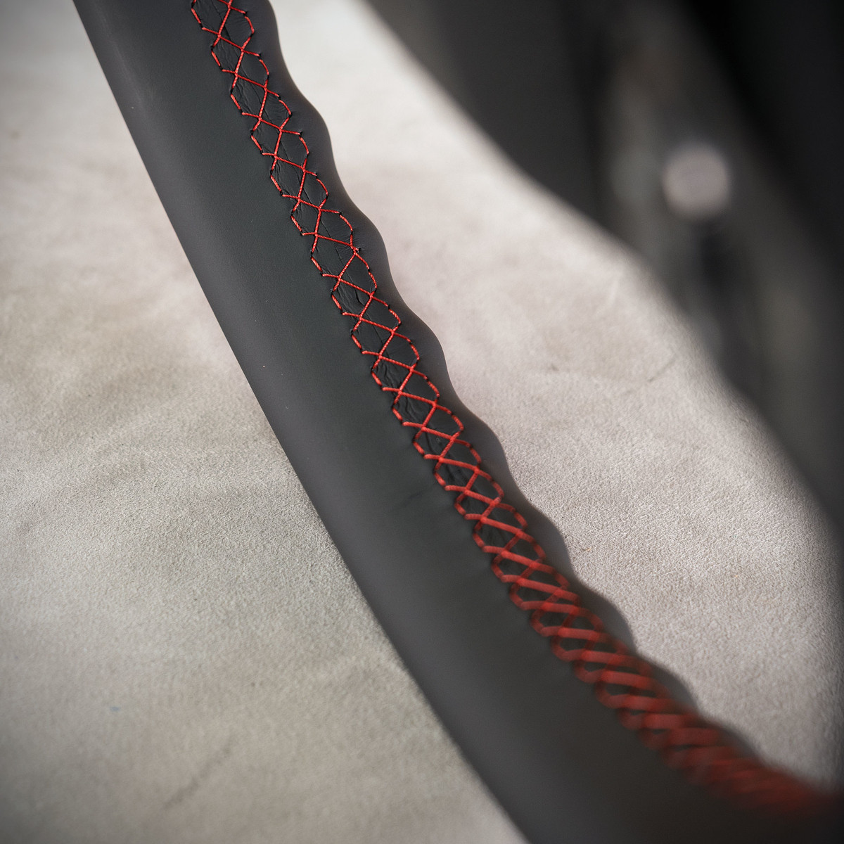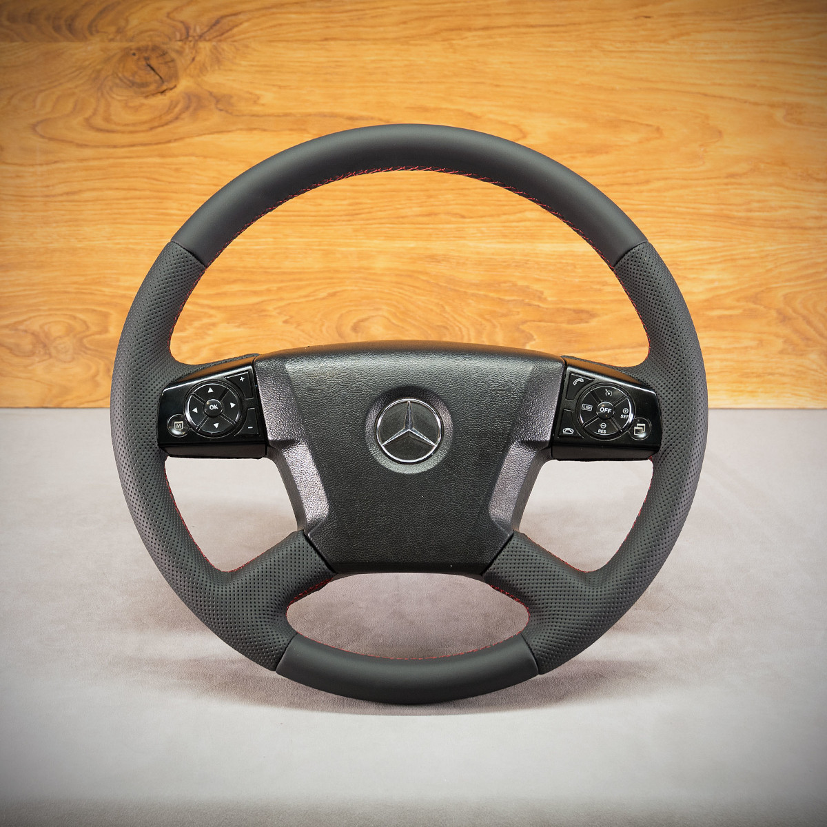 Kierownica Mercedes-Benz Actros MP4 została na nowo obszyta skórą gładką oraz perforowaną. Są to skóry najlepszego gatunku dostępne na rynku europejskim. Skóra gładka zapewnia bardzo przyjemny dotyk, jak i niezwykłą trwałość. Skóra perforowana zalecana jest na boki kierownicy. Perforacja, czyli dziurki, nie są wykonane na wylot a jedynie wytłoczone w skórze. To nadaje komfort trzymania. Zastosowany szew seryjny jest najczęściej wybieranym szwem przez naszych klientów.