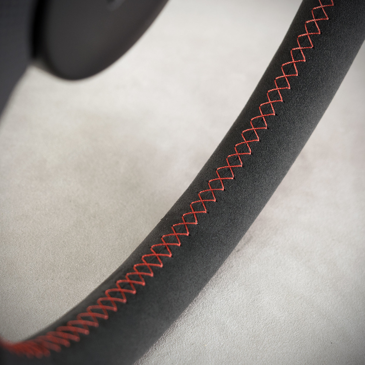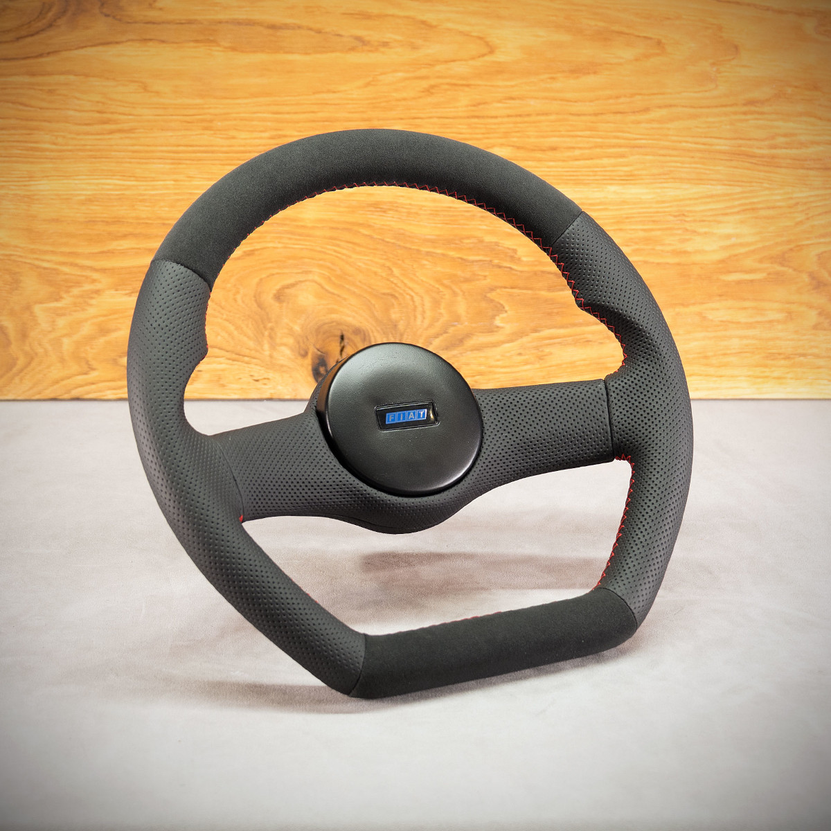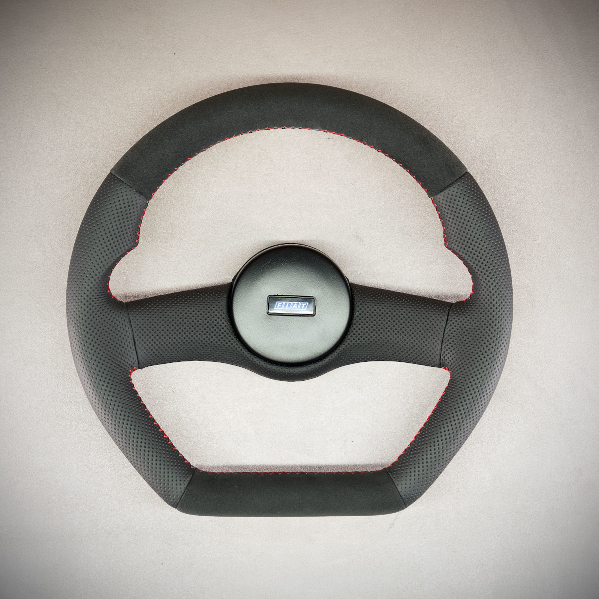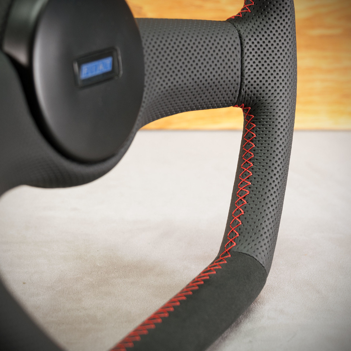 Bardzo wyraźny tuning kierownicy Fiat Cinquecento poprzez połączenie modyfikacji oraz obszycia. Kierownica obszyta skórą Alcantarą® oraz skórą perforowaną. Są to skóry materiały najlepszego gatunku dostępne na rynku europejskim. Alcantara® zapewnia bardzo przyjemny dotyk. Skóra perforowana zalecana jest na boki kierownicy. Perforacja, czyli dziurki, nie są wykonane na wylot a jedynie wytłoczone w skórze. To nadaje komfort trzymania.