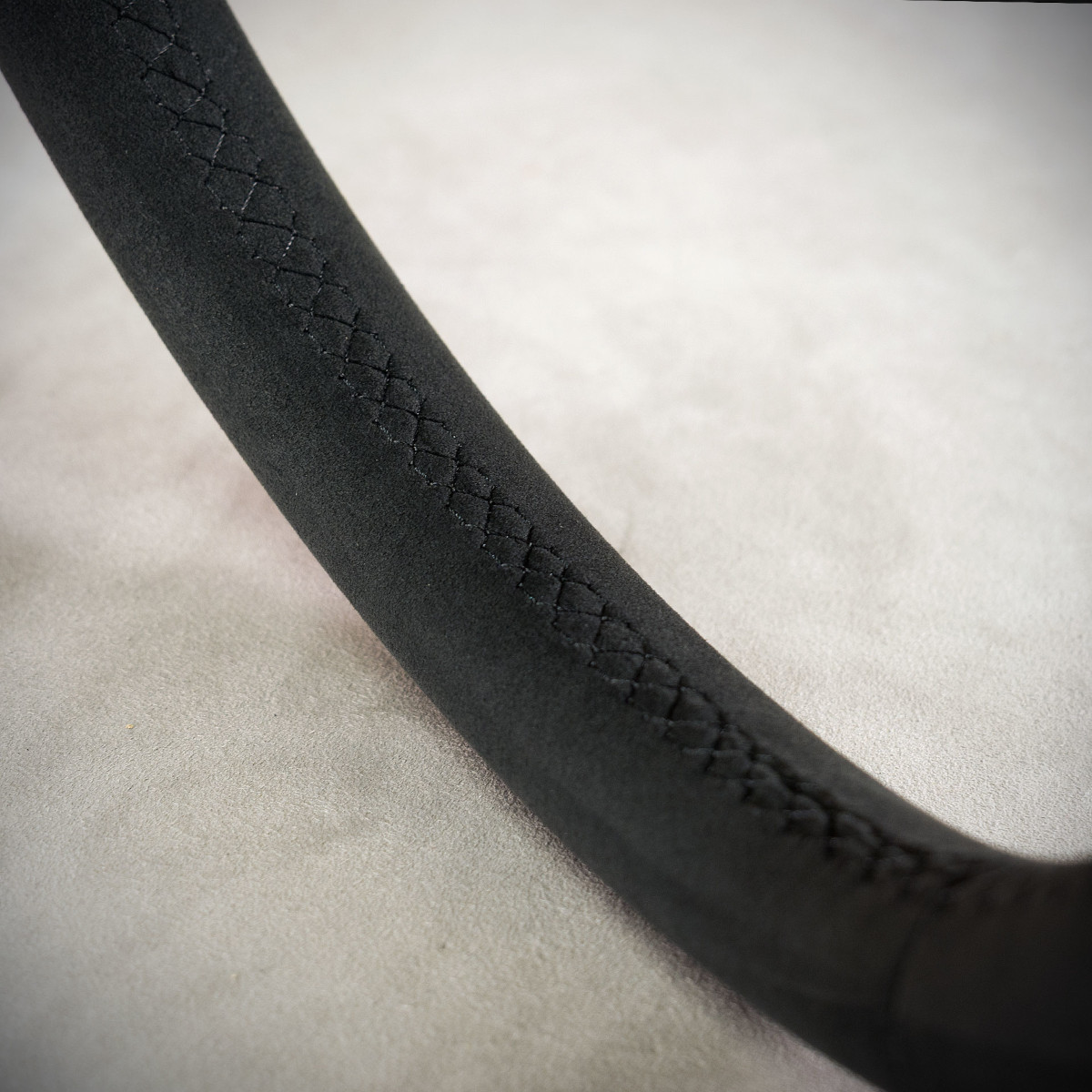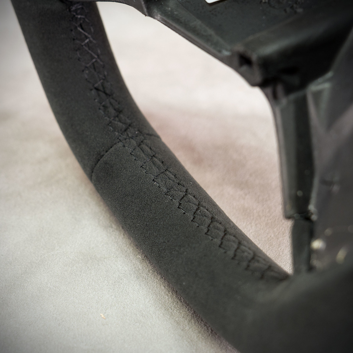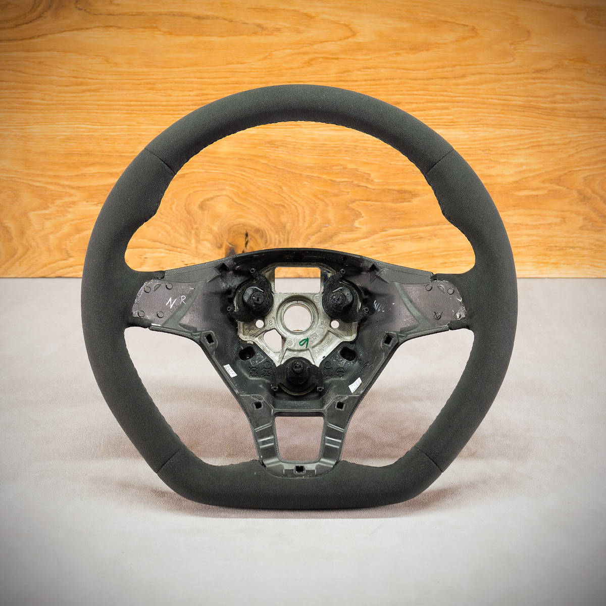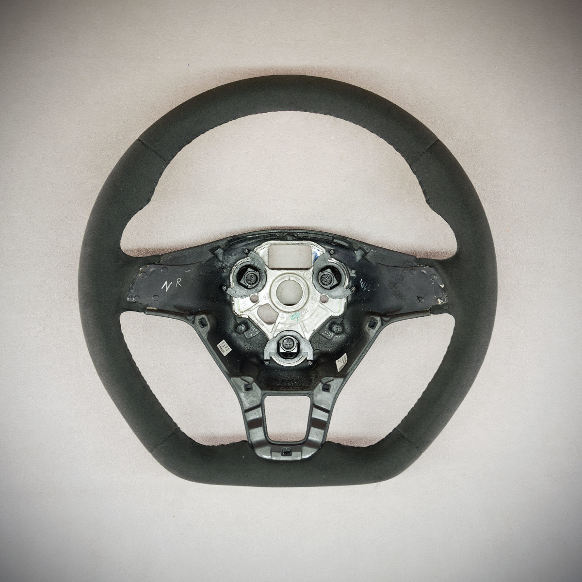 Bardzo wyraźny tuning kierownicy Volkswagen Cady poprzez połączenie modyfikacji oraz obszycia Alcantarą®. Jest to materiał bardzo przyjemny i modny.