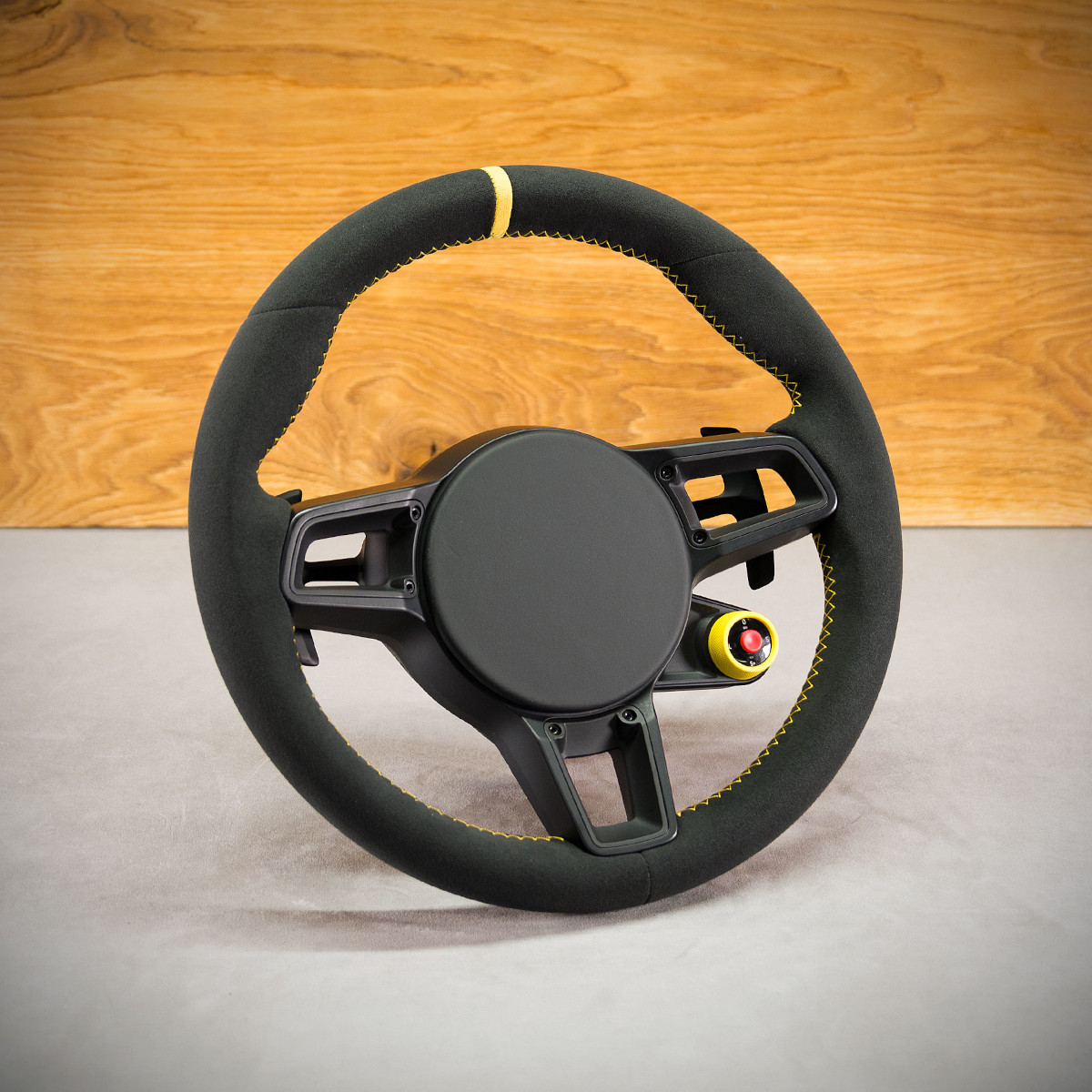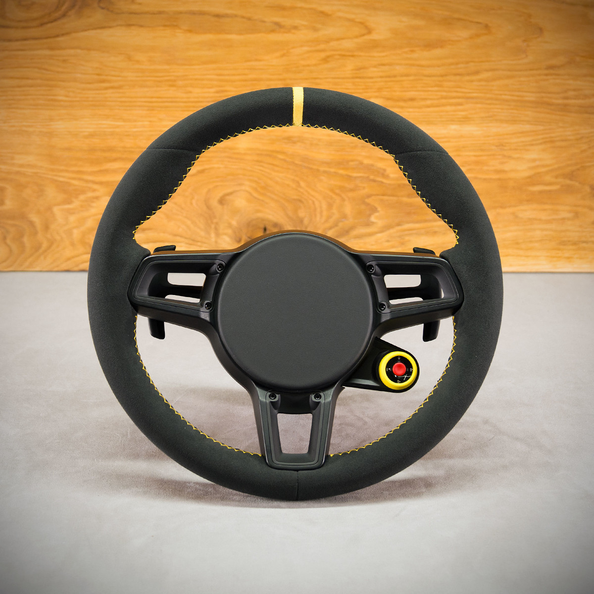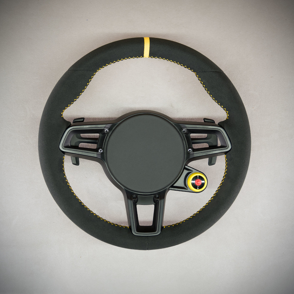 Kierownica Porsche Cayman 718 została obszyta na nowo Alcantarą®, jest to bardzo elegancki a zarazem modny materiał stosowany do obszywania kierownic. Pasek centrujący oraz szew performance w kolorze żółtym to kolorowe akcenty, które świetnie odbijają na Alcantarze®.