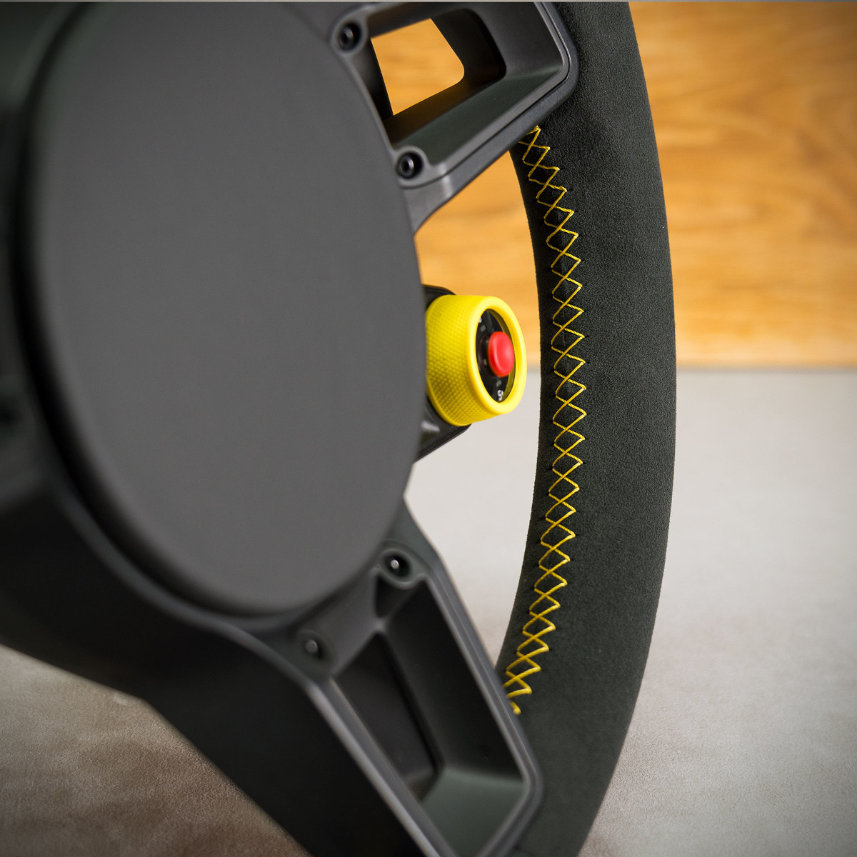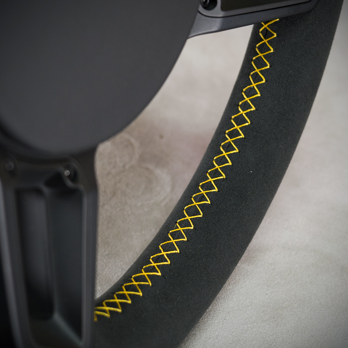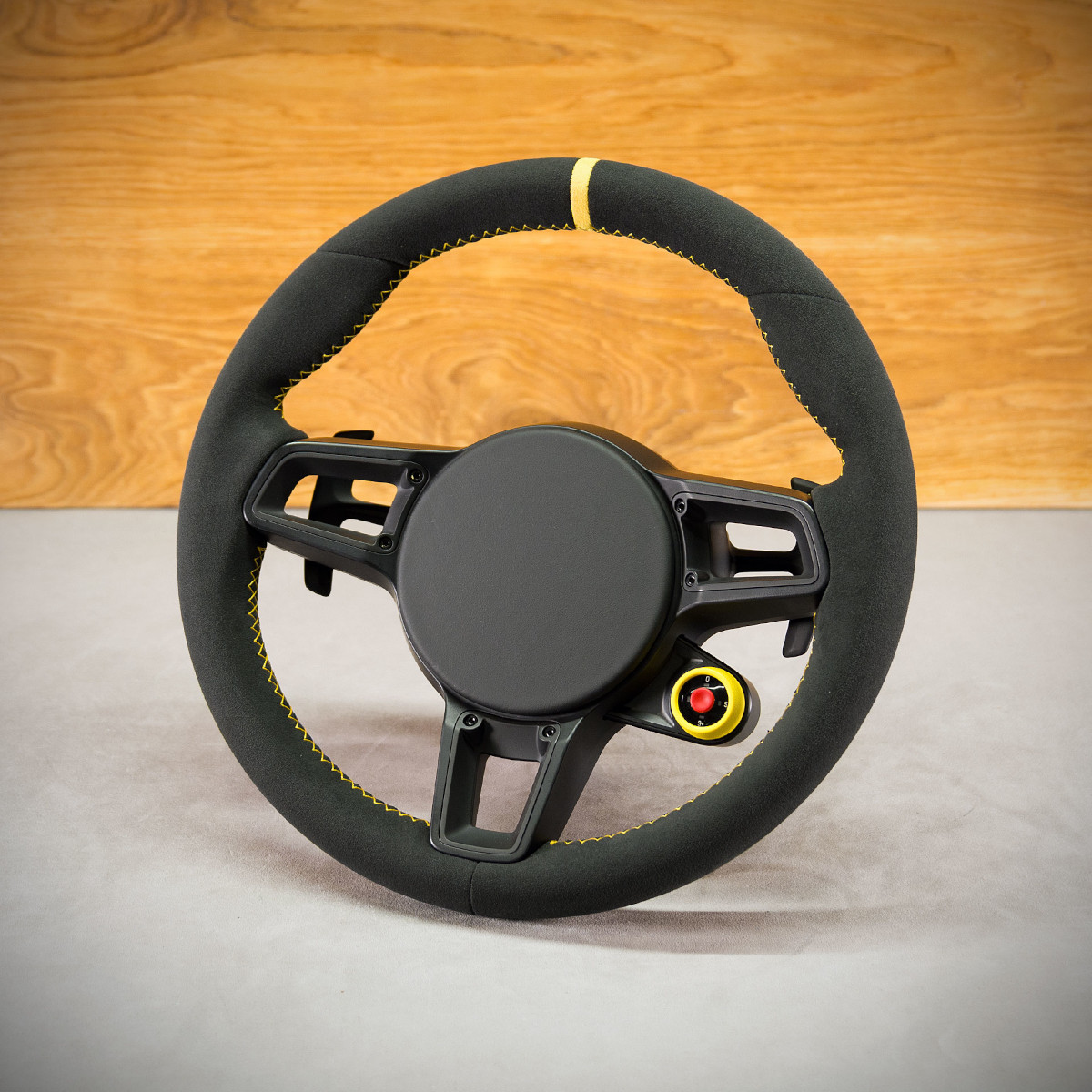 Kierownica Porsche Cayman 718 została obszyta na nowo Alcantarą®, jest to bardzo elegancki a zarazem modny materiał stosowany do obszywania kierownic. Pasek centrujący oraz szew performance w kolorze żółtym to kolorowe akcenty, które świetnie odbijają na Alcantarze®.