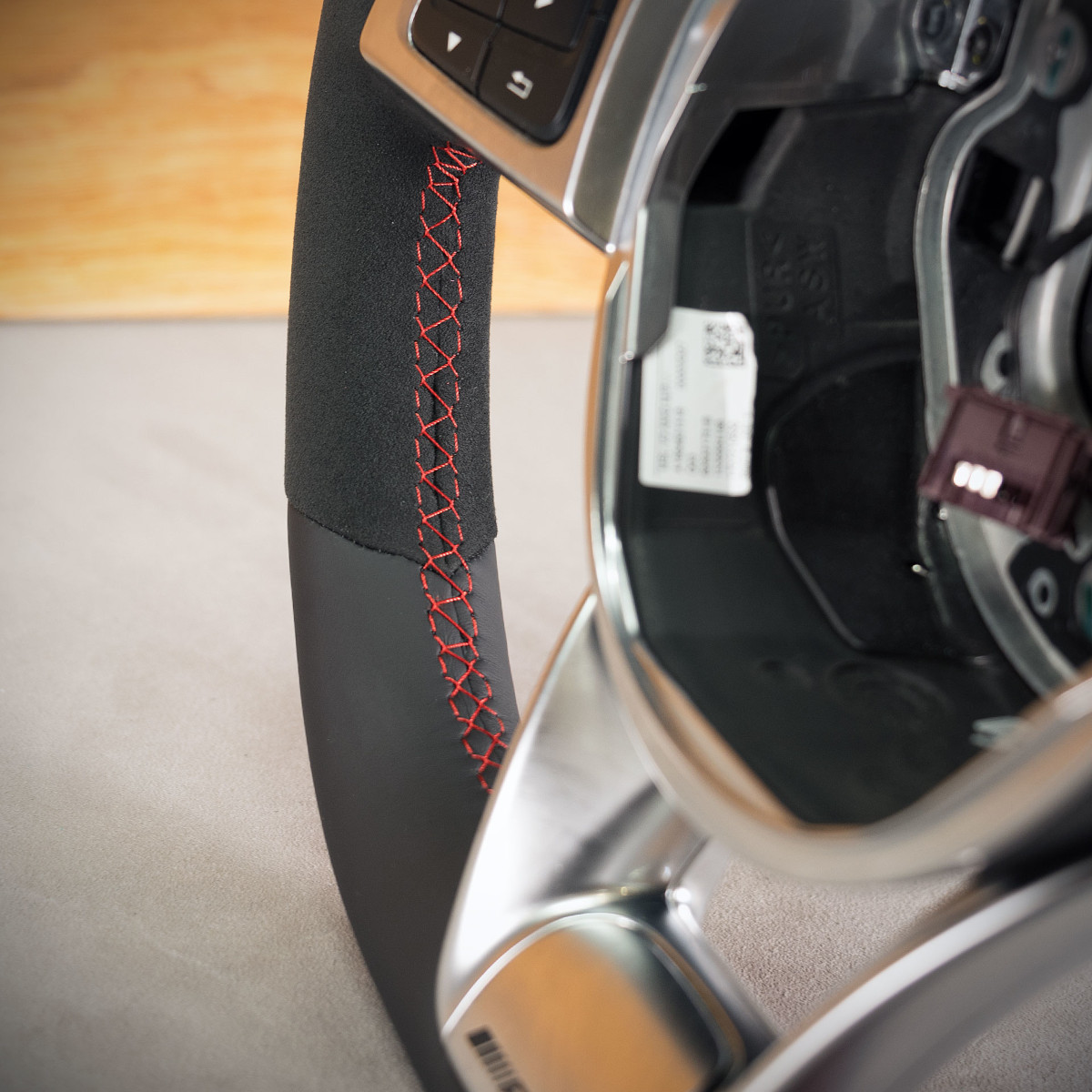 Kierownica Mercedes-Benz CLA 45 S AMG została na nowo obszyta skórą gładką oraz Alcantarą. Są to materiały do obszywania kierownic najwyższego gatunku. Alcantara® jest niezwykle modna, elegancka i przyjemna w dotyku. Skóra gładka zapewnia bardzo przyjemny dotyk, jak i niezwykłą trwałość.