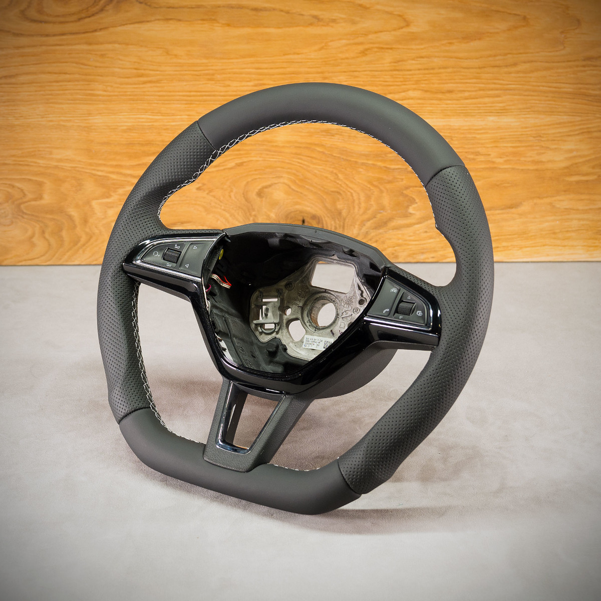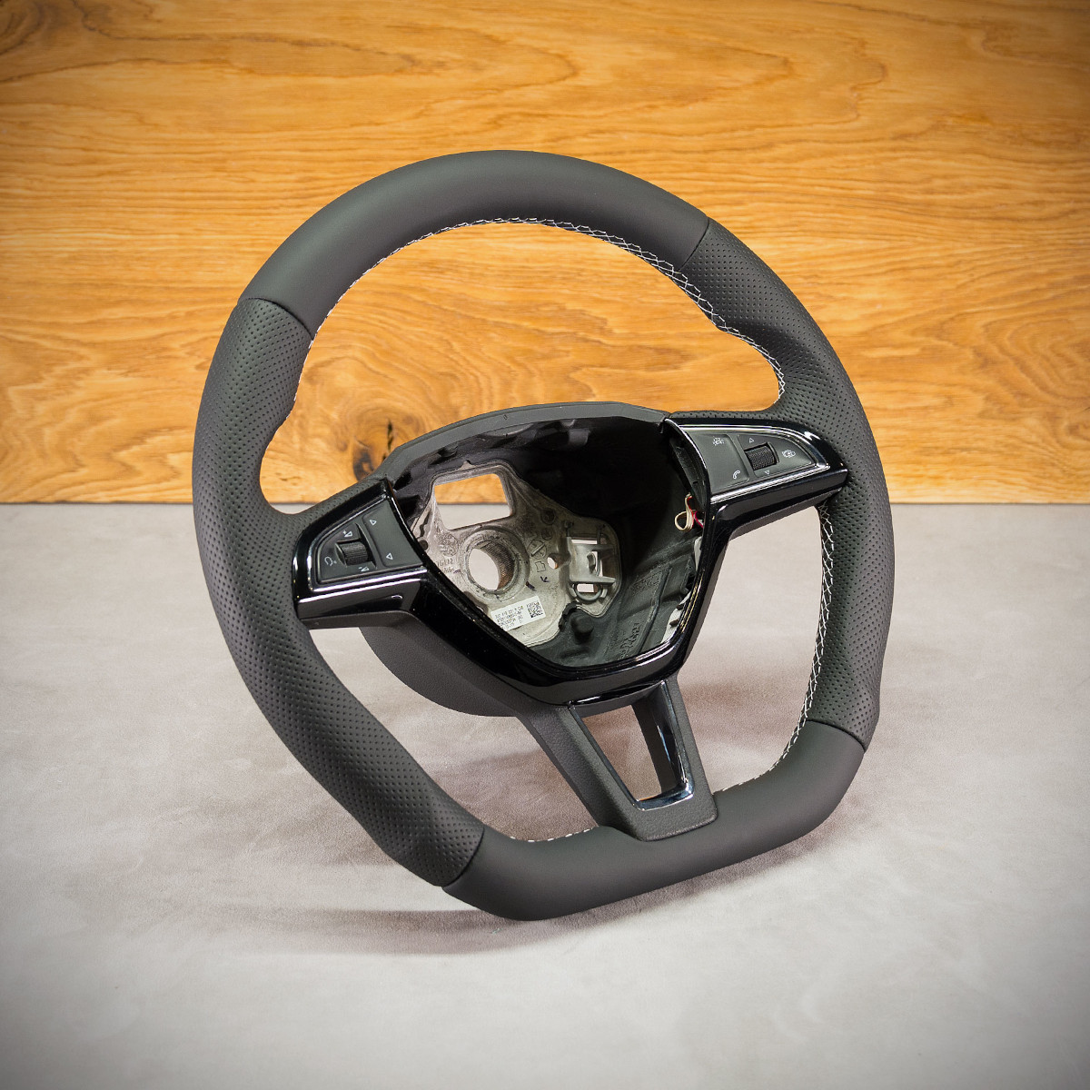 Bardzo wyraźny tuning kierownicy Skoda Kodiaq poprzez połączenie modyfikacji oraz obszycia. Kierownica obszyta skórą gładką oraz perforowana. Są to skóry najlepszego gatunku z dostępnych na rynku europejskim. Skóra gładka zapewnia bardzo przyjemny dotyk, jak i niezwykłą trwałość. Skóra perforowana zalecana jest na boki kierownicy. Perforacja, czyli dziurki, nie są wykonane na wylot a jedynie wytłoczone w skórze. To nadaje komfort trzymania.