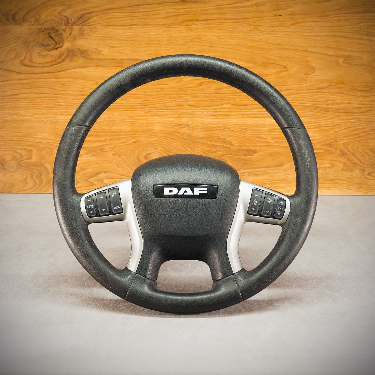 Bardzo wyraźny tuning kierownicy DAF Euro 6 poprzez połączenie modyfikacji oraz obszycia. Kierownica obszyta skórą gładką oraz perforowaną. Skóra gładka zapewnia bardzo przyjemny dotyk, jak i niezwykłą trwałość. Skóra perforowana zalecana jest na boki kierownicy. Perforacja, czyli dziurki, nie są wykonane na wylot a jedynie wytłoczone w skórze. To nadaje komfort trzymania. W tej realizacji jest zrobiony klakson w pięknym kolorze.