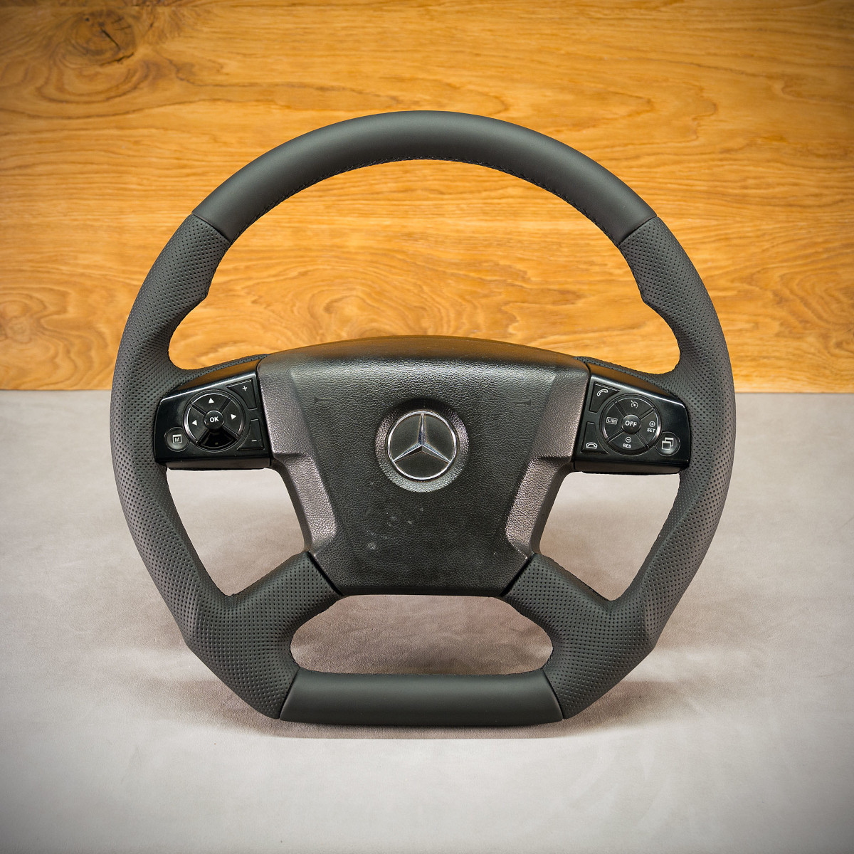Bardzo wyraźny tuning kierownicy samochodu ciężarowego Mercedes-Benz Atego poprzez połączenie modyfikacji oraz obszycia. Kierownica obszyta skórą gładką oraz perforowaną. Są to skóry najlepszego gatunku z dostępnych na rynku europejskim. Skóra gładka zapewnia bardzo przyjemny dotyk, jak i niezwykłą trwałość. Skóra perforowana zalecana jest na boki kierownicy. Perforacja, czyli dziurki, nie są wykonane na wylot a jedynie wytłoczone w skórze. To nadaje komfort trzymania.