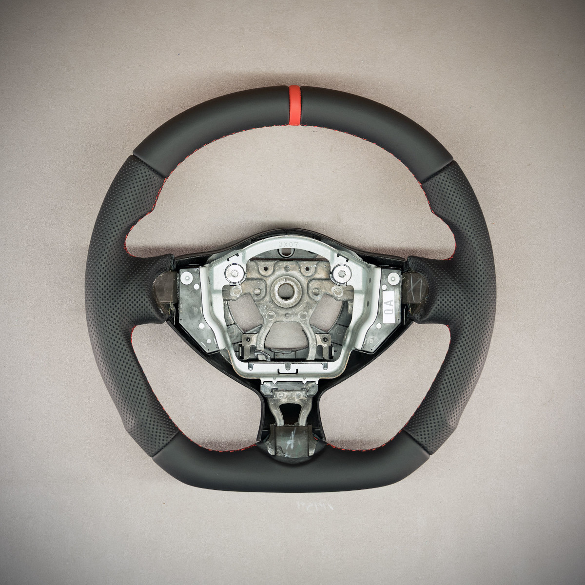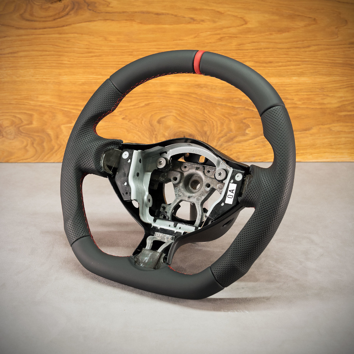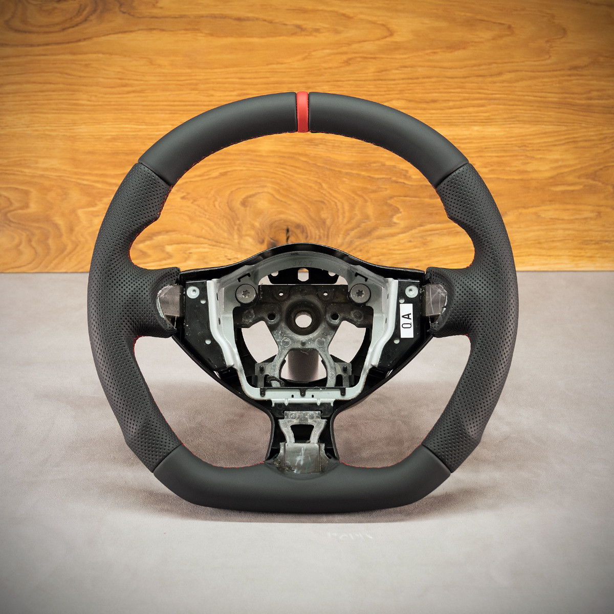 Bardzo wyraźny tuning kierownicy Infiniti QX70 poprzez połączenie modyfikacji oraz obszycia. Kierownica obszyta skórą gładką oraz perforowana. Są to skóry najlepszego gatunku z dostępnych na rynku europejskim. Skóra gładka zapewnia bardzo przyjemny dotyk, jak i niezwykłą trwałość. Skóra perforowana zalecana jest na boki kierownicy. Perforacja, czyli dziurki, nie są wykonane na wylot a jedynie wytłoczone w skórze. To nadaje komfort trzymania. Pasek centrujący to kolorystyczny akcent który dodaje jeszcze większego sportowego charakteru kierownicy.