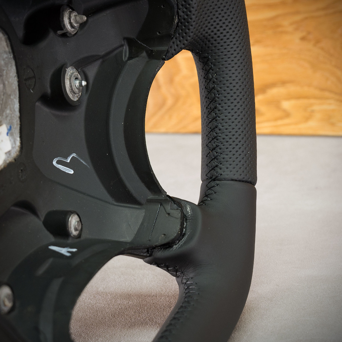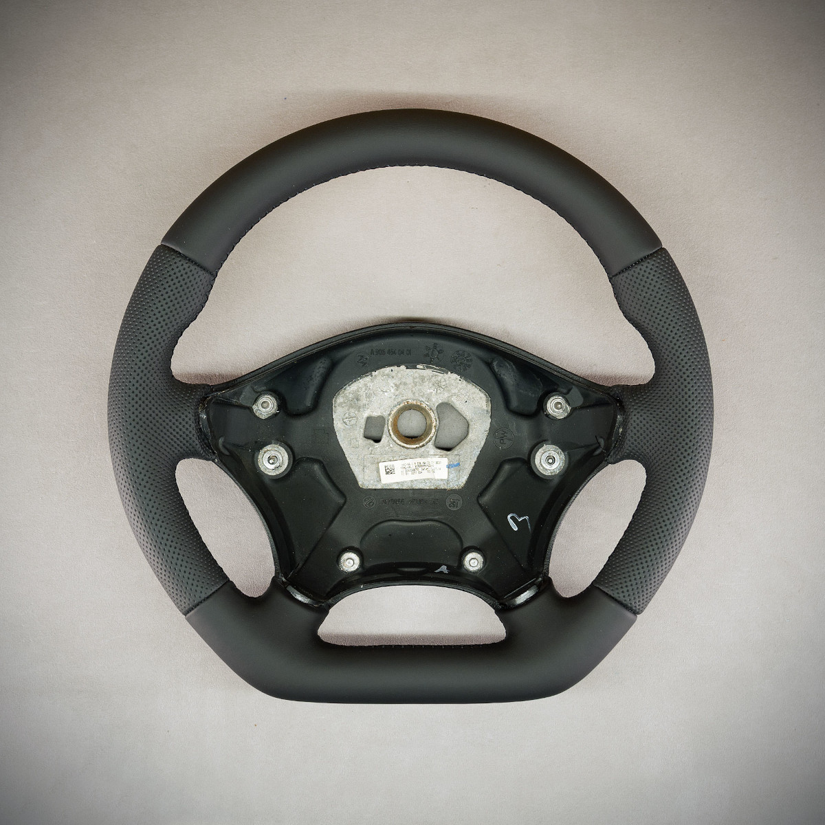 Bardzo wyraźny tuning kierownicy Mercedes-Benz Sprinter W906 poprzez połączenie modyfikacji oraz obszycia. Kierownica obszyta skórą gładką oraz perforowaną. Są to skóry najlepszego gatunku z dostępnych na rynku europejskim. Skóra gładka zapewnia przyjemny dotyk, jak i niezwykłą trwałość. Skóra perforowana zalecana jest na boki kierownicy. Perforacja, czyli dziurki, nie są wykonane na wylot a jedynie wytłoczone w skórze. To nadaje komfort trzymania.