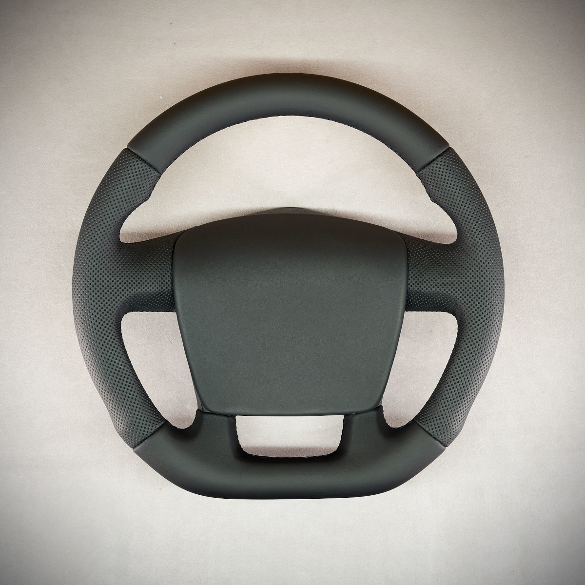 Bardzo wyraźny tuning kierownicy Peugeot Boxer poprzez połączenie modyfikacji oraz obszycia. Kierownica obszyta skórą gładką oraz perforowana. Są to skóry najlepszego gatunku z dostępnych na rynku europejskim. Skóra gładka zapewnia bardzo przyjemny dotyk, jak i niezwykłą trwałość. Skóra perforowana zalecana jest na boki kierownicy. Perforacja, czyli dziurki, nie są wykonane na wylot a jedynie wytłoczone w skórze. To nadaje komfort trzymania.