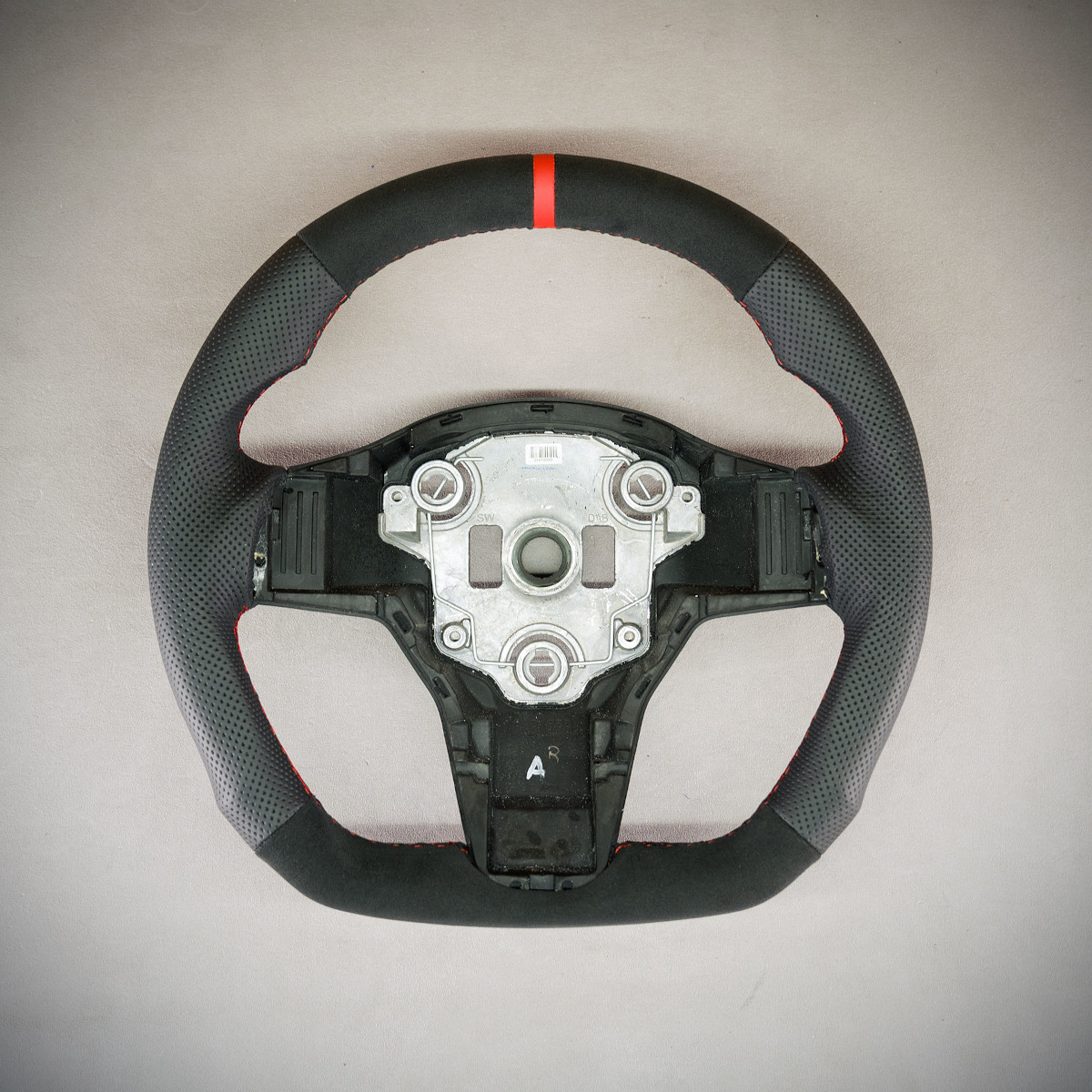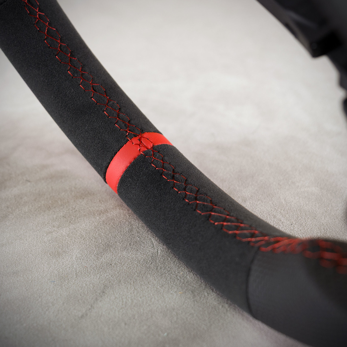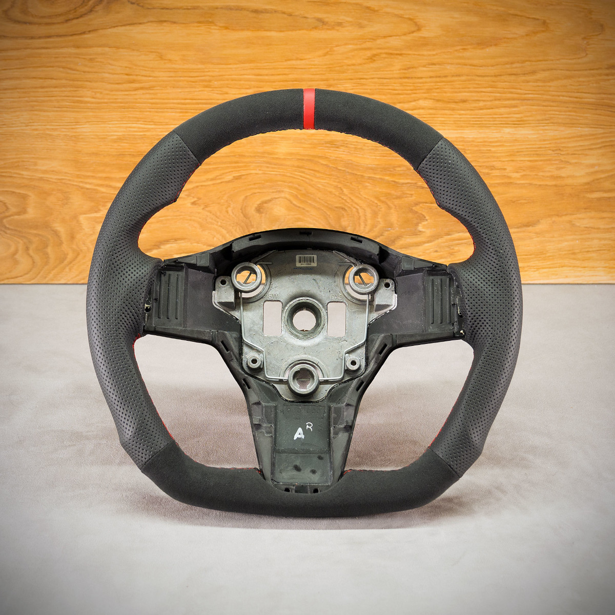 Bardzo wyraźny tuning kierownicy Tesla Model 3 poprzez połączenie modyfikacji oraz obszycia. Kierownica obszyta Alcantarą® oraz skórą perforowaną. Są to materiały najlepszej jakości z dostępnych na rynku europejskim. Alcantara® jest niezwykle elegancka a skóra perforowana zalecana jest na boki kierownicy. Perforacja, czyli dziurki, nie są wykonane na wylot a jedynie wytłoczone w skórze. To nadaje komfort trzymania. Pasek centrujący oraz szew seryjny ładnie odbijają na kierownicy.