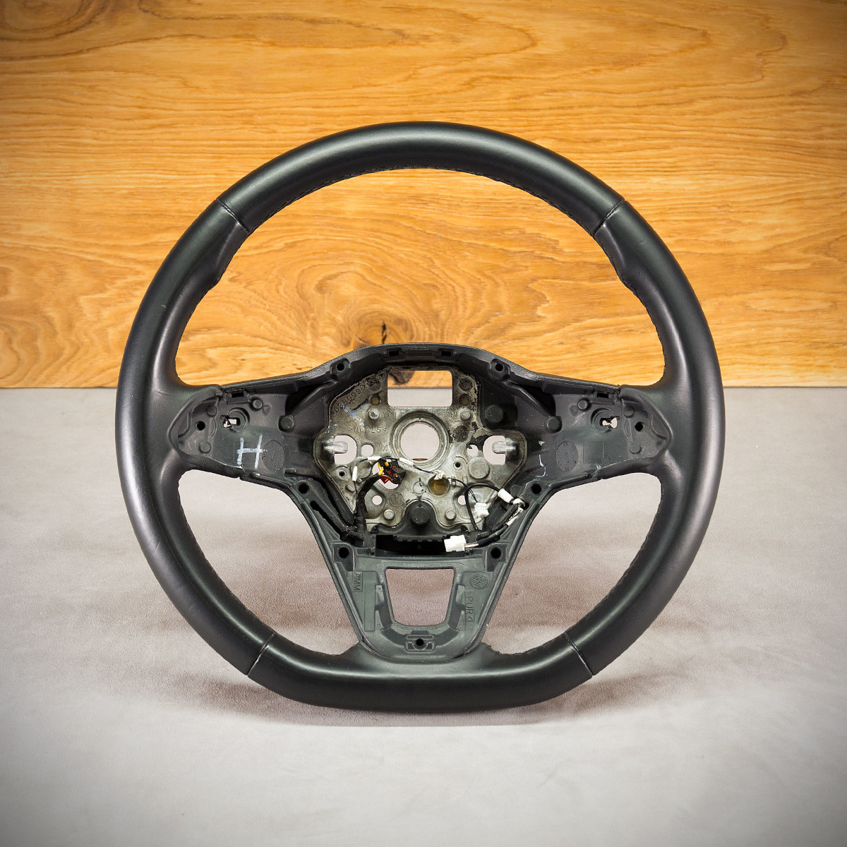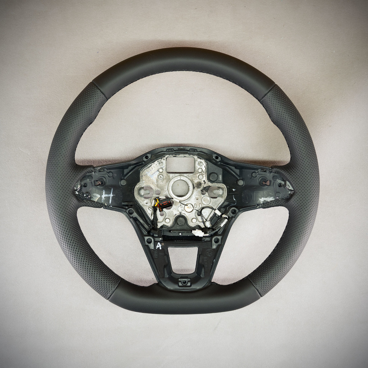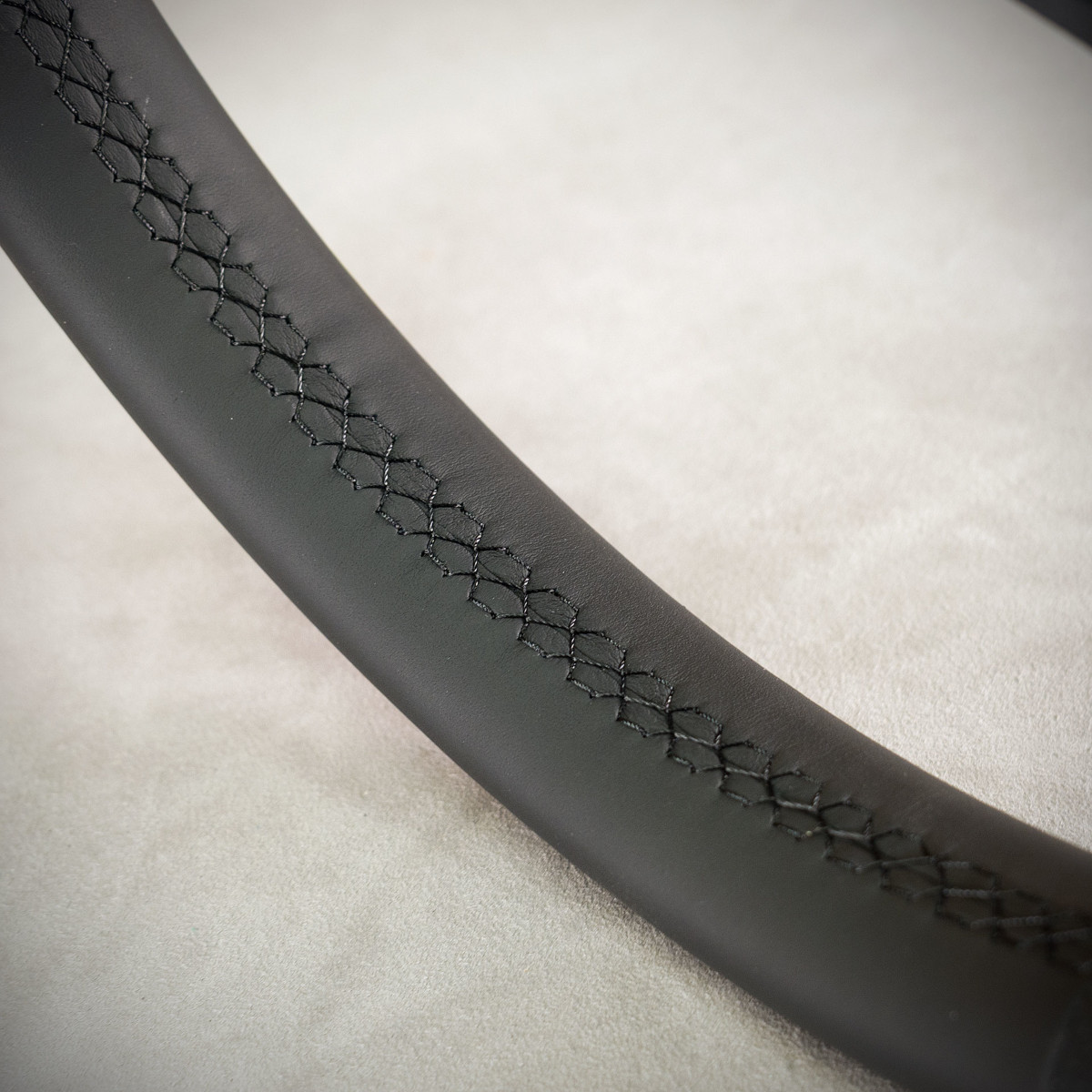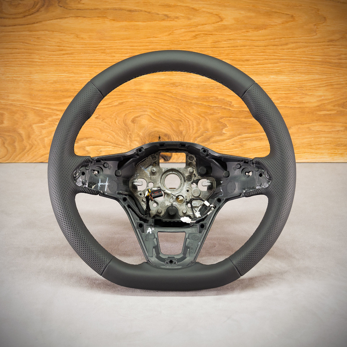 Obszycie kierownicy z ogrzewaniem Volkswagen Atlas nadało jej świeższego wyglądu. Kierownica nie została poddana żadnej modyfikacji tylko obszyta na nowo. Nowa skóra została nałożona na obecny wykrój tak, aby nic nie uległo uszkodzeniu, delikatnie pogrubiła się ale ogrzewanie działa bez zarzutów.