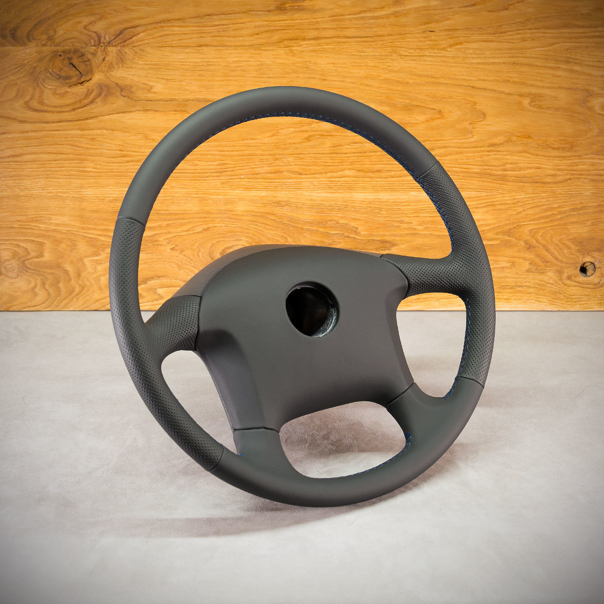 Kierownica Mercedes-Benz Atego została na nowo obszyta skórą gładką oraz perforowaną. Są to skóry najlepszego gatunku dostępne na rynku europejskim. Skóra gładka zapewnia bardzo przyjemny dotyk, jak i niezwykłą trwałość. Skóra perforowana zalecana jest na boki kierownicy. Perforacja, czyli dziurki, nie są wykonane na wylot a jedynie wytłoczone w skórze. To nadaje komfort trzymania. Zastosowany szew seryjny jest najczęściej wybieranym szwem przez naszych klientów.