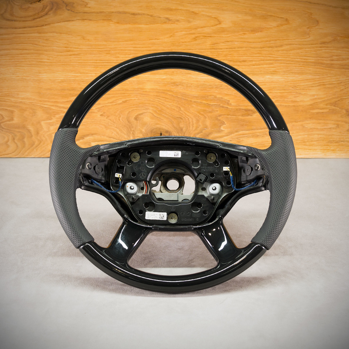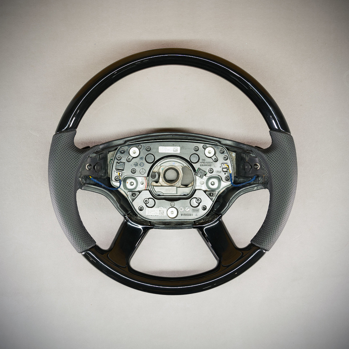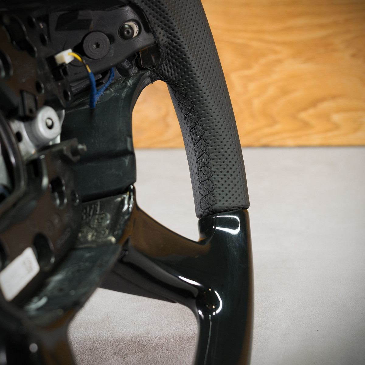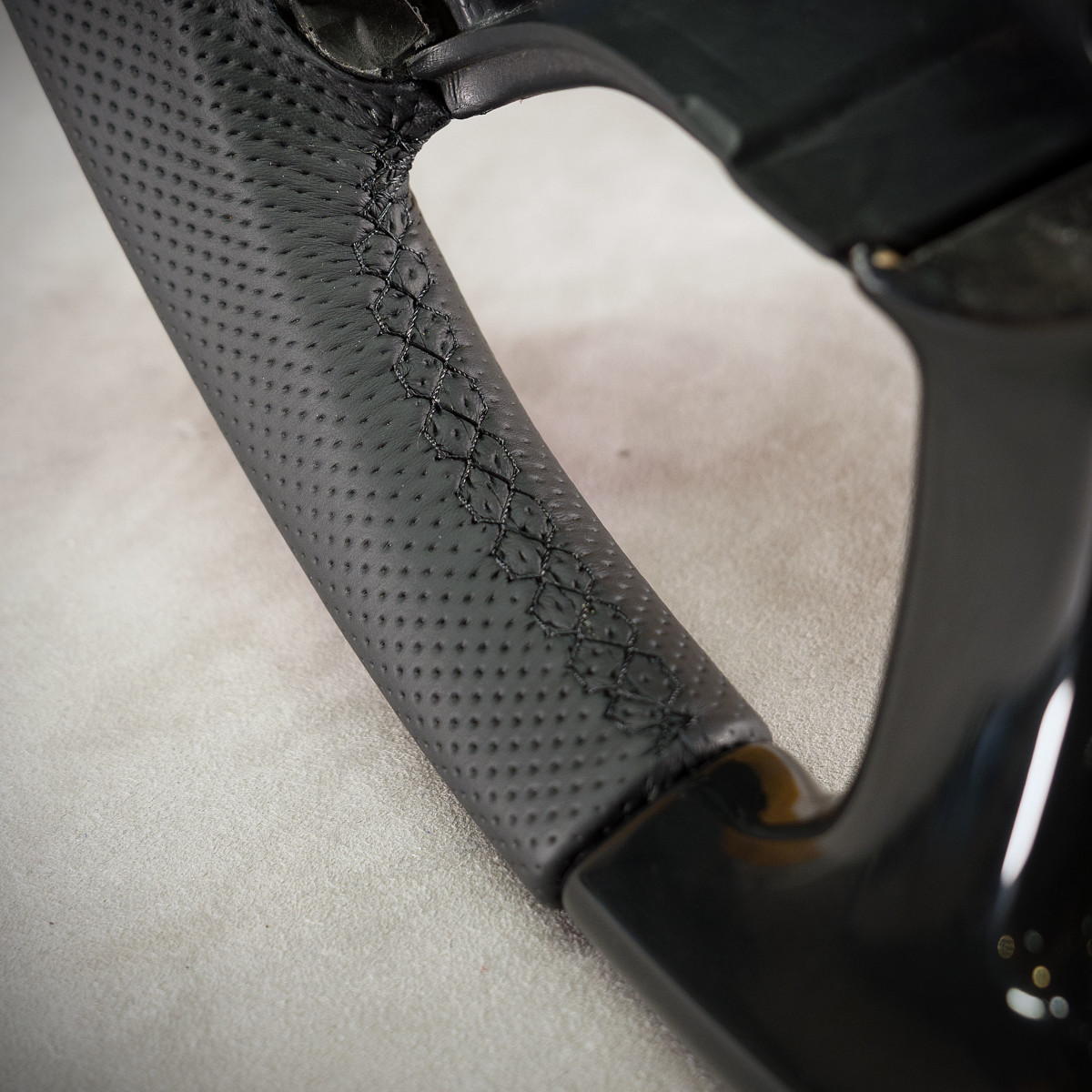 Kierownica Mercedes-Benz W221 z elementami drewna nabrała świeżego wyglądu. Kierownica została na nowo obszyta skórą gładką perforowaną. Perforacja, czyli dziurki, nie są wykonane na wylot a jedynie wytłoczone w skórze. To nadaje komfort trzymania. Zastosowany szew seryjny to najczęstszy wybór naszych klientów.