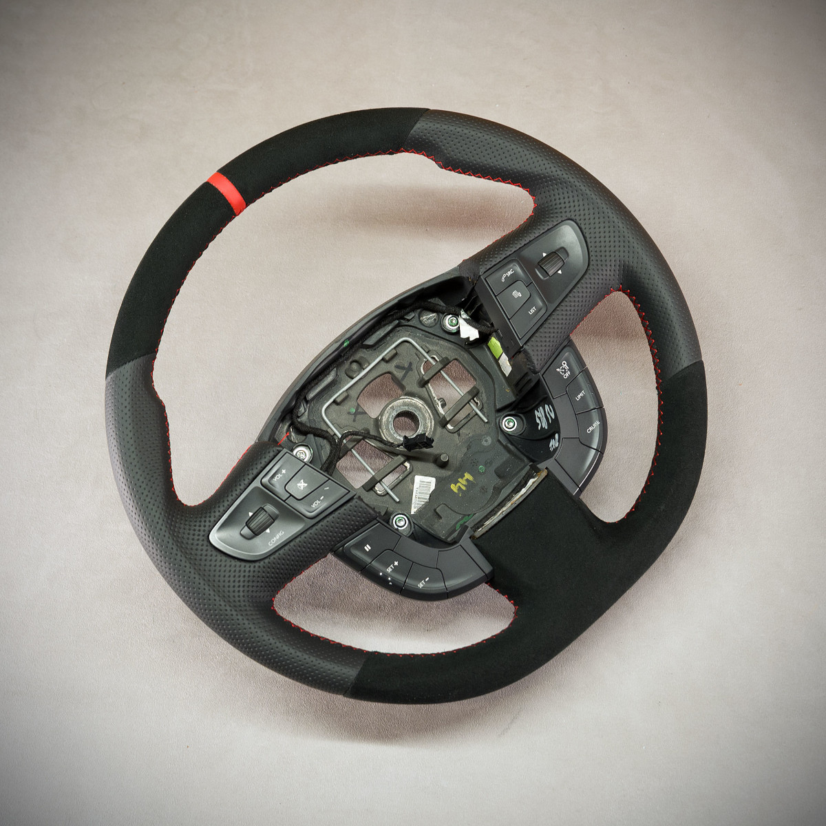 Kierownica Peugeot 508 obszyta Alcantarą® oraz skórą perforowaną. Są to materiały najlepszego gatunku stosowane w motoryzacji. Alcantara® jest bardzo elegancka i miła w dotyku. Skóra perforowana jest zalecana na boki kierownicy. Perforacja, czyli dziurki, nie są wykonane na wylot a jedynie wytłoczone w skórze. To nadaje komfort trzymania.