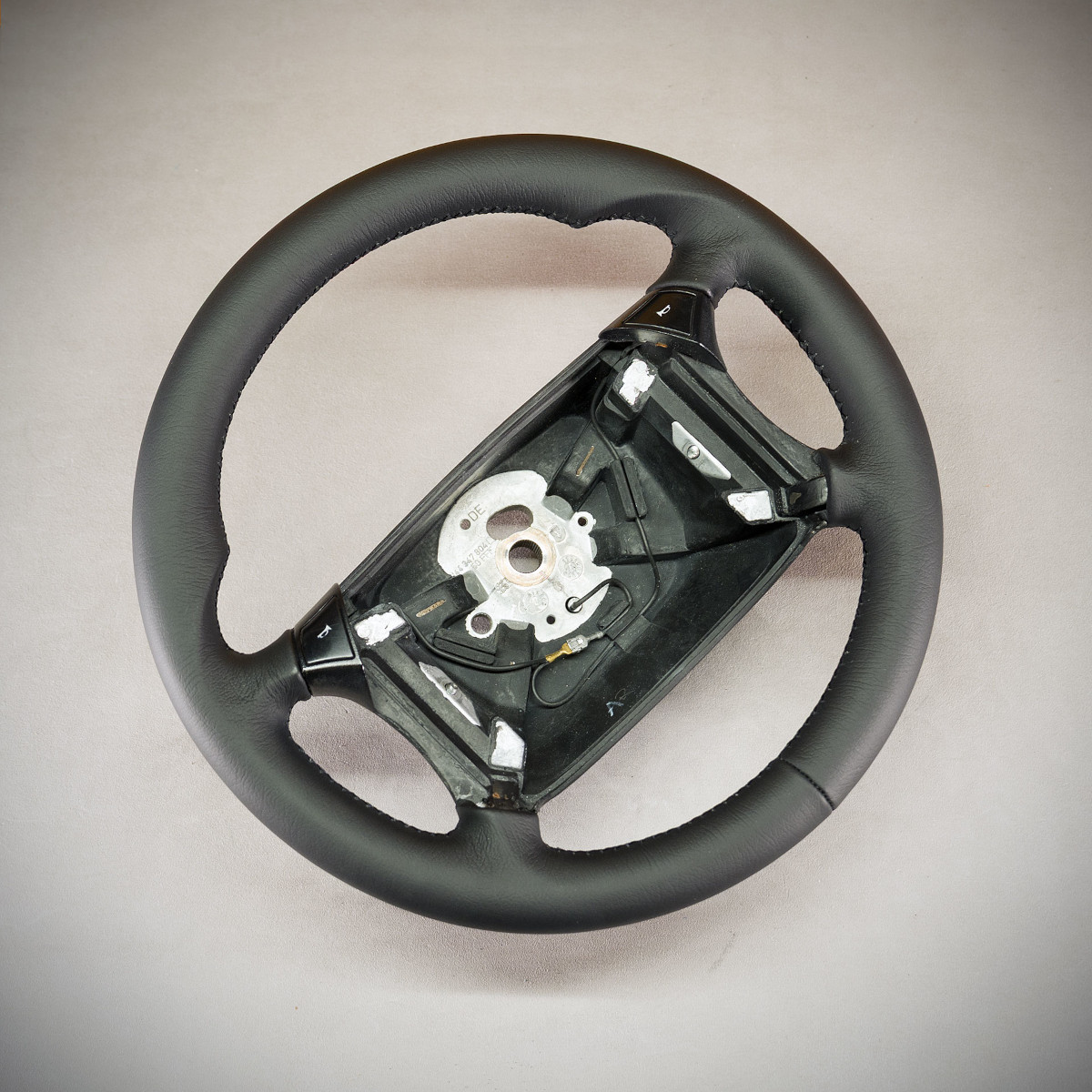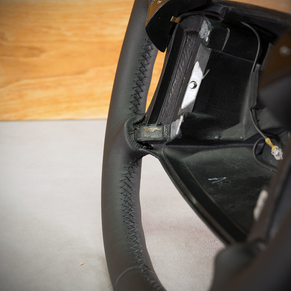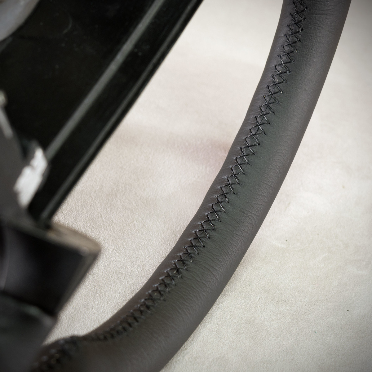 Odnowienie kierownicy Porsche 944 wraz z modyfikacją. Kierownica obszyta skórą ze strukturą. Jest to jedna z najlepszych skór dostępnych na rynku europejskim stosowana w motoryzacji. Skóra ta zapewnia bardzo przyjemny dotyk, jak i niezwykłą trwałość. Zastosowany szew performance to jeden z najpiękniejszych szwów, którym można ozdobić kierownicę, wykonany ręcznie w skomplikowanym procesie. Dodatkowo do tego szwu stosuje się grubszą nić, co zapewnia jego większą trwałość.