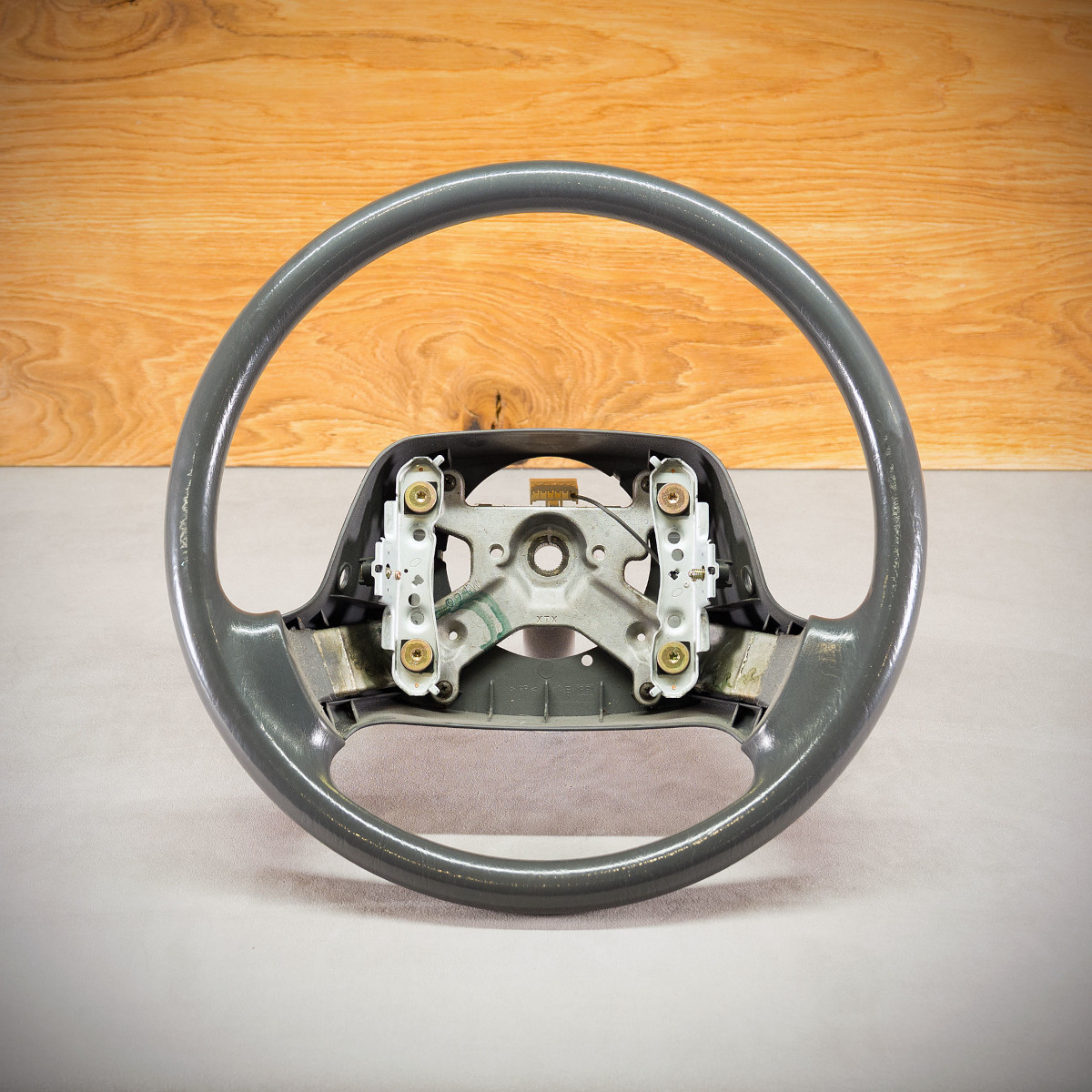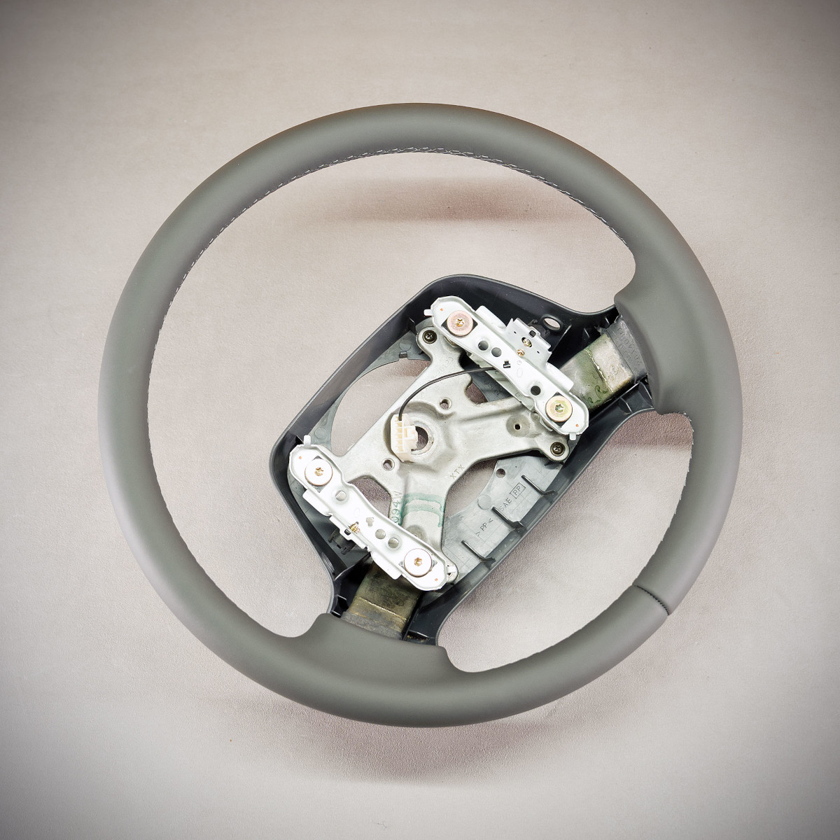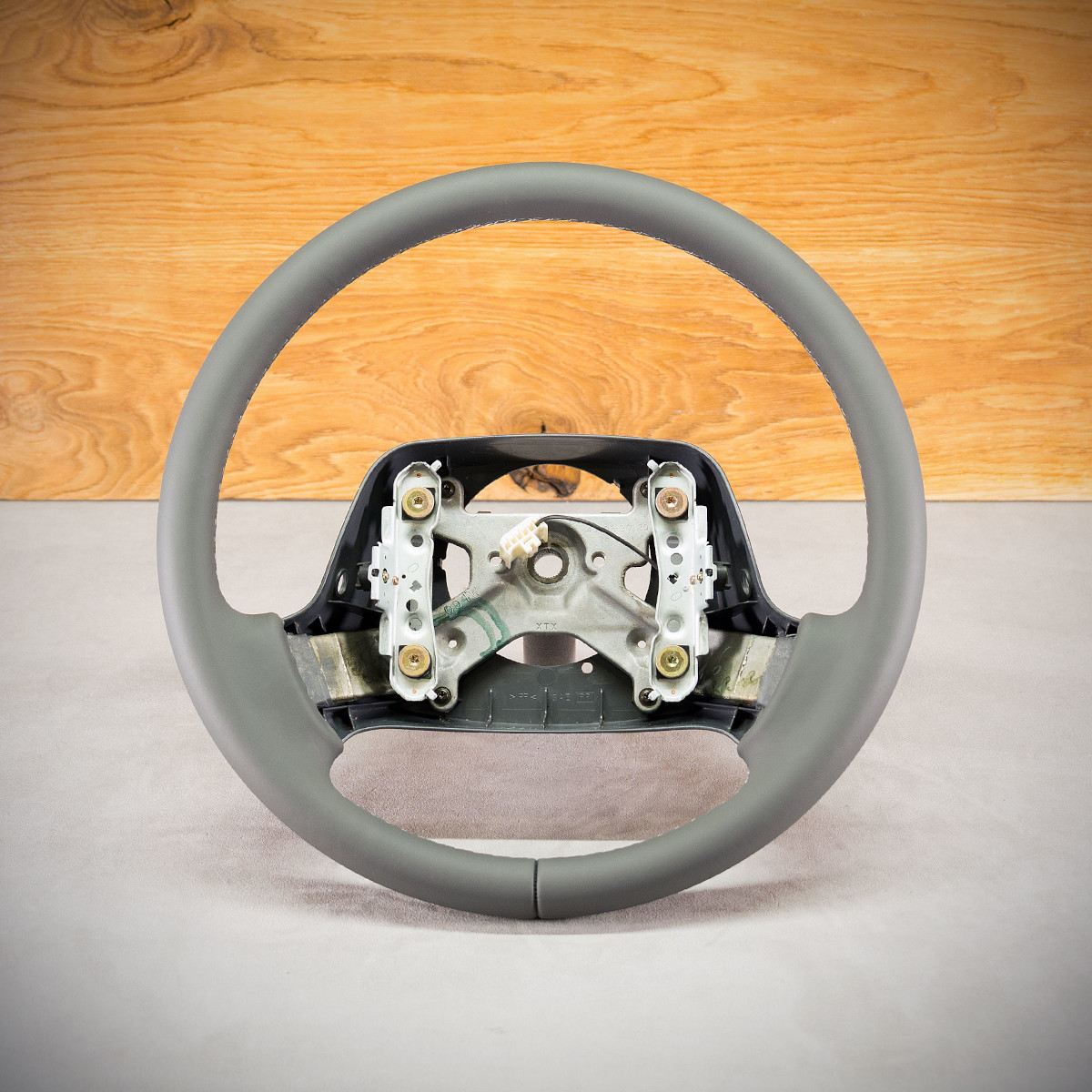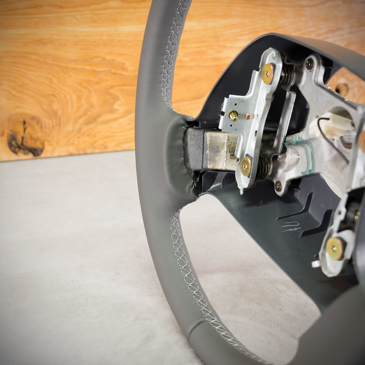 Obszycie kierownicy Toyota Hiace skórą w kolorze grafitowym. Kierownica obszyta skórą gładką. Jest to skóra najlepszego gatunku z dostępnych na rynku europejskim. Skóra gładka zapewnia bardzo przyjemny dotyk, jak i niezwykłą trwałość. Zastosowany szew seryjny jest najczęściej wybieranym przez naszych klientów.