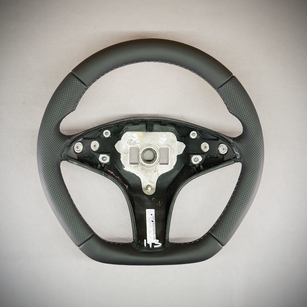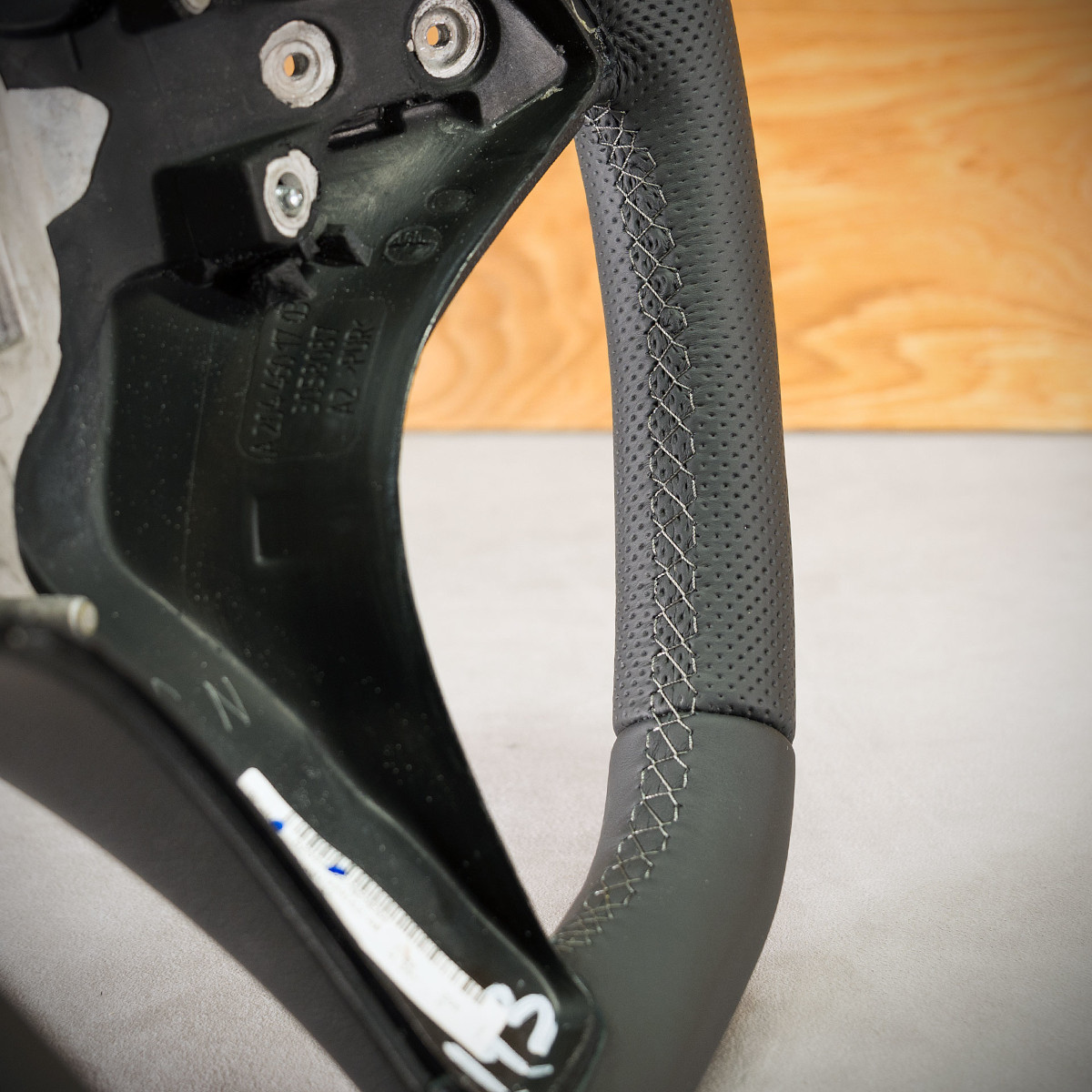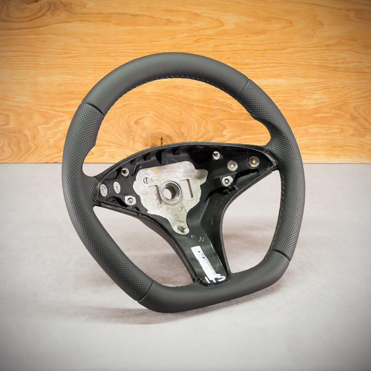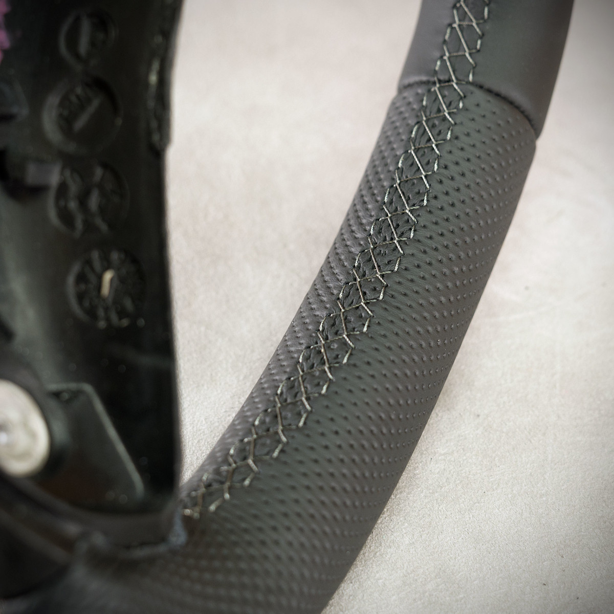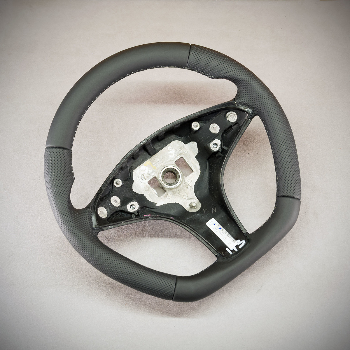 Bardzo wyraźny tuning kierownicy Mercedes-Benz poprzez połączenie modyfikacji oraz obszycia. Kierownica obszyta skórą gładką oraz perforowaną. Są to skóry najwyższej jakości dostępne na rynku europejskim. Skóra gładka zapewnia bardzo przyjemny dotyk, jak i niezwykłą trwałość. Skóra perforowana zalecana jest na boki kierownicy. Perforacja, czyli dziurki, nie są wykonane na wylot a jedynie wytłoczone w skórze.
