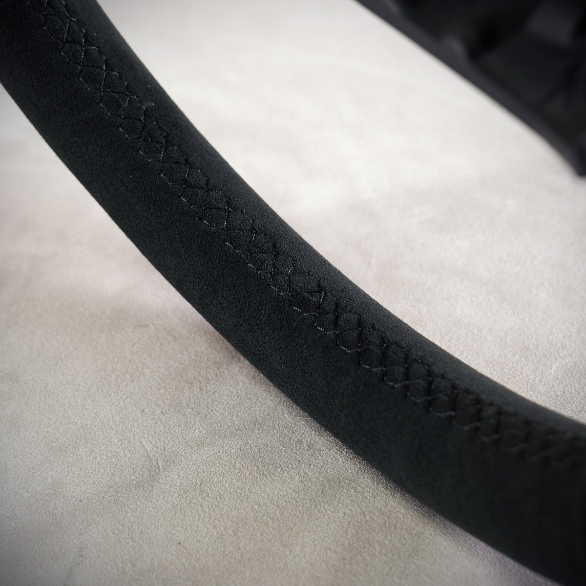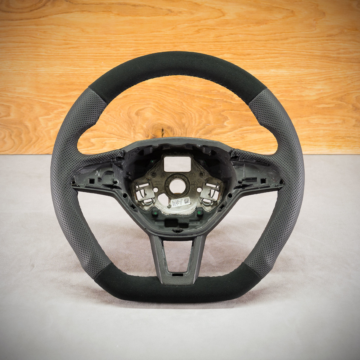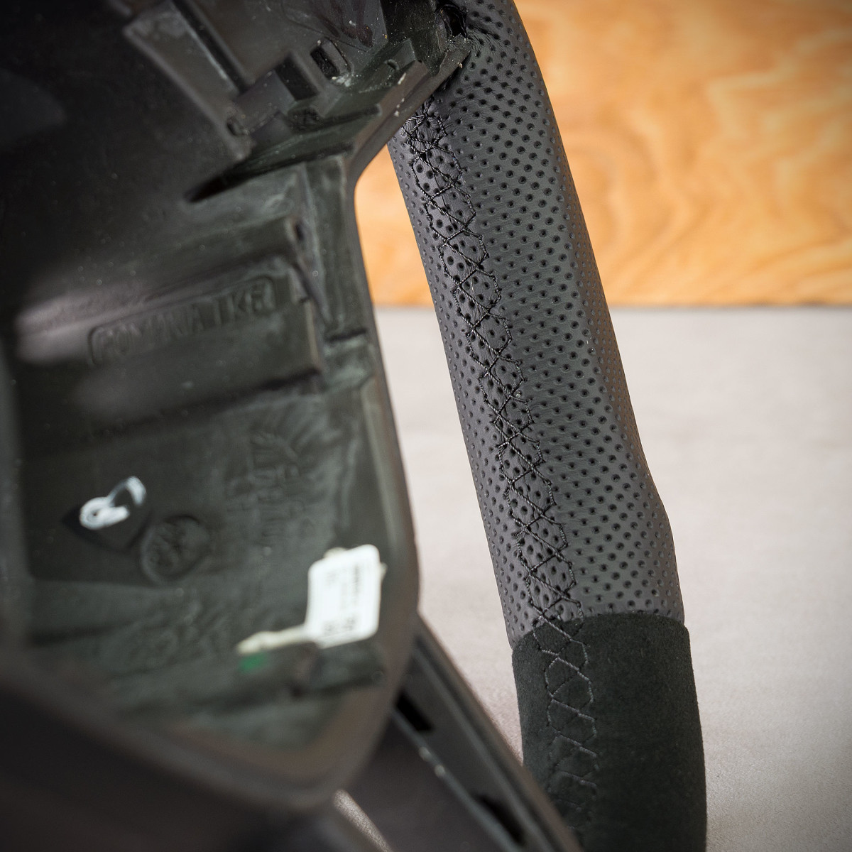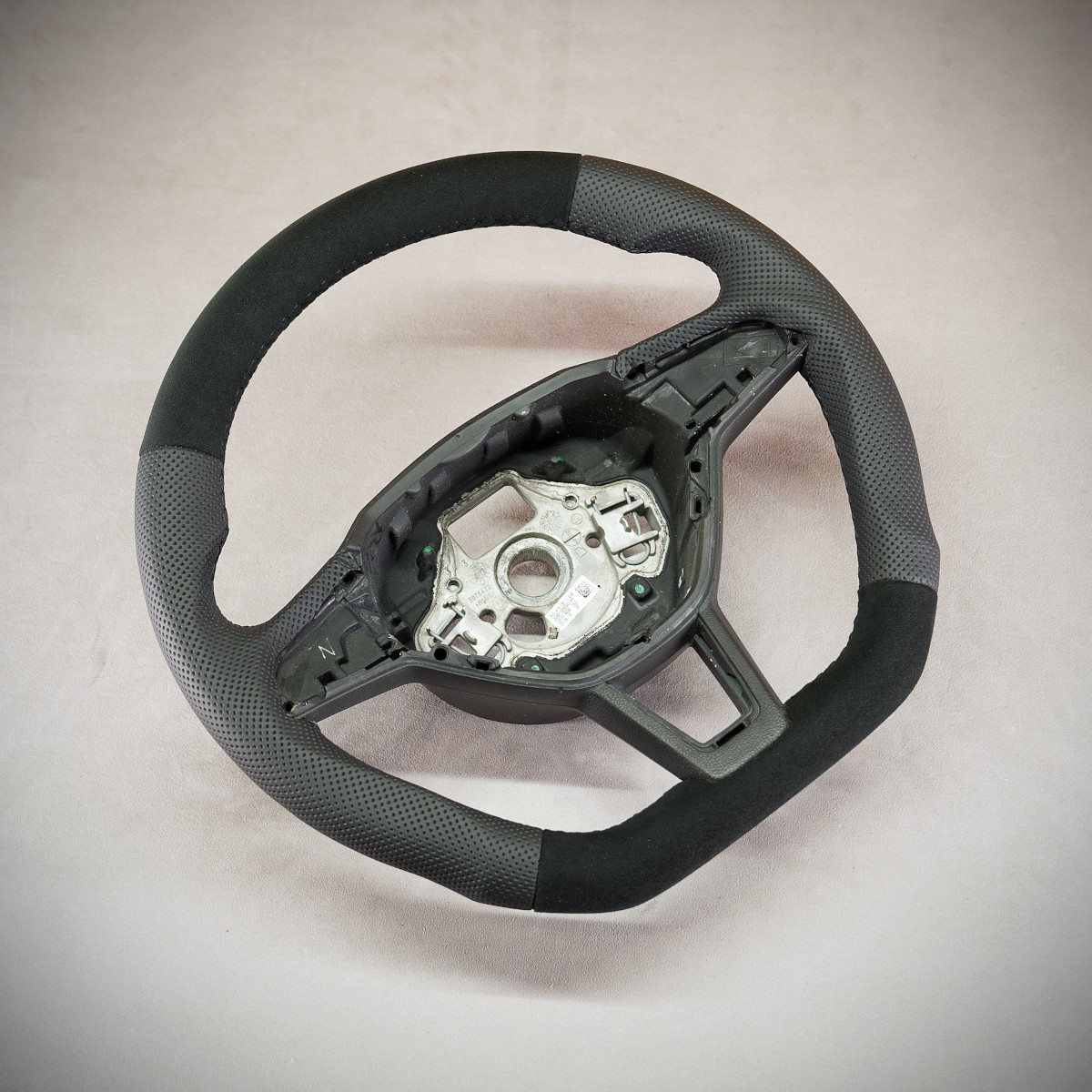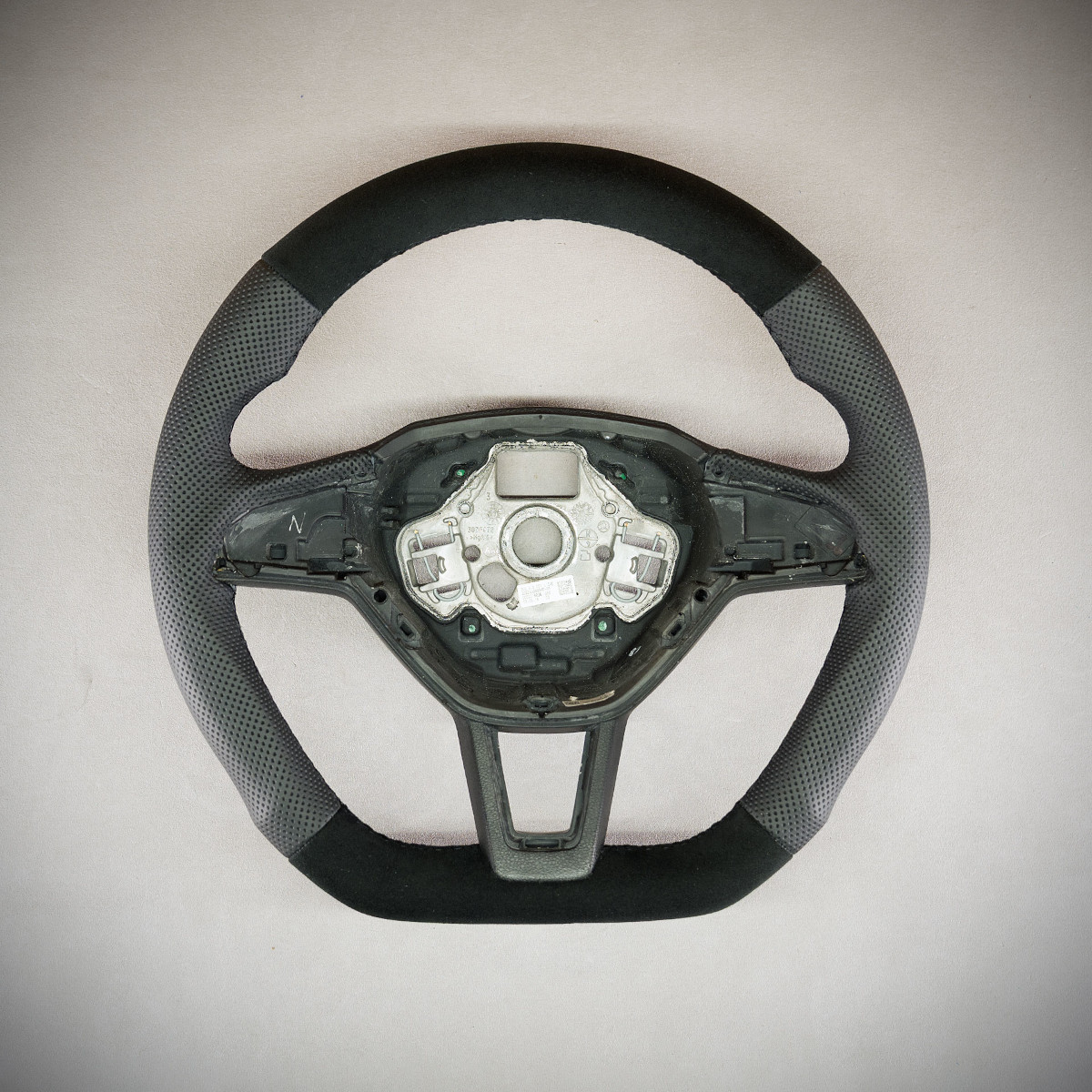 Bardzo wyraźny tuning kierownicy Skoda Octavia III poprzez połączenie modyfikacji oraz obszycia. Kierownica obszyta przepiękną Alcantarą® oraz skórą perforowaną. Są to materiały najlepszego gatunku stosowane w motoryzacji. Skóra perforowana jest zalecana na boki kierownicy. Perforacja, czyli dziurki, nie są wykonane na wylot a jedynie wytłoczone w skórze. To nadaje komfort trzymania.