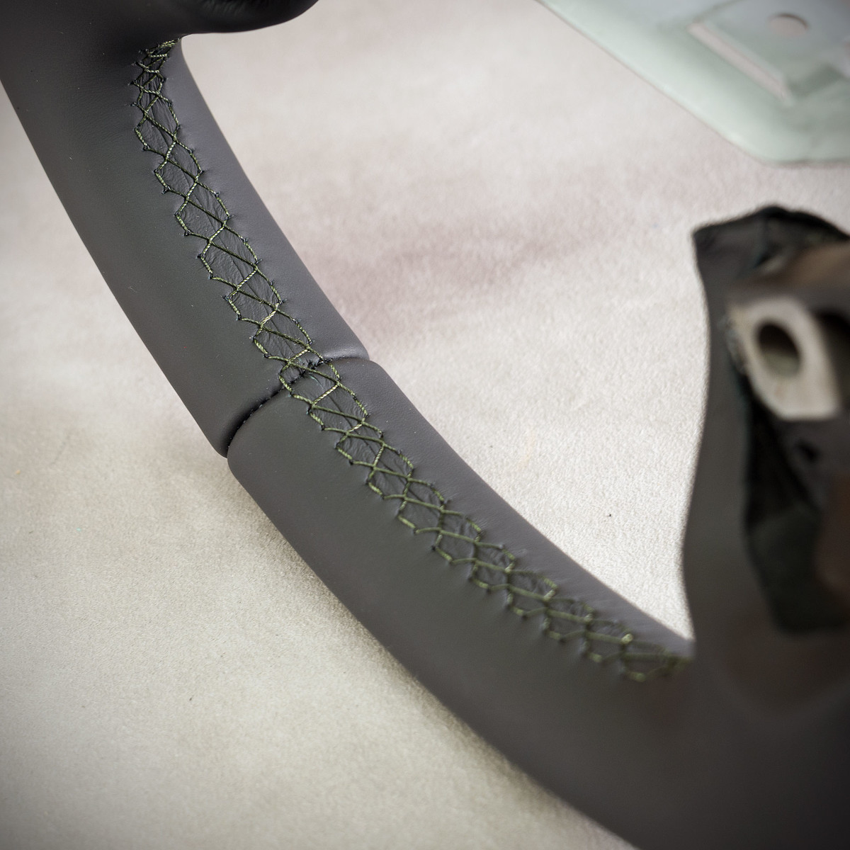 Tuning kierownicy Suzuki Grand Vitara. Kierownica została obszyta skórą gładką. Jest to najwyższej jakości skóra dostępna na rynku europejskim stosowana w motoryzacji. Skóra gładka Nappa zapewnia bardzo przyjemny dotyk, jak i doskonałą wytrwałość. Szew seryjny jest najczęściej wybierany przez naszych klientów.