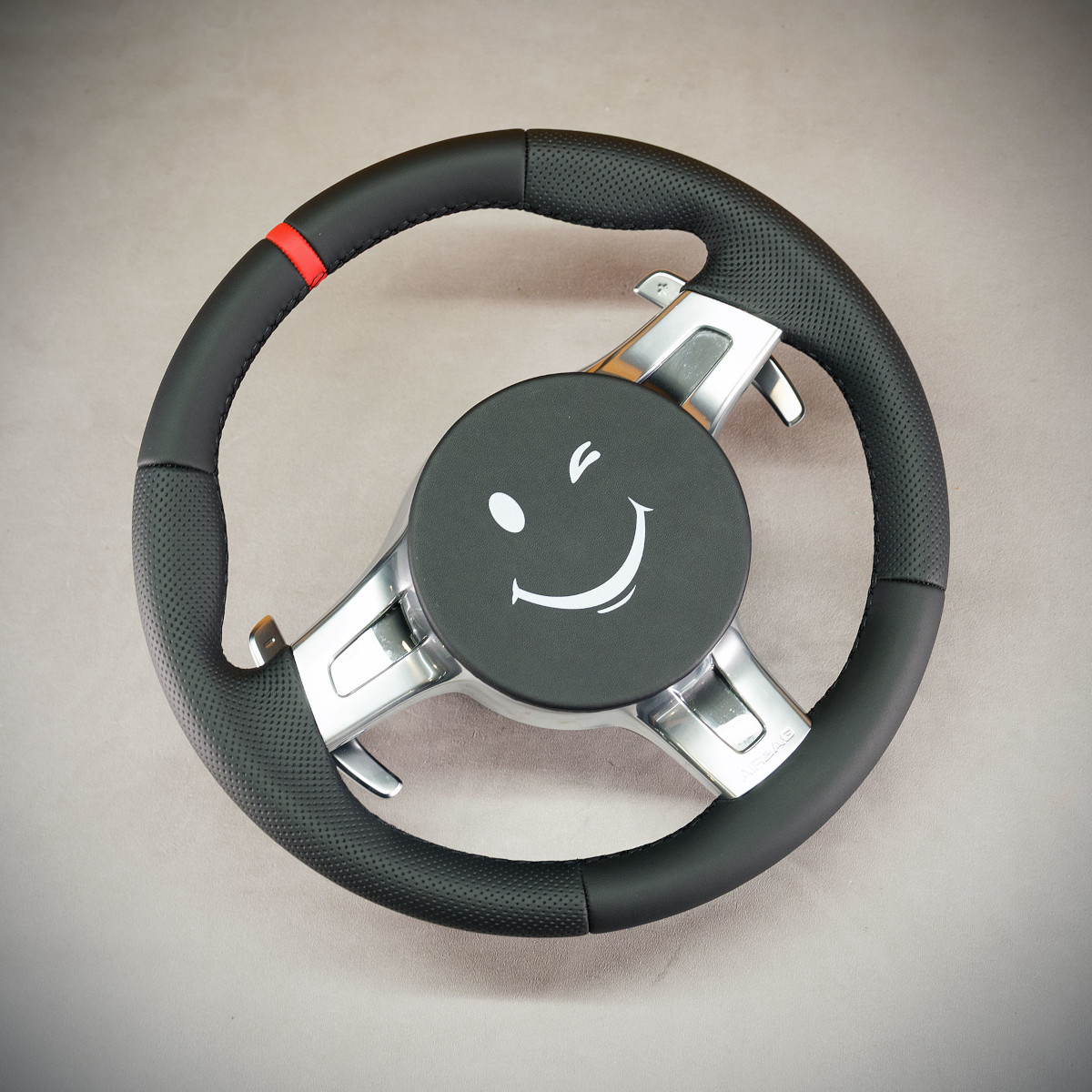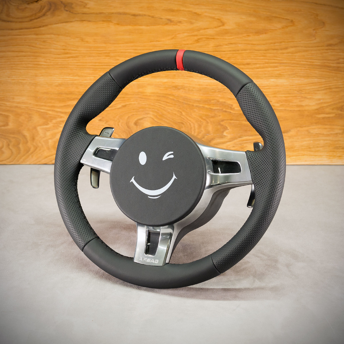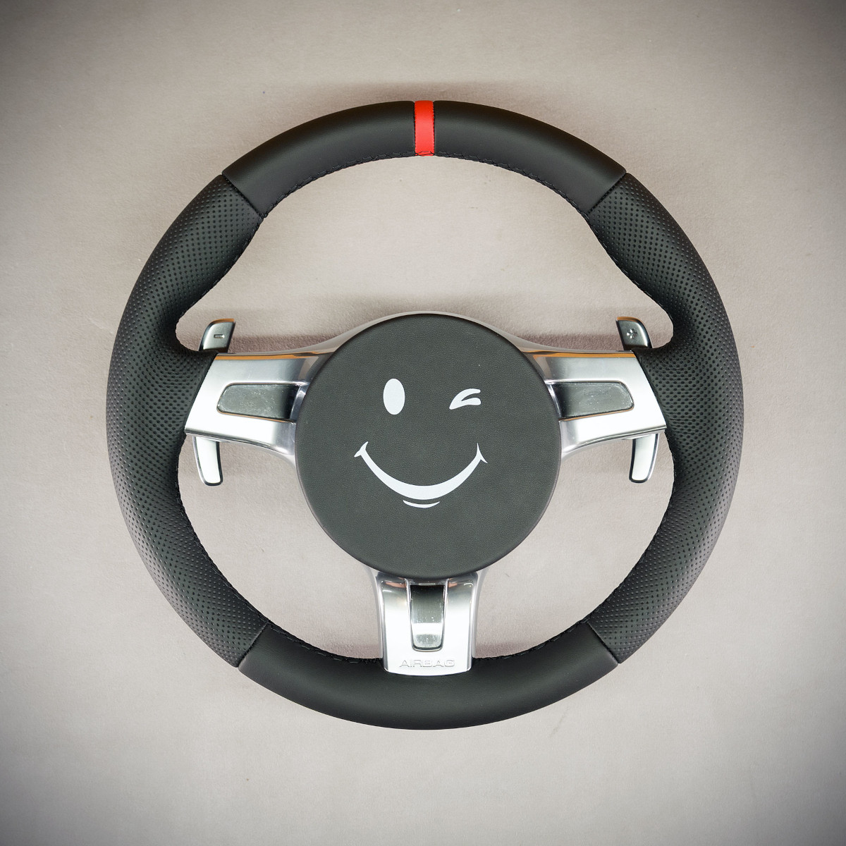Kierownica Volkswagen Porsche Cayman nabrała nowego wyglądu, została na nowo obszyta skórą gładką oraz perforowaną. Są to skóry najwyższej jakości z dostępnych na rynku europejskim. Skóra gładka zapewnia bardzo przyjemny dotyk, jak i niezwykłą trwałość. Skóra perforowana zalecana jest na boki kierownicy. Perforacja, czyli dziurki, nie są wykonane na wylot a jedynie wytłoczone w skórze. To nadaje komfort trzymania.
