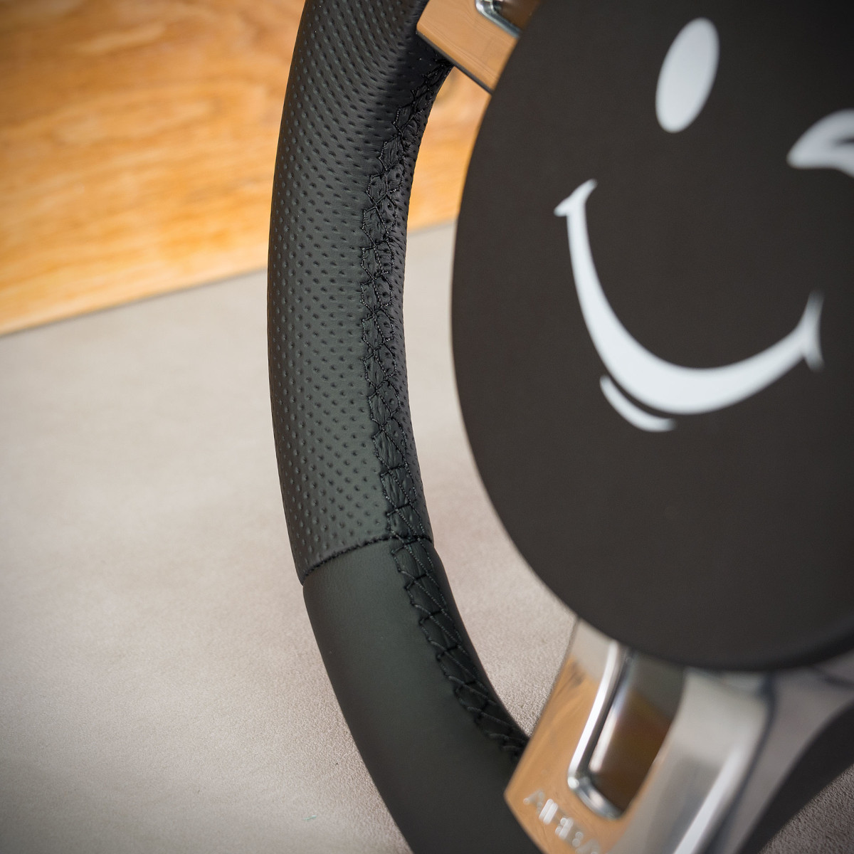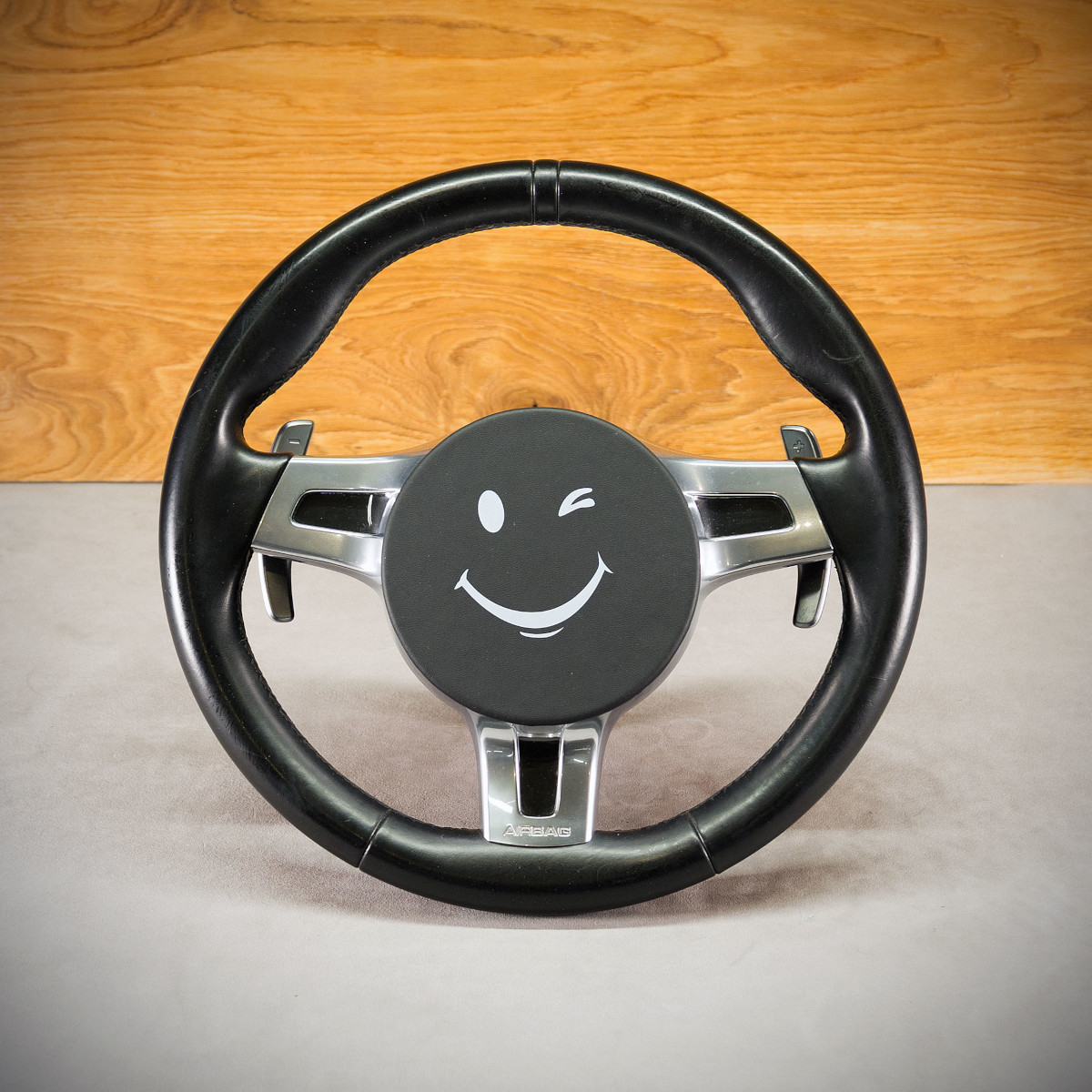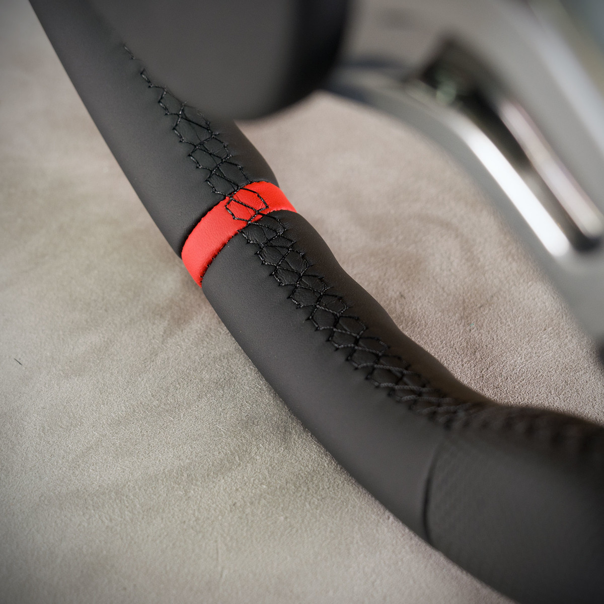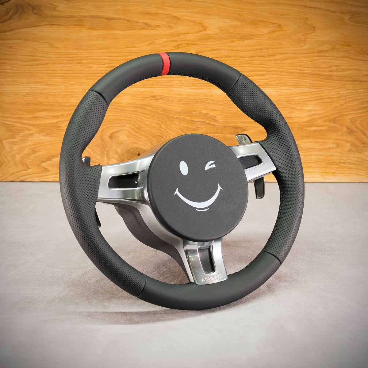 Kierownica Volkswagen Porsche Cayman nabrała nowego wyglądu, została na nowo obszyta skórą gładką oraz perforowaną. Są to skóry najwyższej jakości z dostępnych na rynku europejskim. Skóra gładka zapewnia bardzo przyjemny dotyk, jak i niezwykłą trwałość. Skóra perforowana zalecana jest na boki kierownicy. Perforacja, czyli dziurki, nie są wykonane na wylot a jedynie wytłoczone w skórze. To nadaje komfort trzymania.