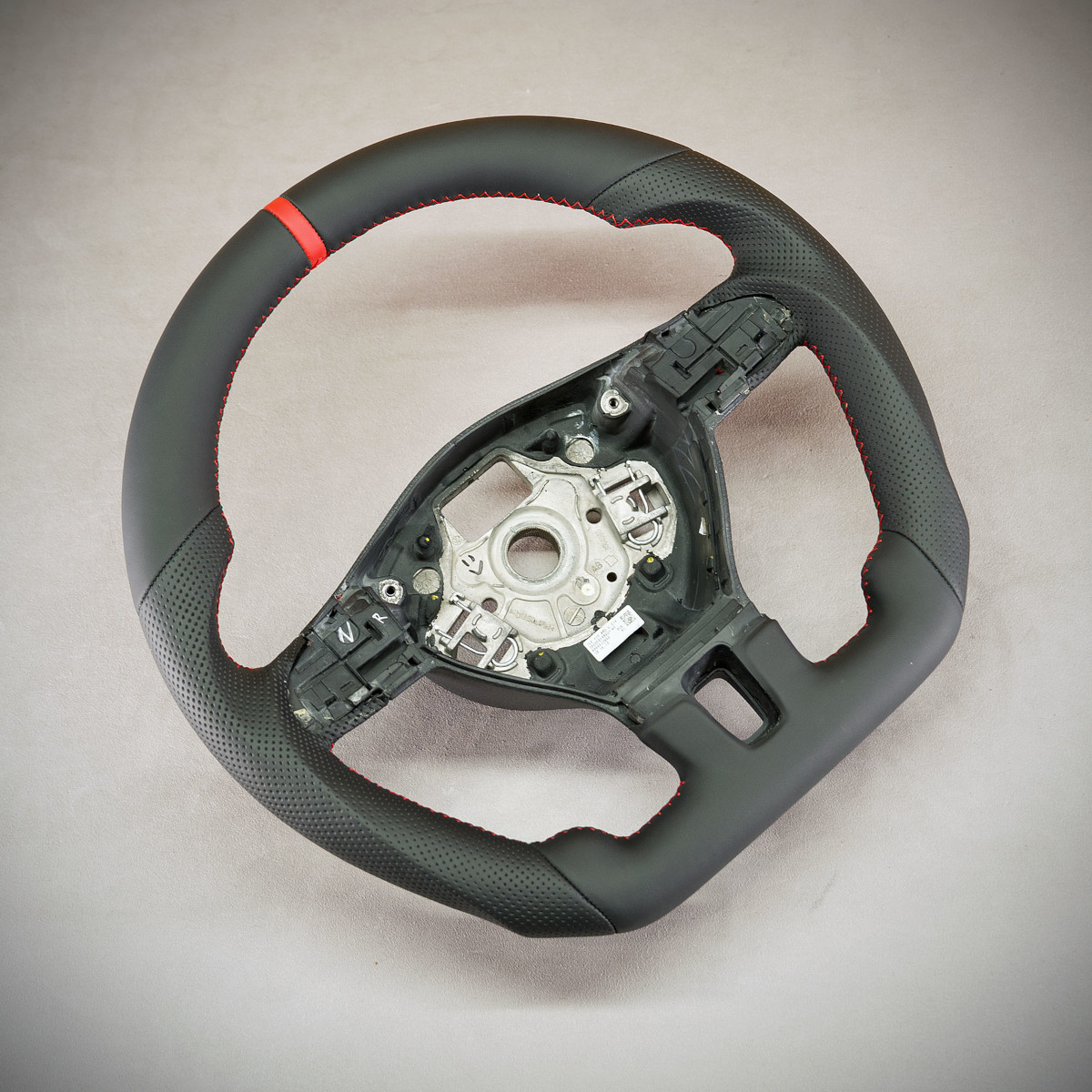 Bardzo wyraźny tuning kierownicy Volkswagen Transporter T6 poprzez połączenie modyfikacji oraz obszycia. Kierownica obszyta skórą gładką oraz perforowaną. Są to skóry najlepszego gatunku dostępne na rynku europejskim. Skóra gładka zapewnia bardzo przyjemny dotyk, jak i niezwykłą trwałość. Skóra perforowana zalecana jest na boki kierownicy. Perforacja, czyli dziurki, nie są wykonane na wylot a jedynie wytłoczone w skórze. To nadaje komfort trzymania. Szew performance oraz pasek centrujący to akcenty kolorystyczne, które dodają charakteru.