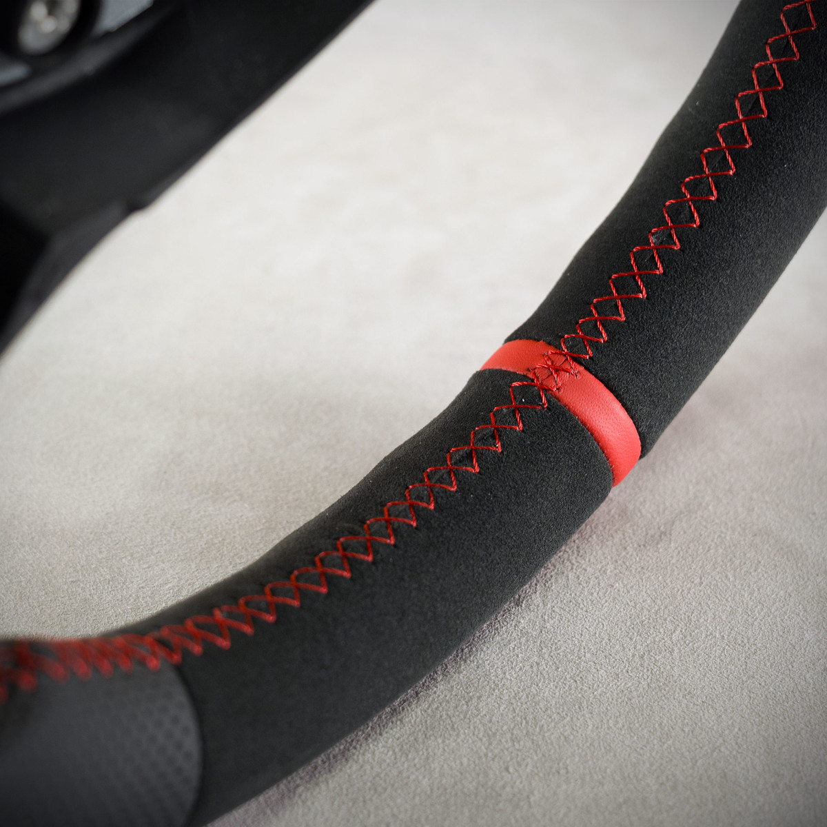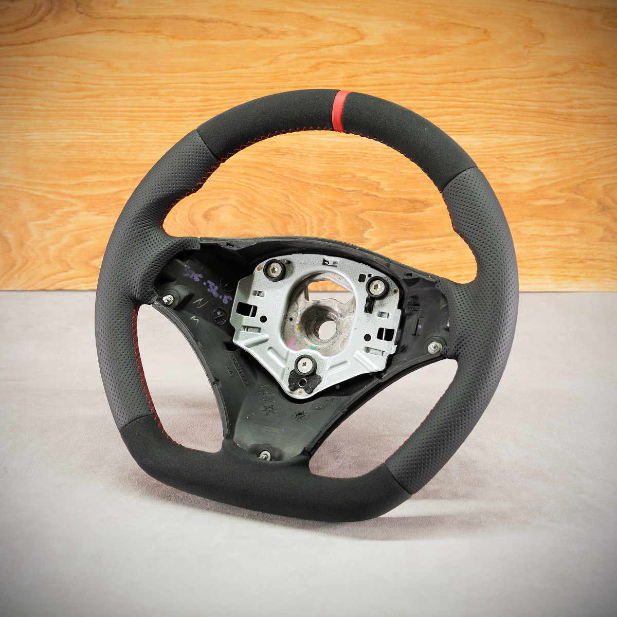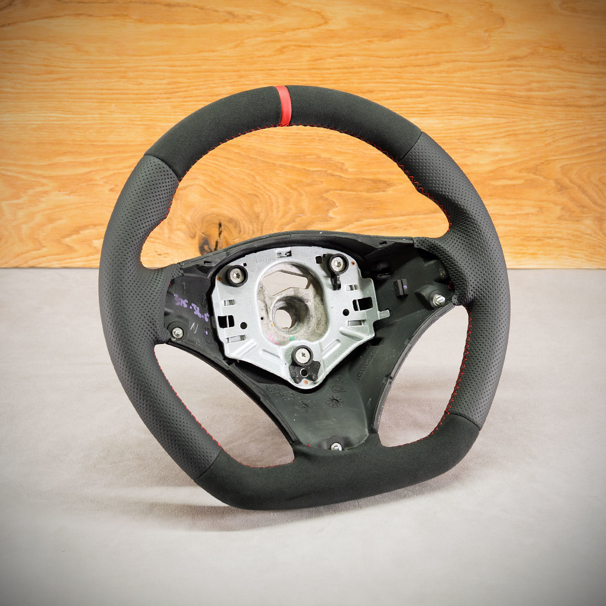 Bardzo wyraźny tuning kierownicy BMW E90 poprzez połączenie modyfikacji oraz obszycia. Kierownica obszyta Alcantarą® oraz skórą perforowaną. Są to materiały najlepszego gatunku dostępne na rynku europejskim. Alcantara® jest materiałem niezwykle efektownym. Skóra perforowana jest zalecana na boki kierownicy. Perforacja, czyli dziurki, nie są wykonane na wylot a jedynie wytłoczone w skórze. To nadaje komfort trzymania. Zastosowany szew performance jest uznawany za jeden z najpiękniejszych szwów, którym można ozdobić kierownicę. Wykonany jest ręcznie w skomplikowanym procesie. Z paskiem centrującym komponuje się znakomicie.