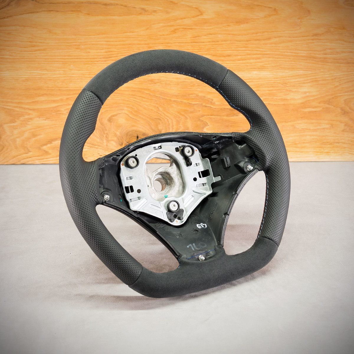 Bardzo wyraźny tuning kierownicy BMW E90 poprzez połączenie modyfikacji oraz obszycia. Kierownica obszyta Alcantarą® oraz skórą perforowaną. Są to materiały do obszywania kierownic najwyższego gatunku. Alcantara® jest niezwykle modna, elegancka i przyjemna w dotyku. Skóra perforowana jest zalecana na boki kierownicy. Perforacja, czyli dziurki, nie są wykonane na wylot a jedynie wytłoczone w skórze. To nadaje komfort trzymania.