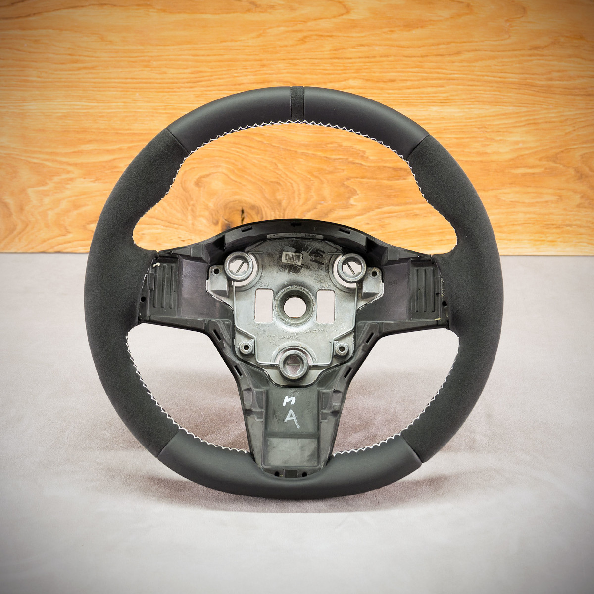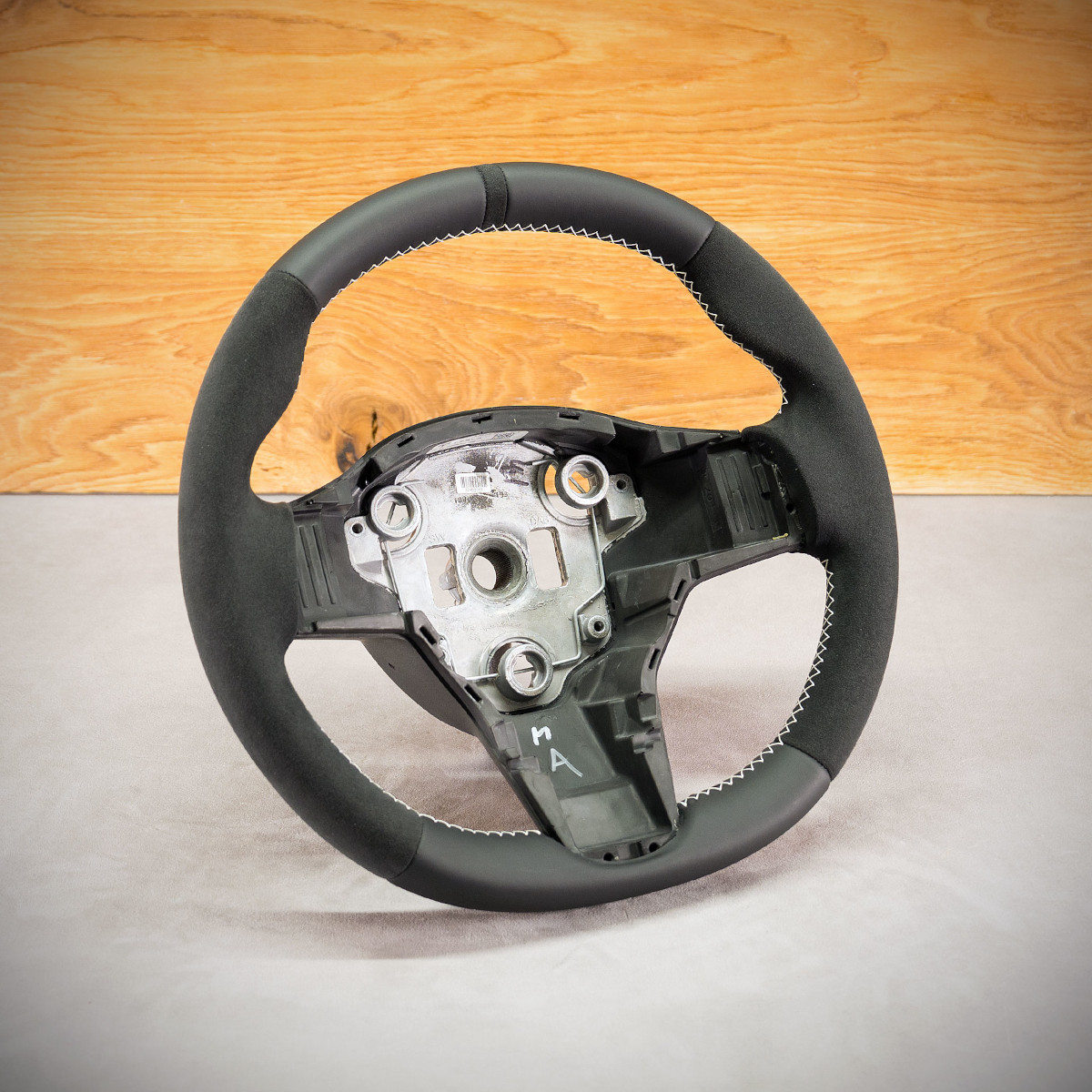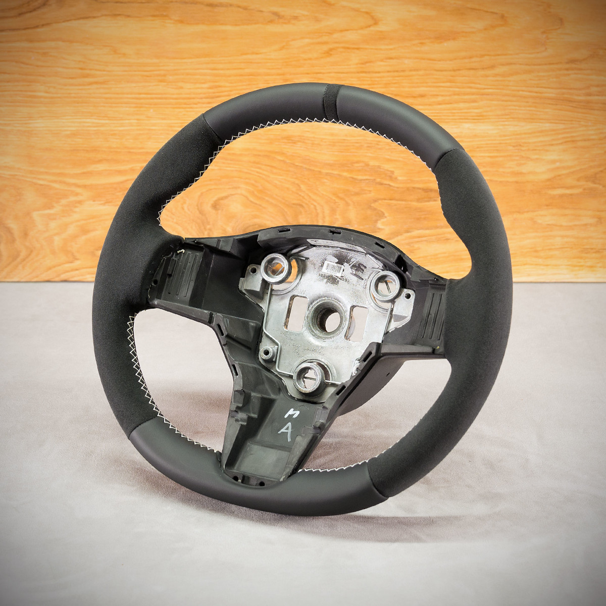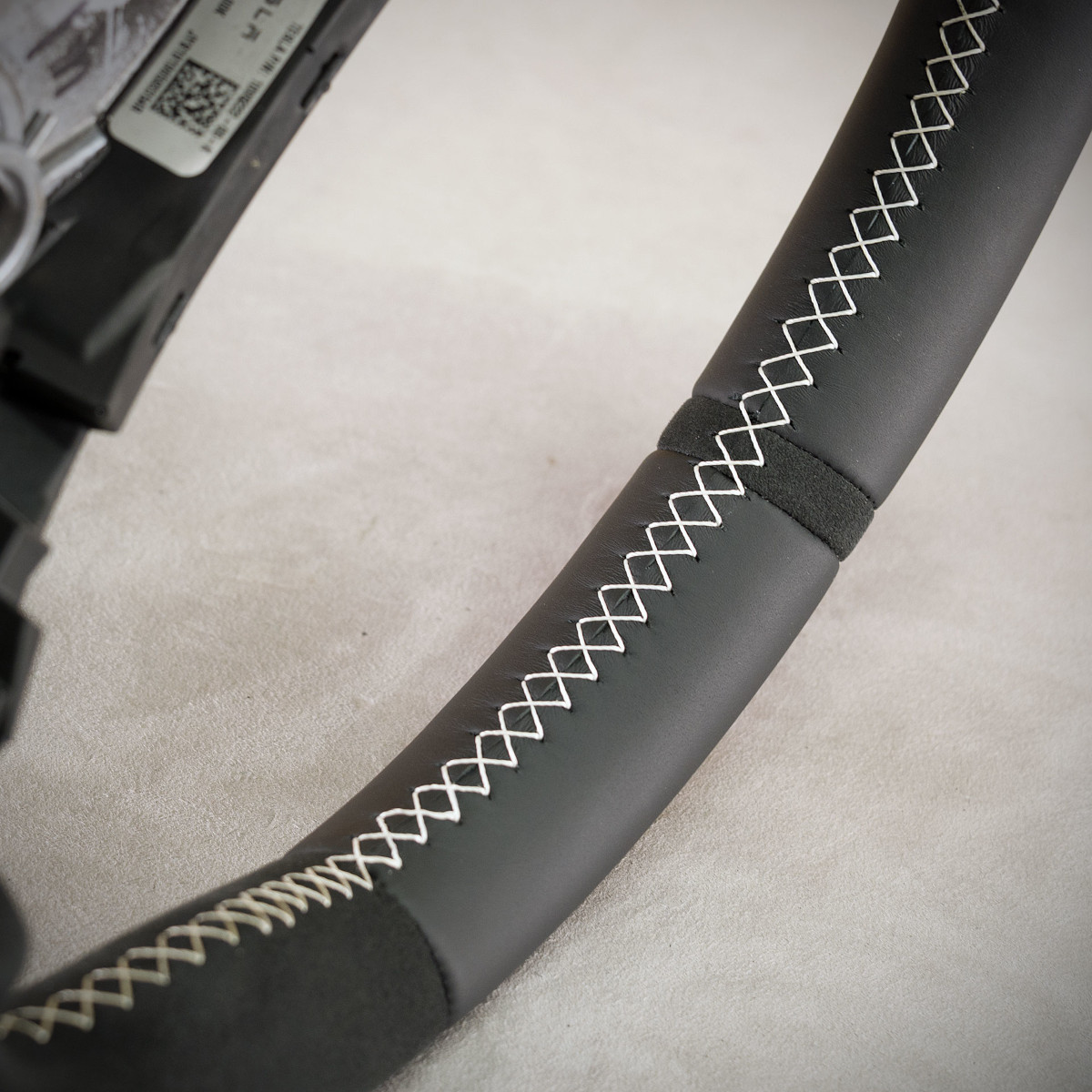 Kierownica Tesla nabrała zupełnie nowego wyglądu, została na nowo obszyta Alcantarą® oraz skórą gładką. Są to materiały najwyższej jakości dostępne na rynku europejskim. Alcantara® jest niezwykle elegancka. Zastosowany szew performance jest uznawany za jeden z najpiękniejszych szwów, którym można ozdobić kierownicę. Szew wykonany jest ręcznie w skomplikowanym procesie.
