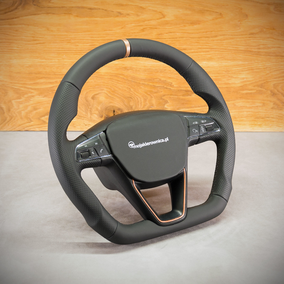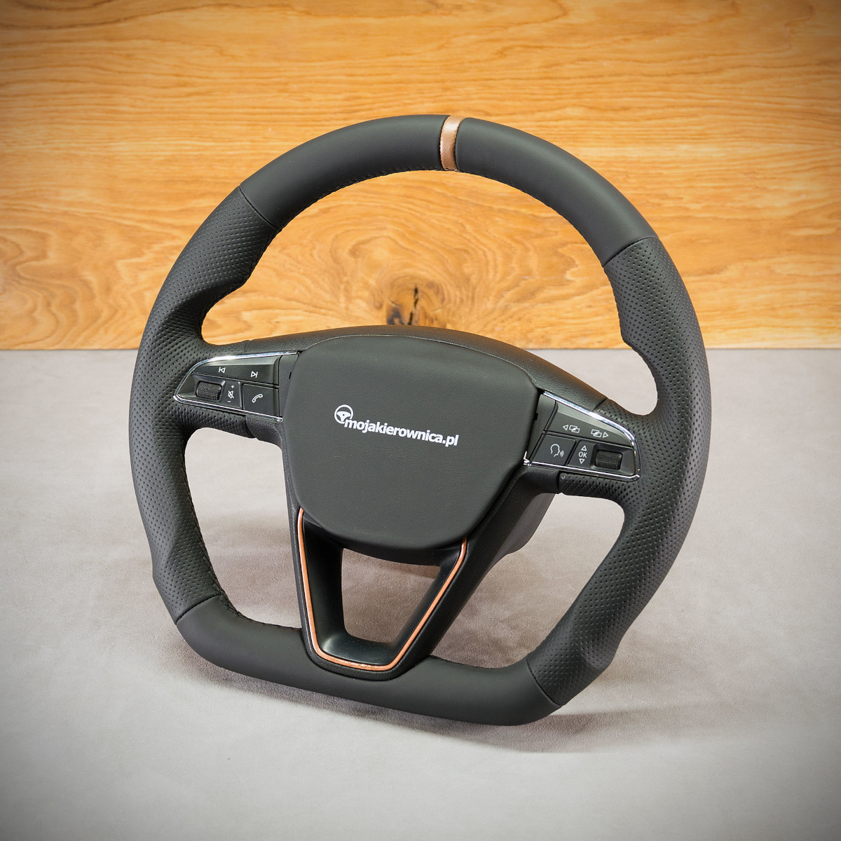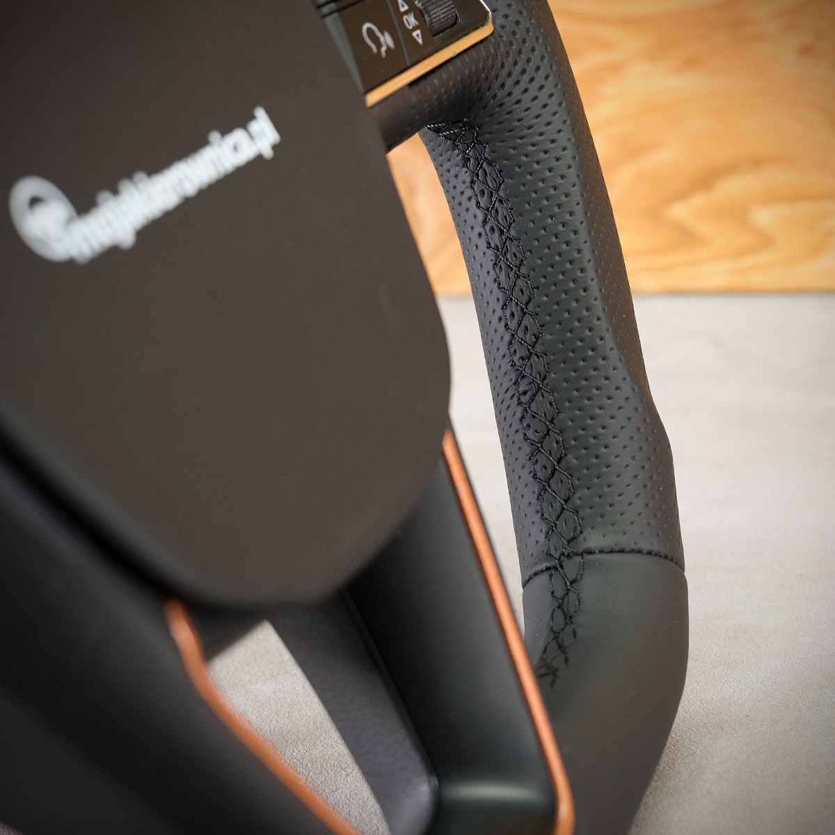 Bardzo wyraźny tuning kierownicy Seat Leon III poprzez połączenie modyfikacji oraz obszycia. Kierownica obszyta skórą gładką oraz perforowaną. Są to skóry najlepszego gatunku dostępne na rynku europejskim. Skóra gładka zapewnia bardzo przyjemny dotyk, jak i niezwykłą trwałość. Skóra perforowana zalecana jest na boki kierownicy. Perforacja, czyli dziurki, nie są wykonane na wylot a jedynie wytłoczone w skórze. To nadaje komfort trzymania.