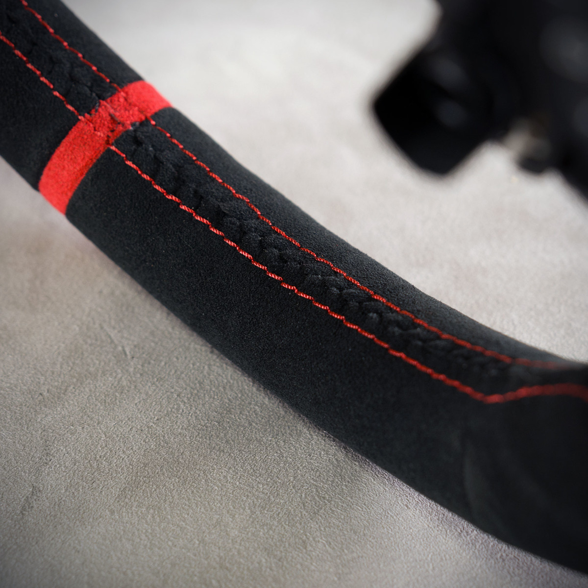 Kierownica obszyta Alcantarą®. Jest to materiał najlepszego gatunku stosowany w motoryzacji. Alcantara® jest bardzo elegancka i miła w dotyku. Szew RS jest często wybierany przez naszych klientów, w czerwonym ładnie komponuje się z paskiem centrującym.